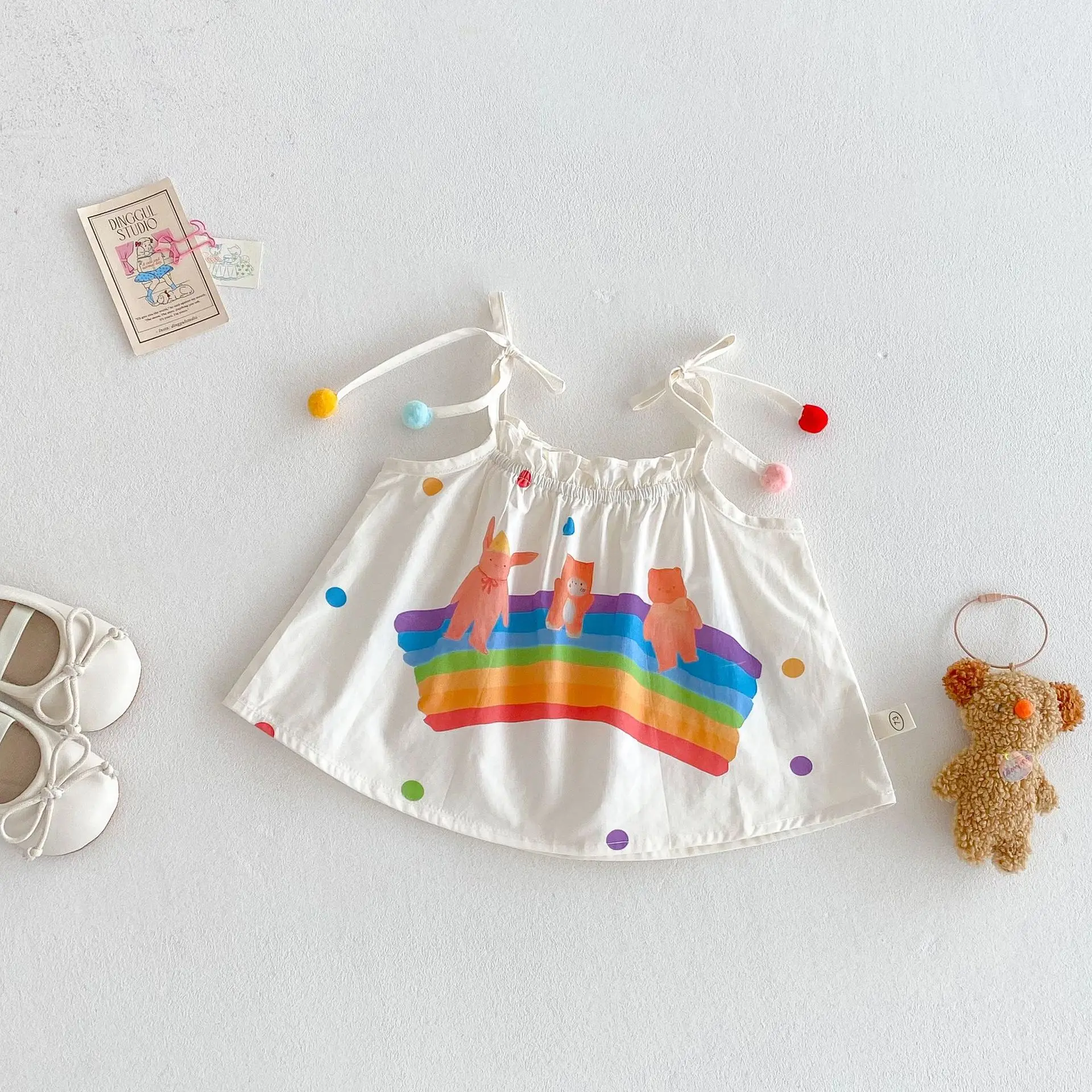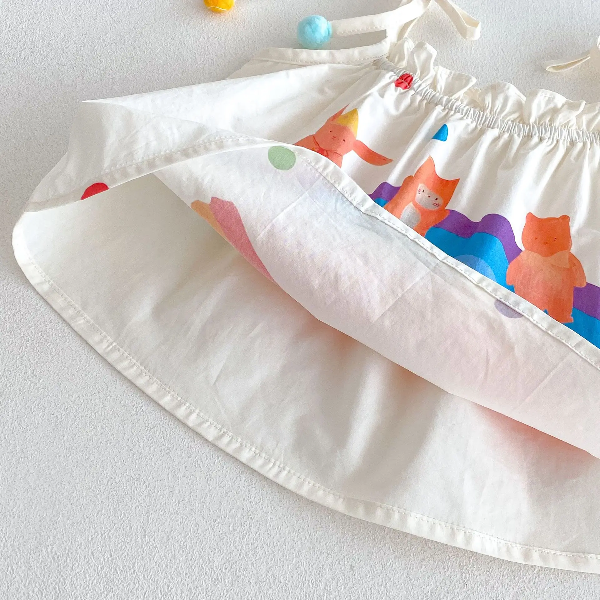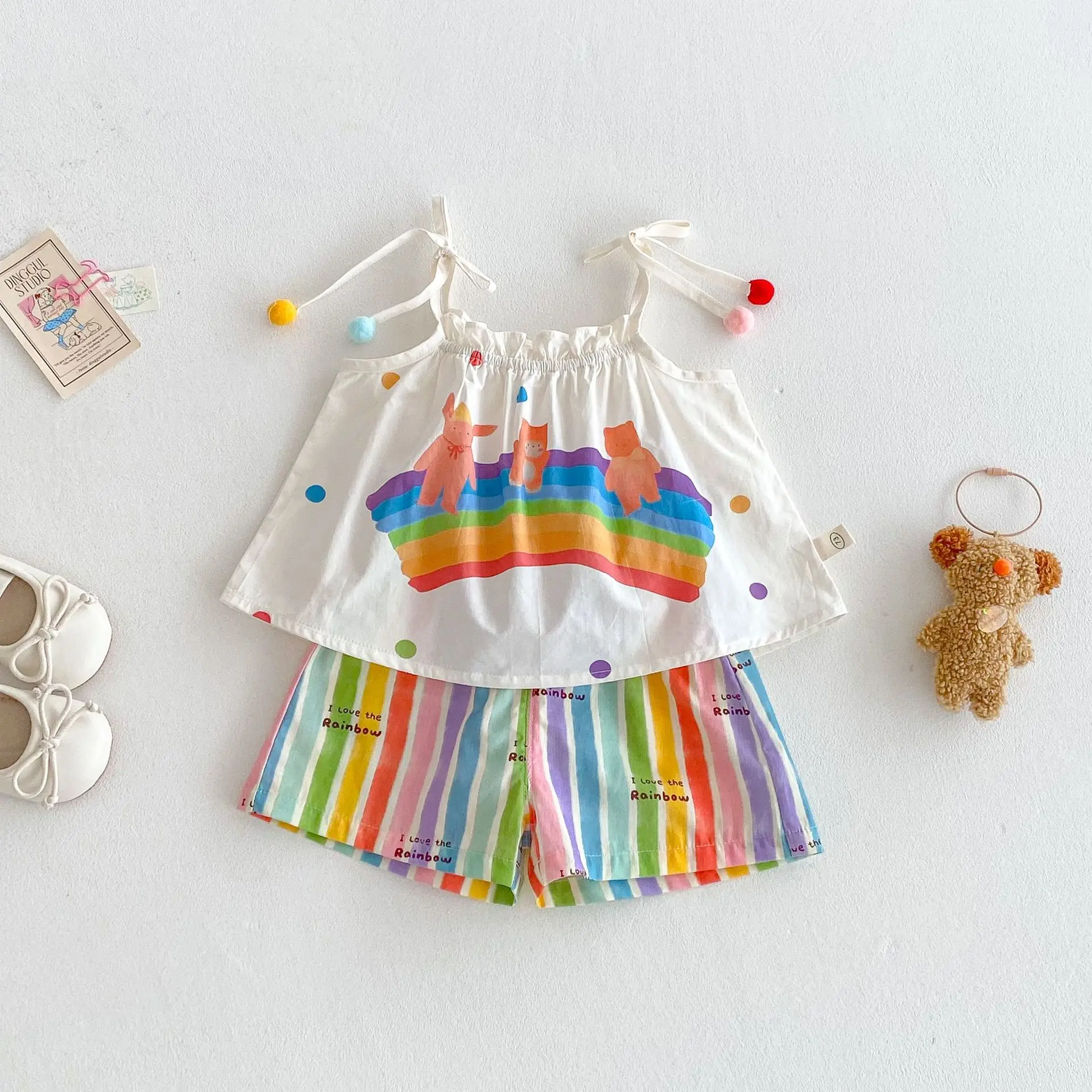 Este conjunto presenta un lindo top halter estampado de dibujos animados con divertidos pompones en las correas, lo que agrega un toque caprichoso.Combinado con pantalones cortos a rayas, es una combinación perfecta de diversión y moda.