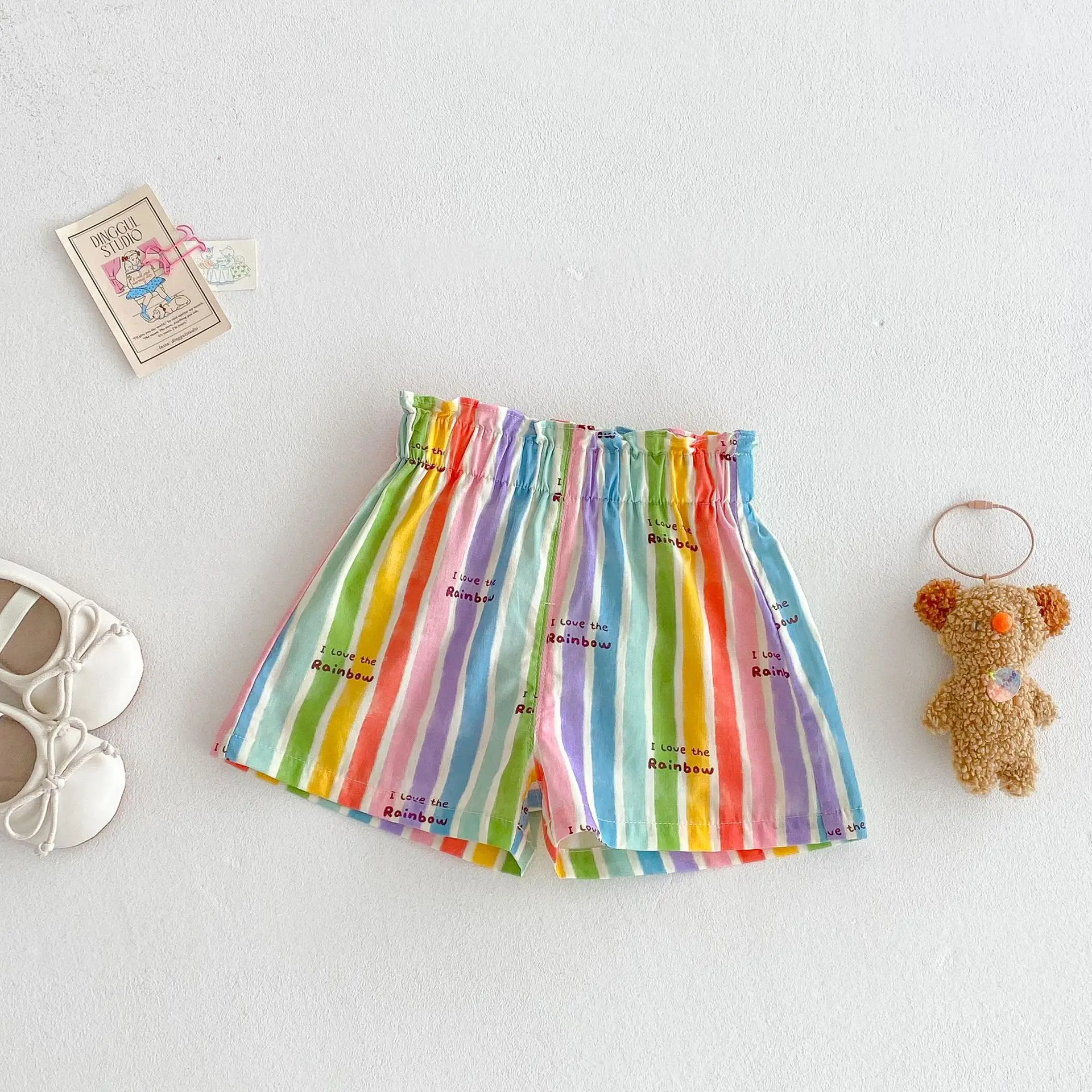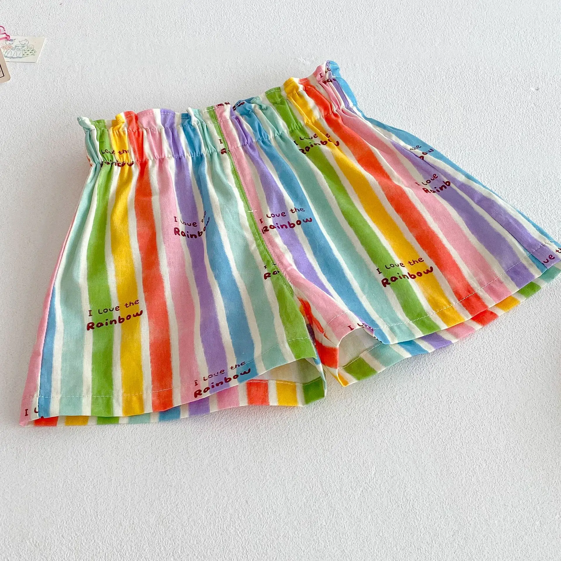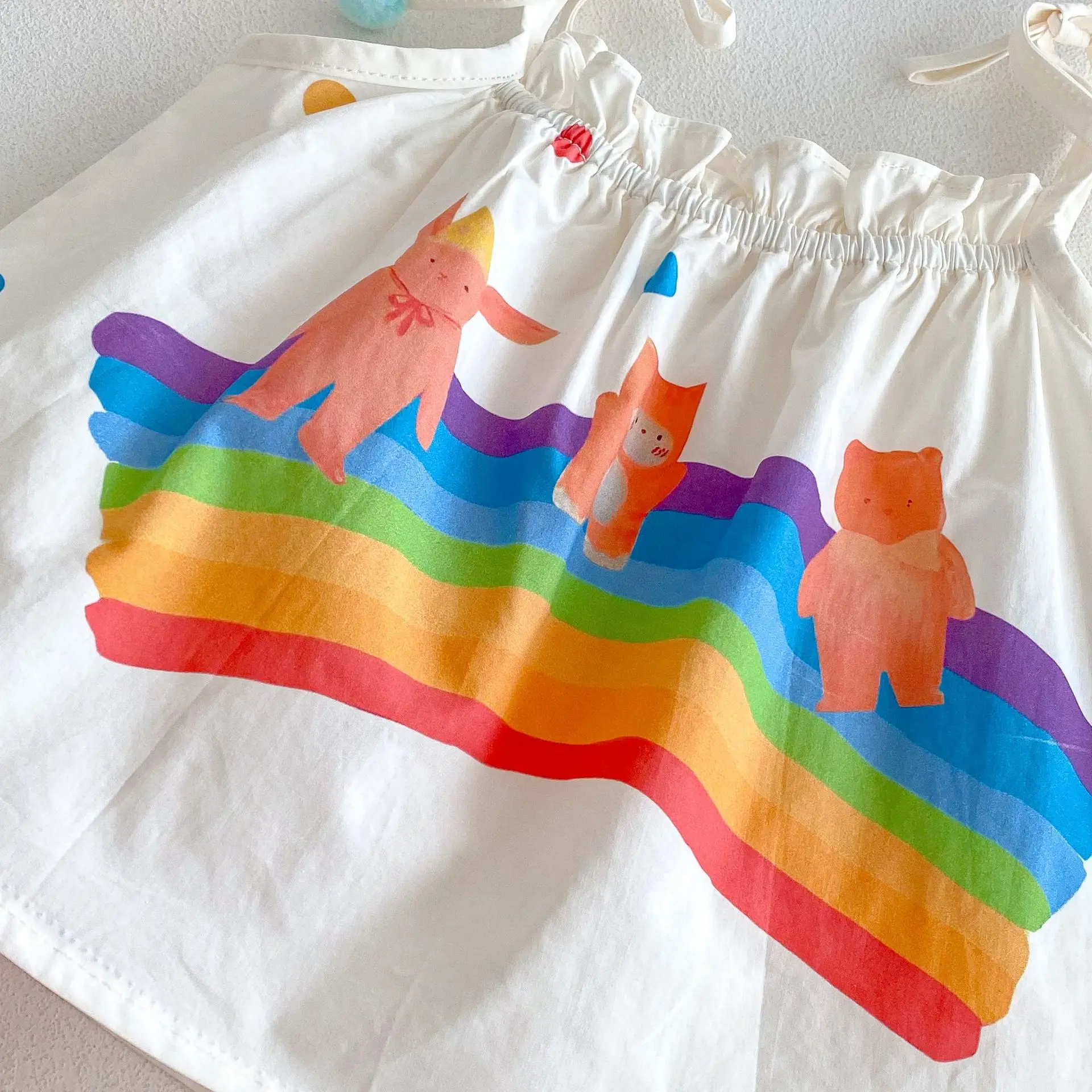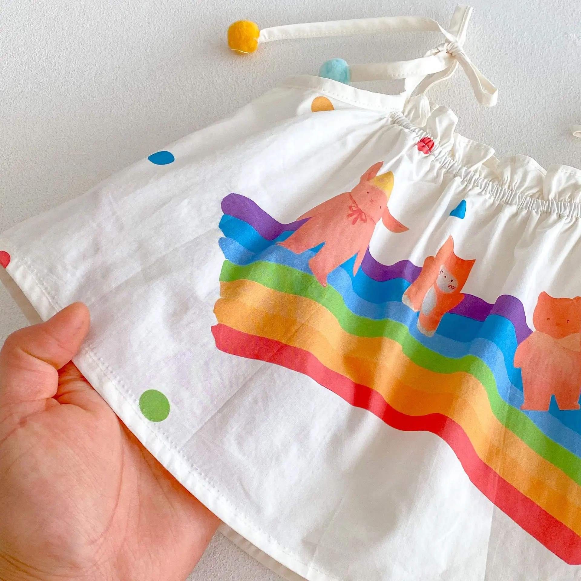 Este conjunto presenta un lindo top halter estampado de dibujos animados con divertidos pompones en las correas, lo que agrega un toque caprichoso.Combinado con pantalones cortos a rayas, es una combinación perfecta de diversión y moda.