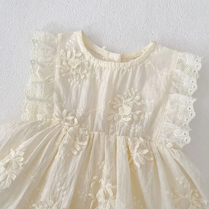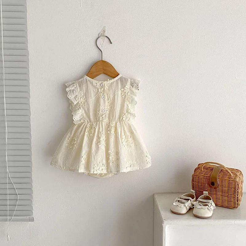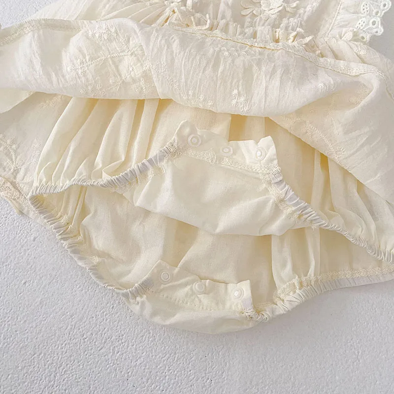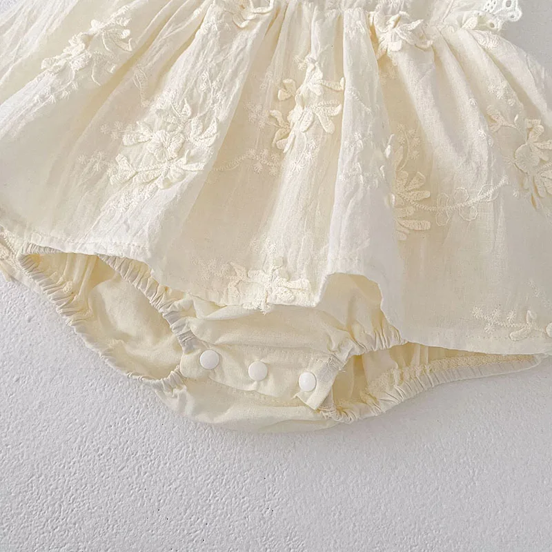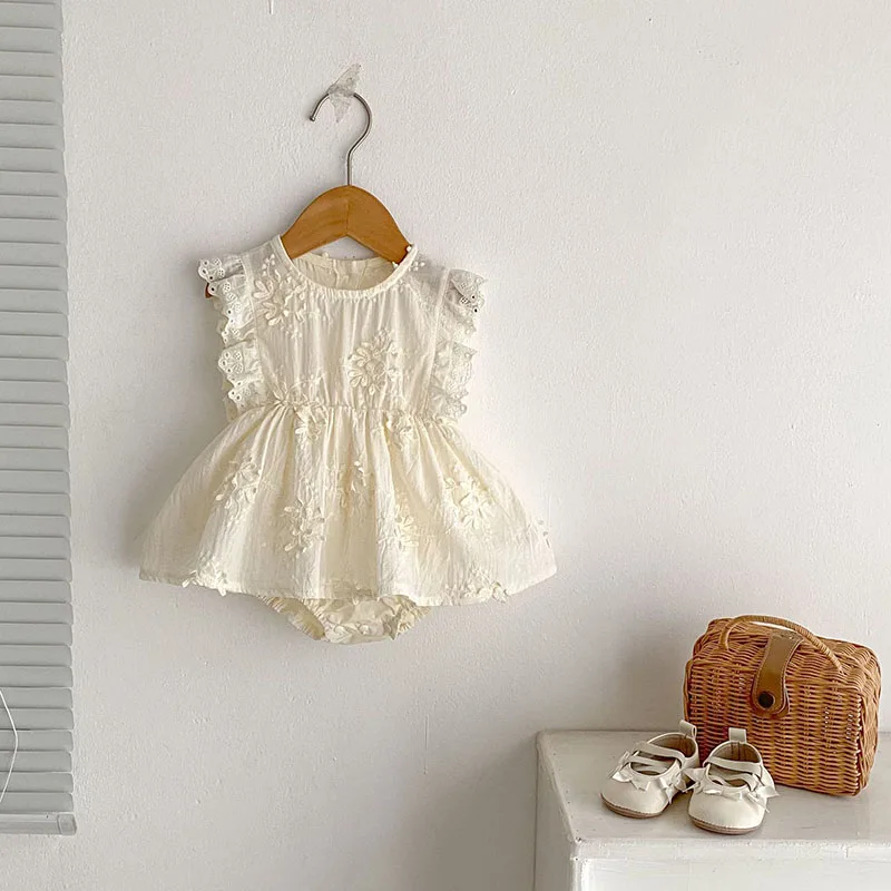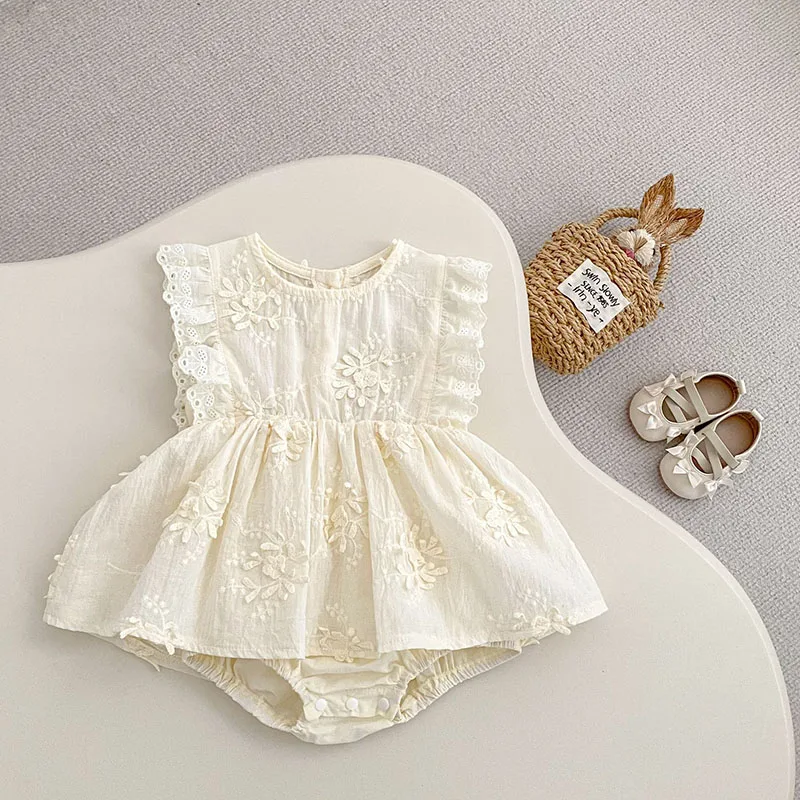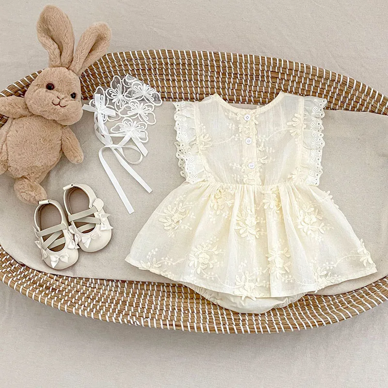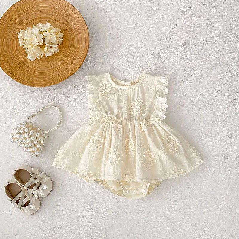 1.**Diseño exquisito**: este mameluco para bebé de 0 a 3 años presenta un delicado ribete de encaje y un hermoso bordado floral, lo que agrega un toque elegante y encantador.Las mangas aleteadas realzan la ternura general, haciendo que su bebé luzca increíblemente adorable.