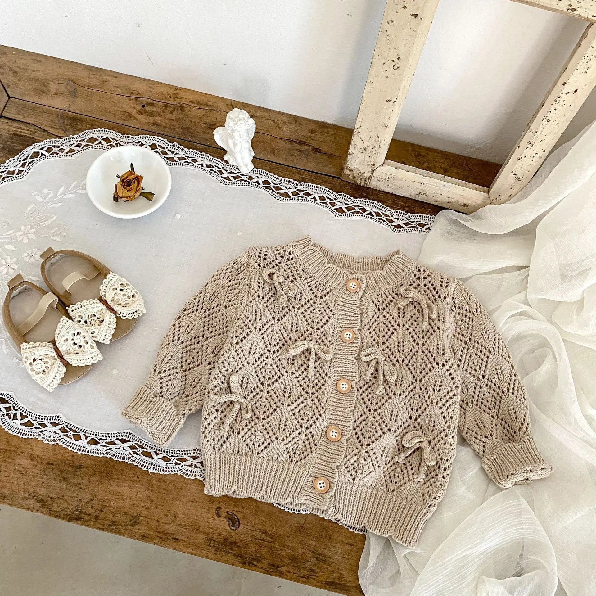 Comprar MILANCEL-cárdigan de punto para niña, suéter con bonito lazo, diseño hueco, prendas de vestir para bebé, ropa de primavera para bebé de 0 a 3 años