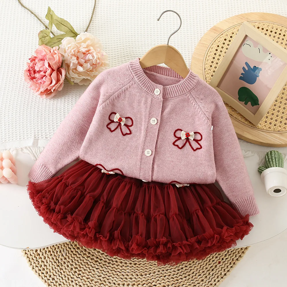 Comprar MILANCEL Conjunto de ropa para niños de 2 a 7 años, cárdigans con lazo de punto, falda de vestido de baile rojo vino, traje de punto para niñas de 2 piezas