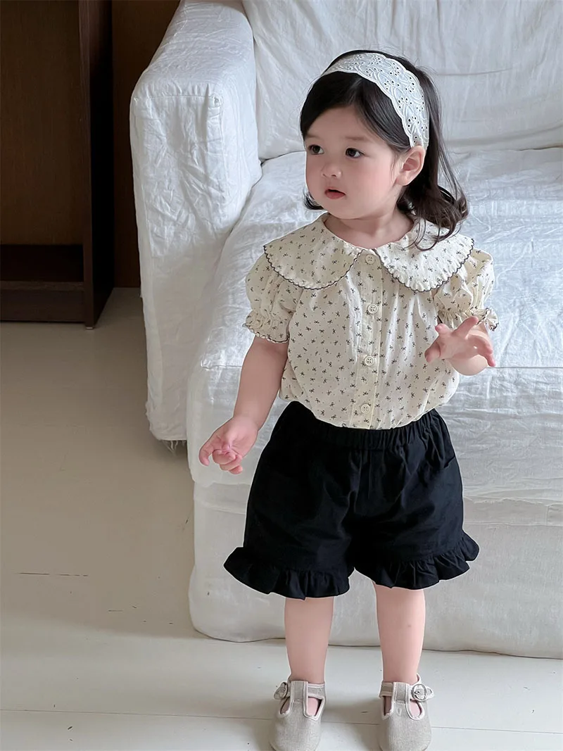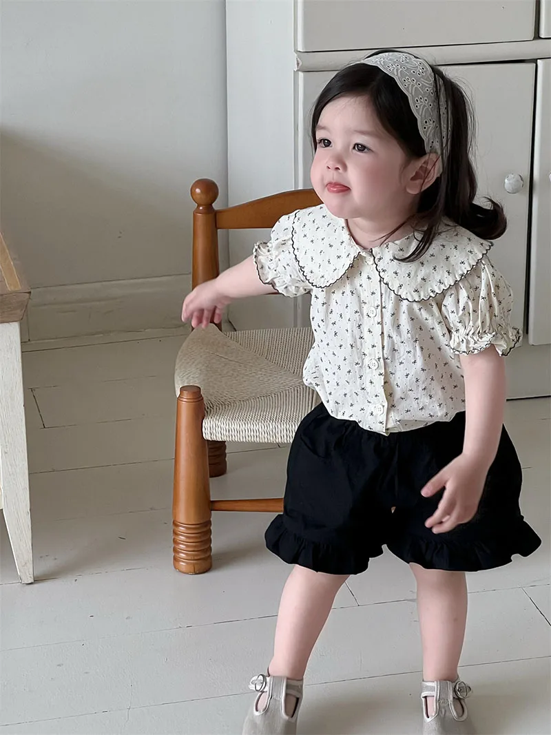 1.**Diseño encantador**: este conjunto de verano para bebés de 9 meses a 3 años combina una dulce camisa adornada con un lazo y pantalones cortos con volantes.La camisa presenta un cuello grande y bonito con un delicado estampado de lazo, mientras que los pantalones cortos negros con dobladillos con volantes añaden un toque de ternura.