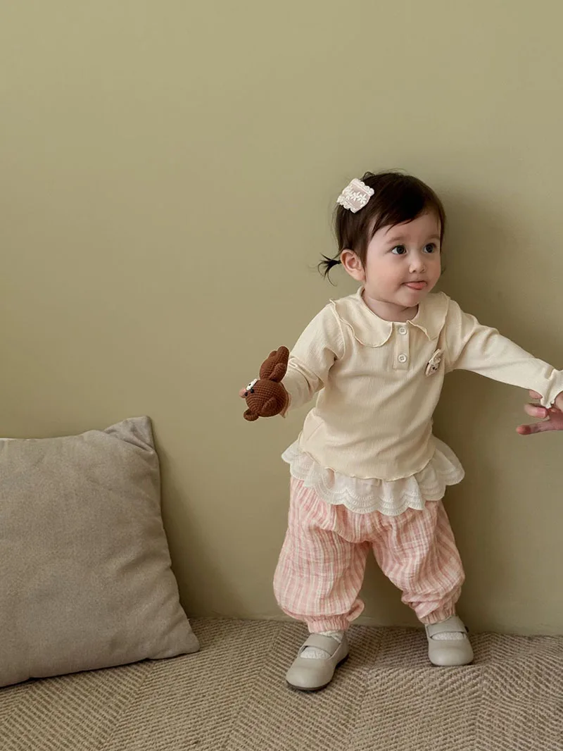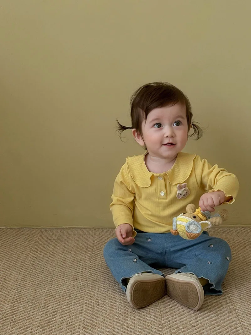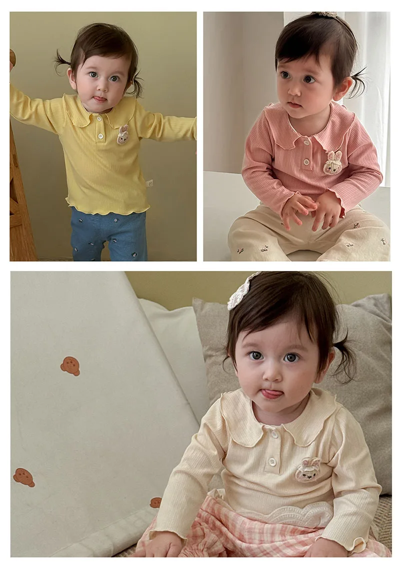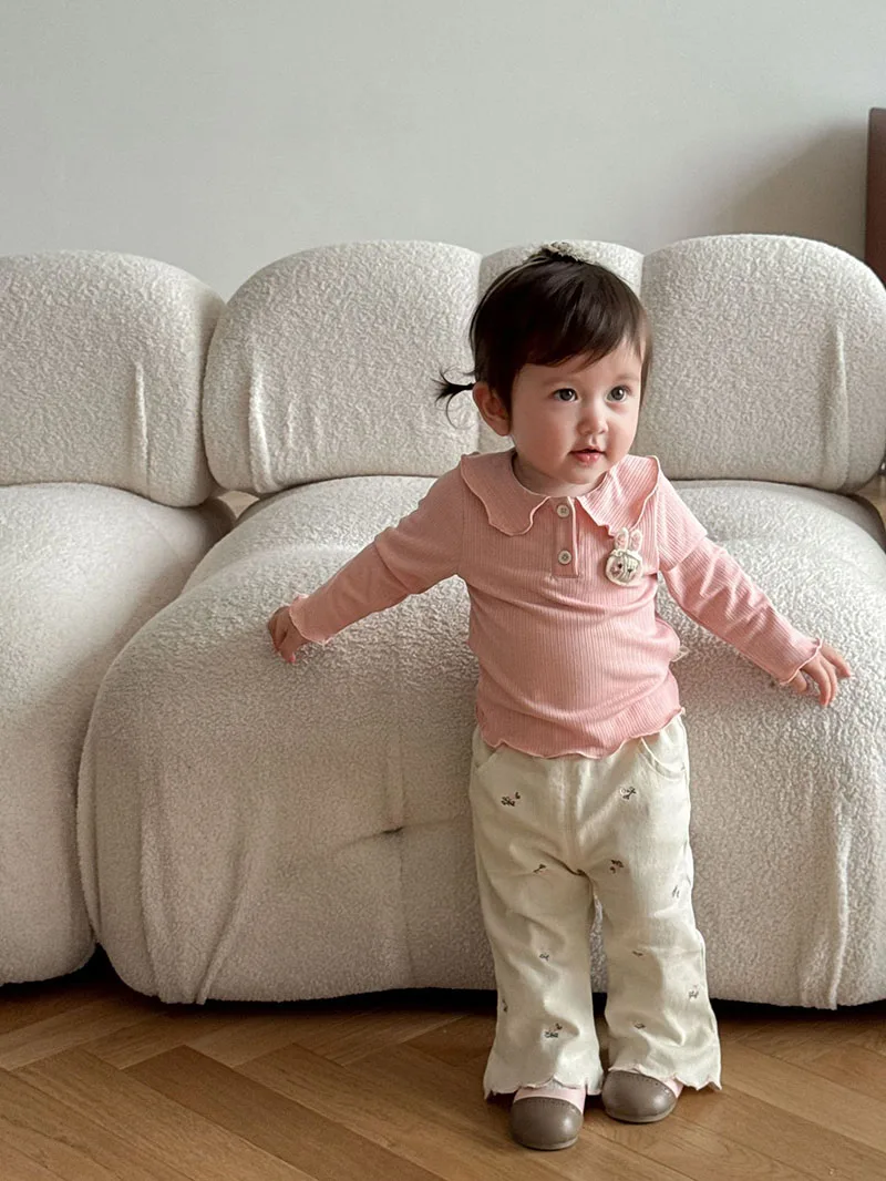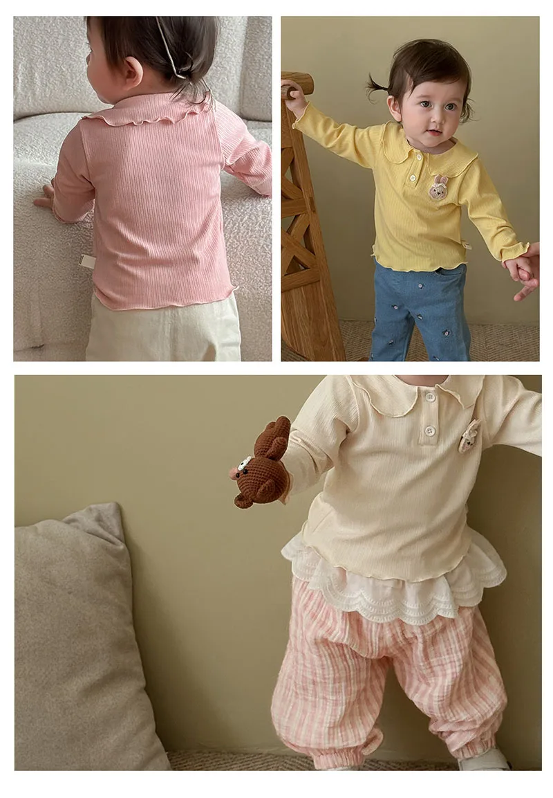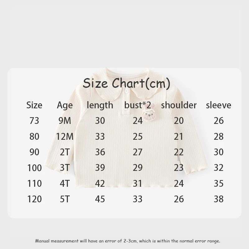2.**Dulce cuello Peter Pan**: El clásico cuello Peter Pan con borde con volantes le da a la camisa un aspecto femenino y encantador, adecuado para niñas pequeñas.