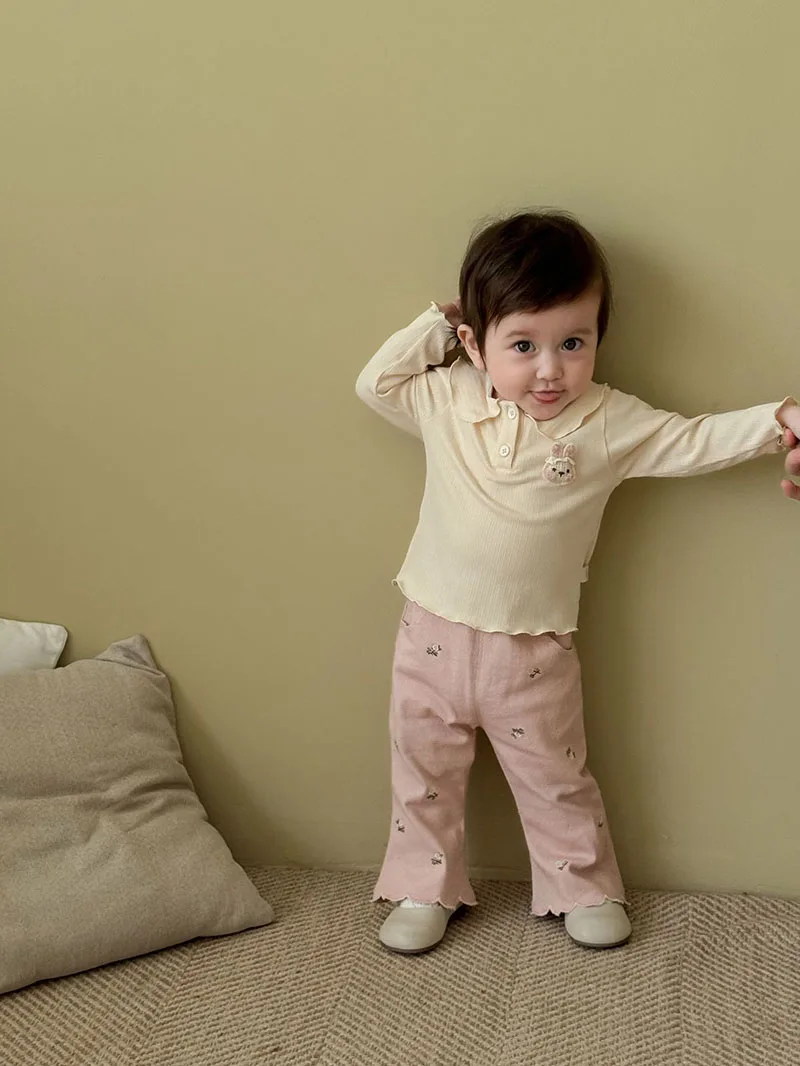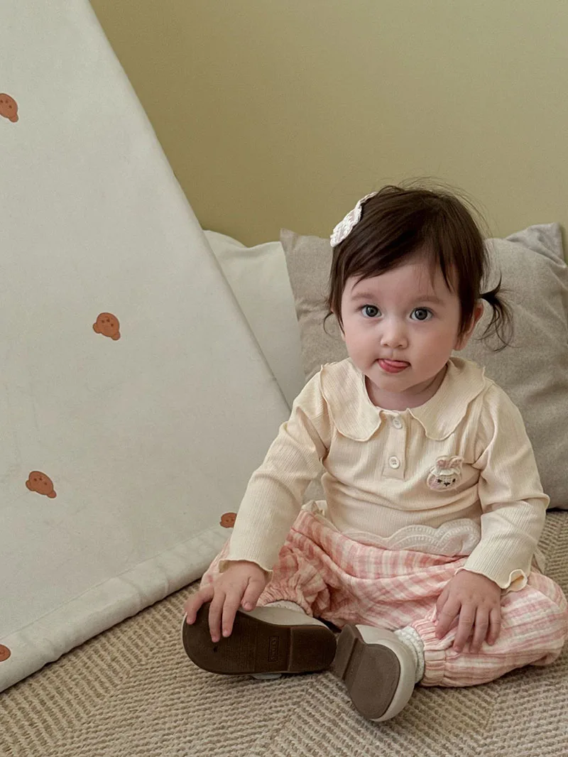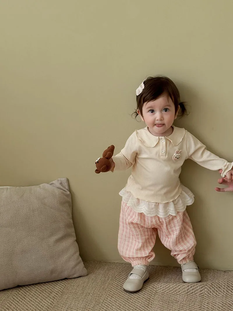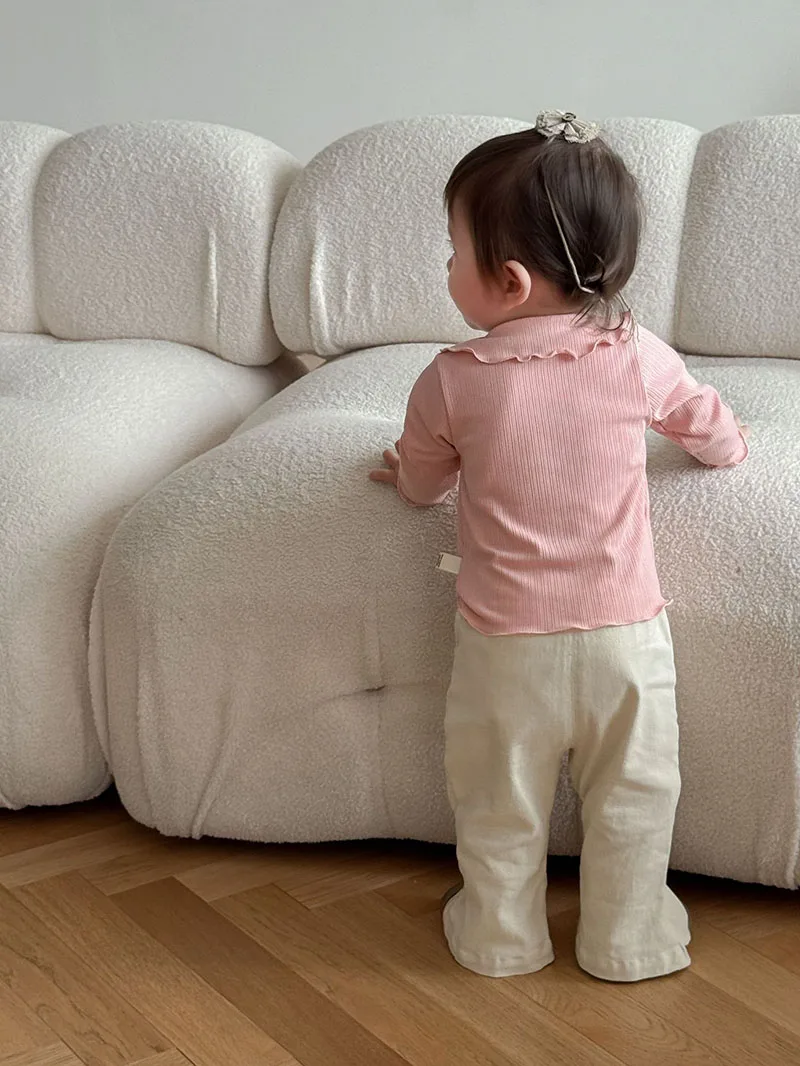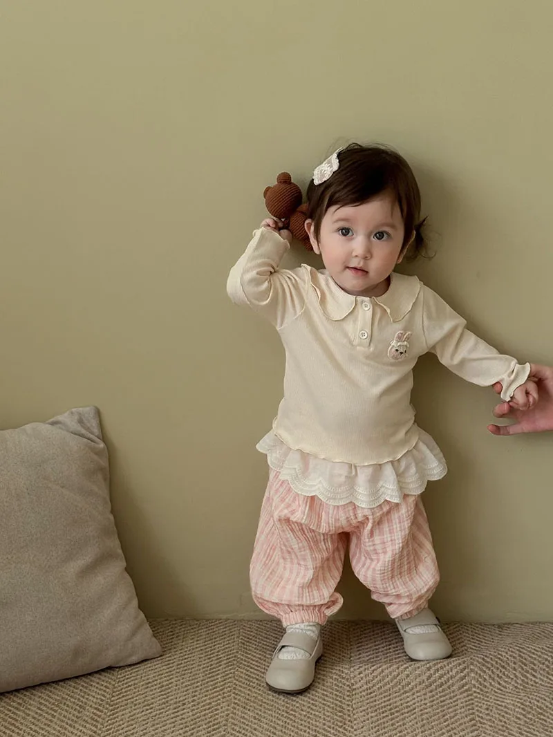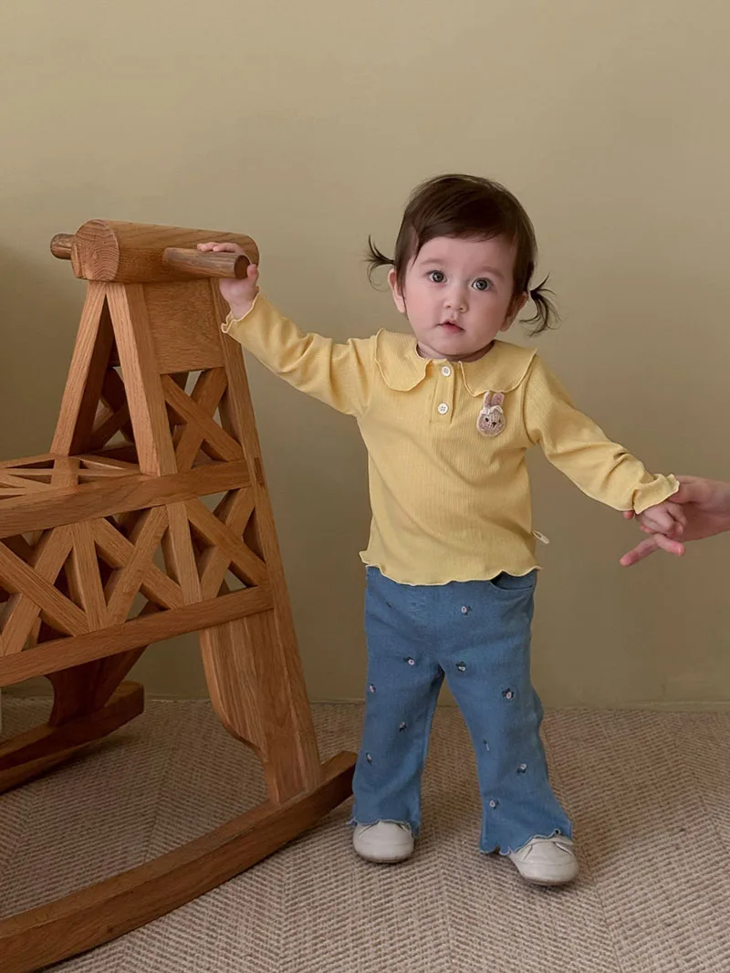 2.**Dulce cuello Peter Pan**: El clásico cuello Peter Pan con borde con volantes le da a la camisa un aspecto femenino y encantador, adecuado para niñas pequeñas.