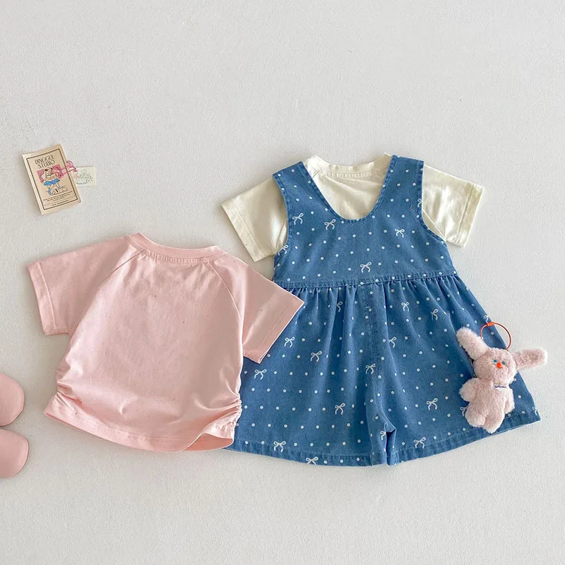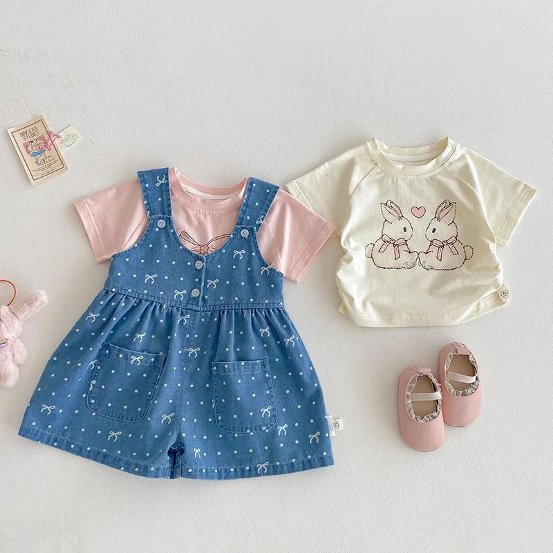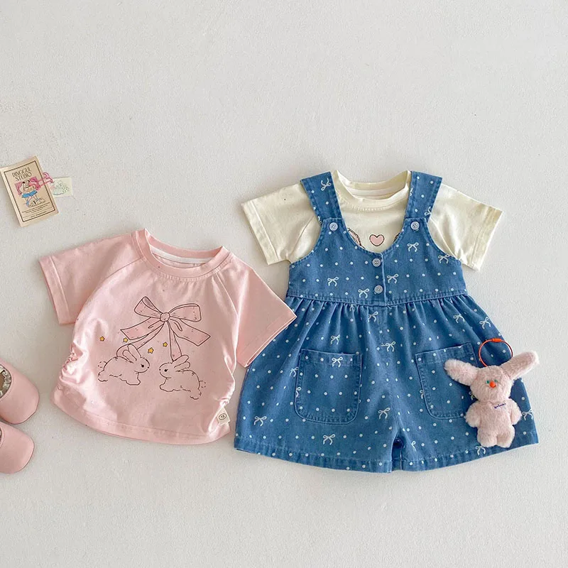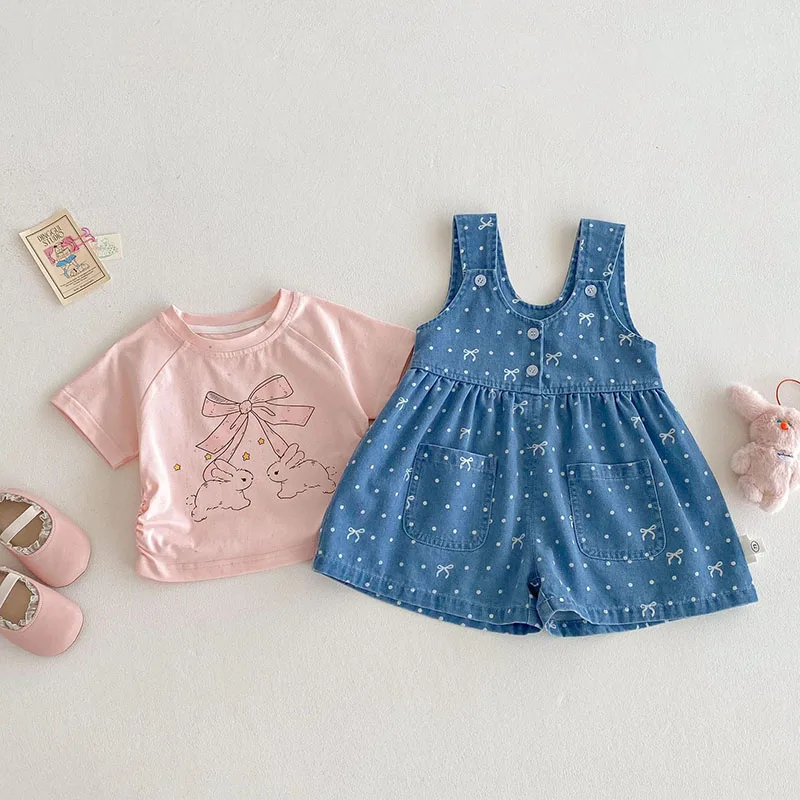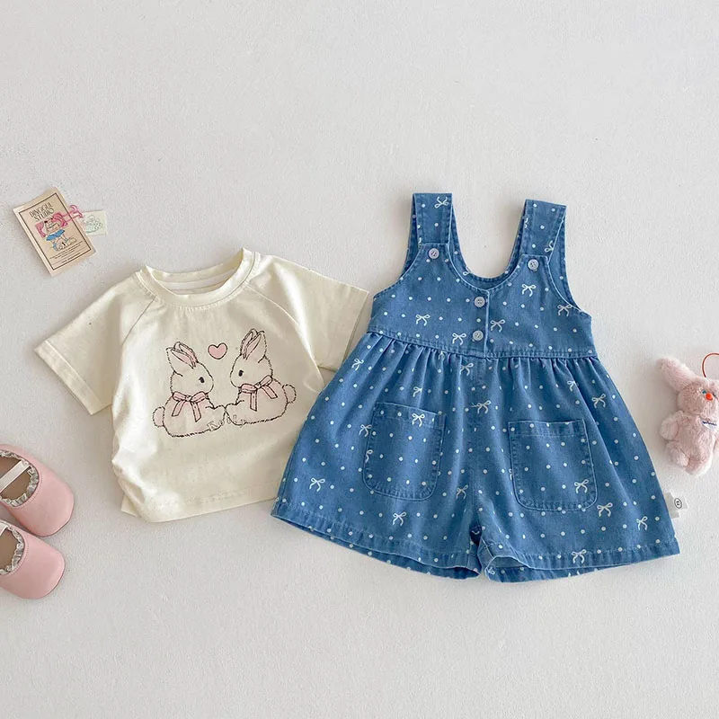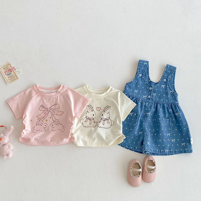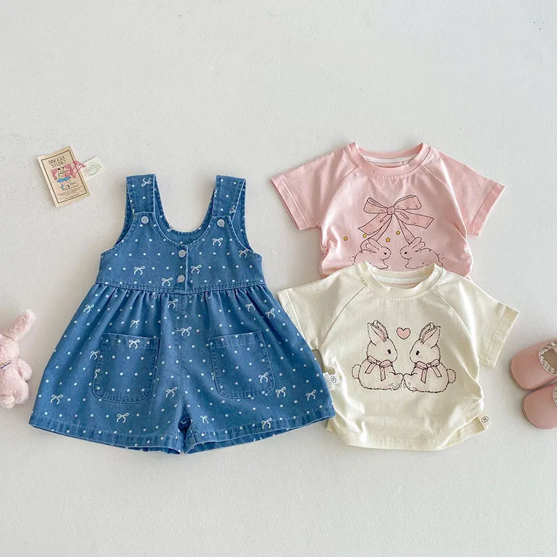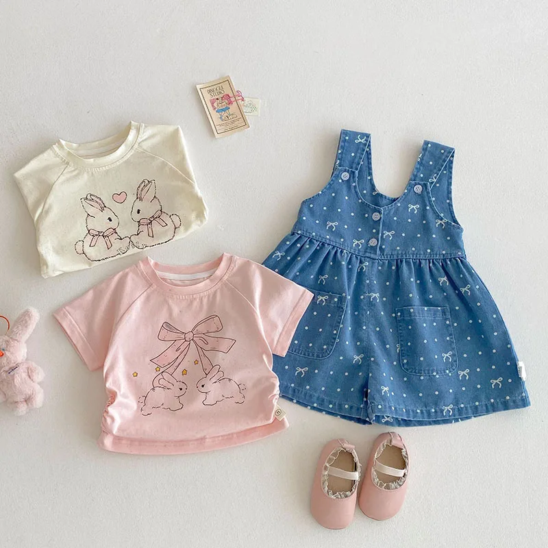Comprar MILANCEL, nueva camiseta de verano para niñas, camiseta de conejito con lazo de dibujos animados para niños, monos vaqueros de puntos coreanos