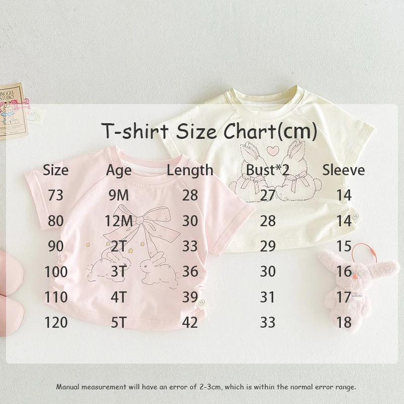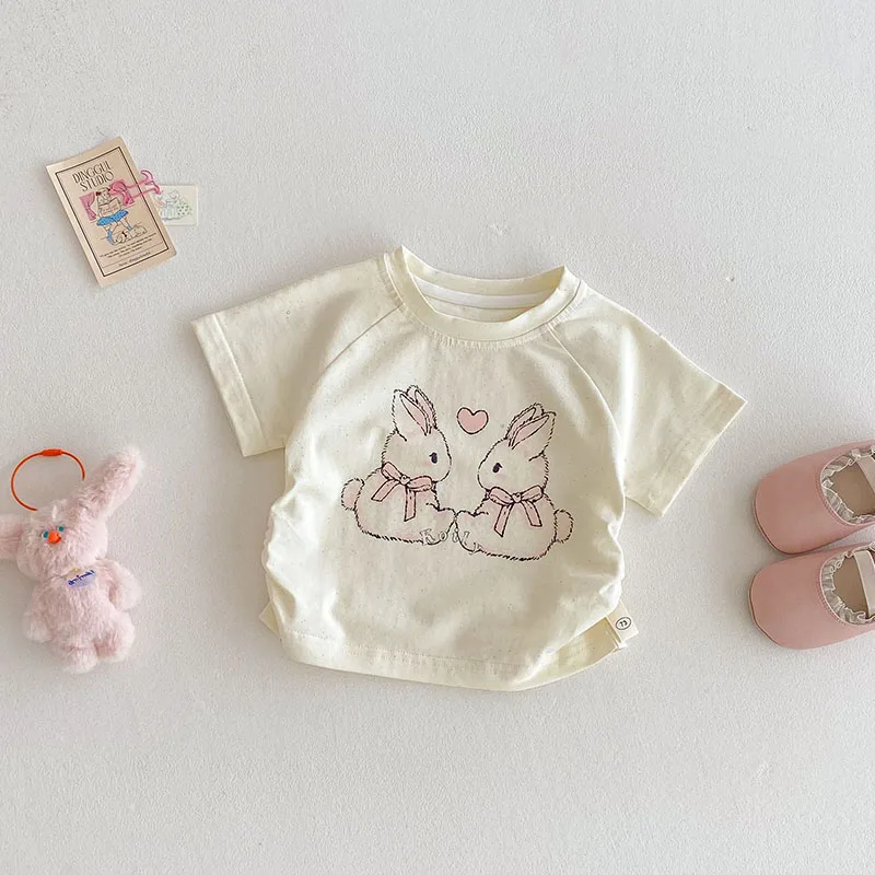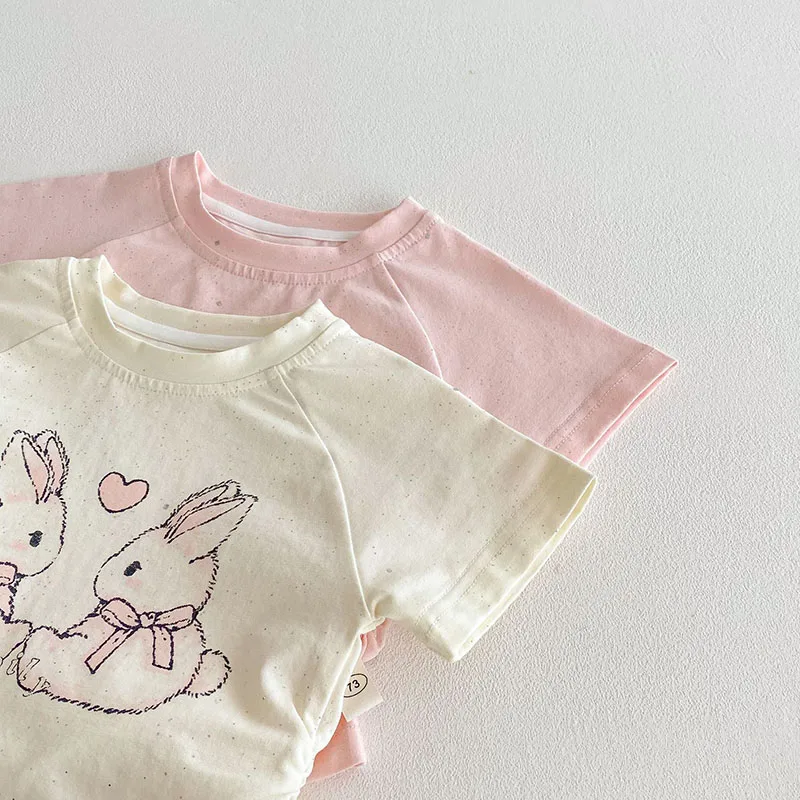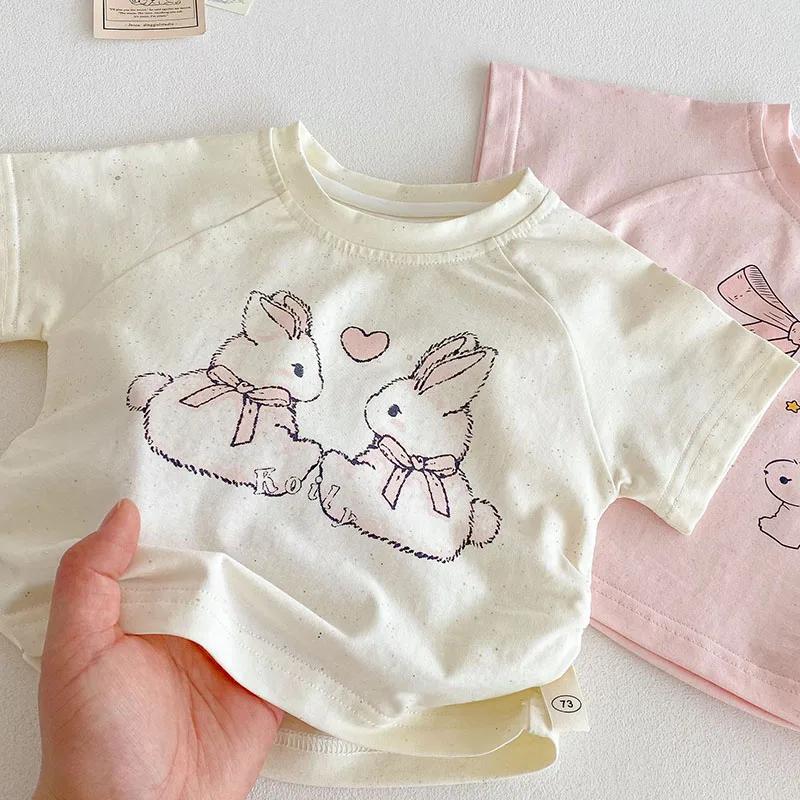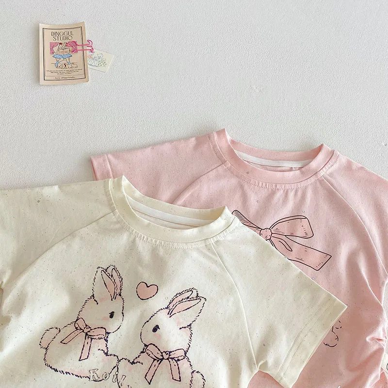 1.**Adorable estampado de dibujos animados**: Las camisetas presentan lindos diseños de conejitos, uno con un lazo y estrellas, el otro con conejitos y un corazón, lo que agrega un toque encantador y divertido.