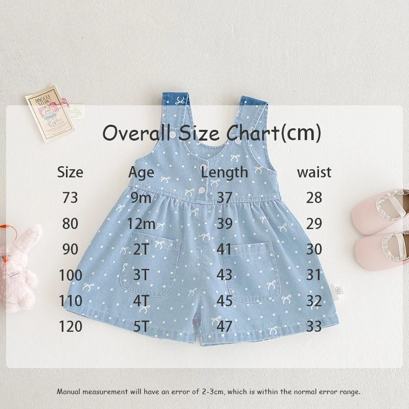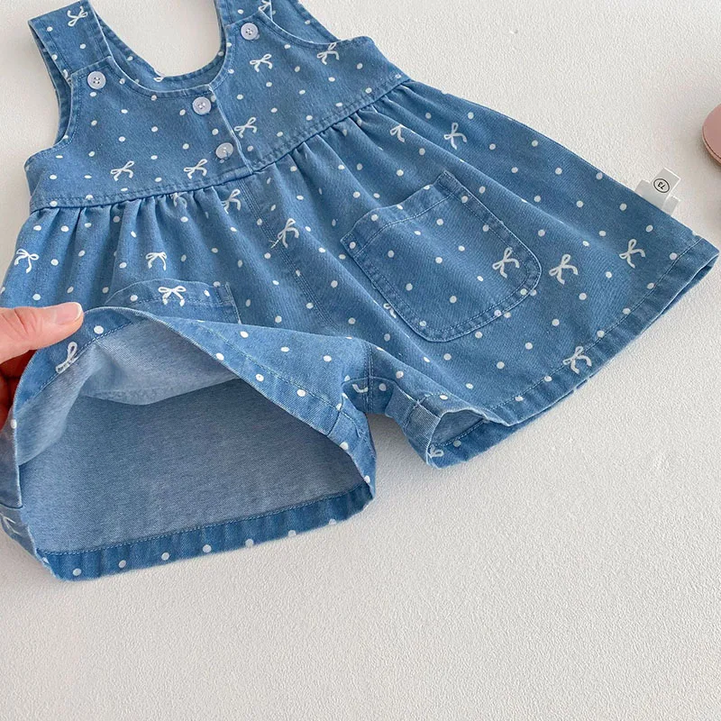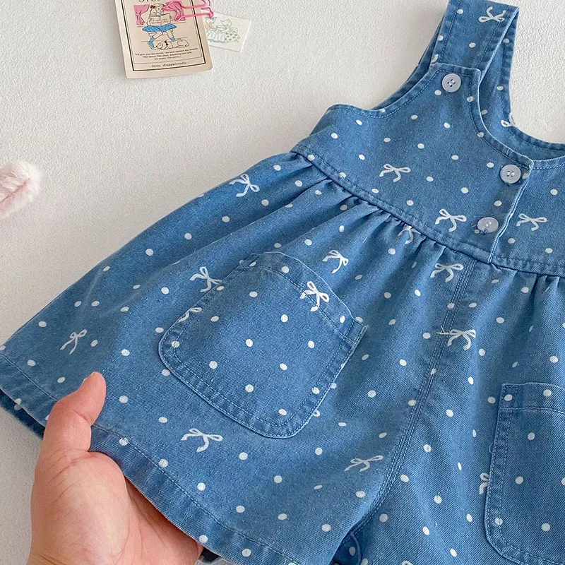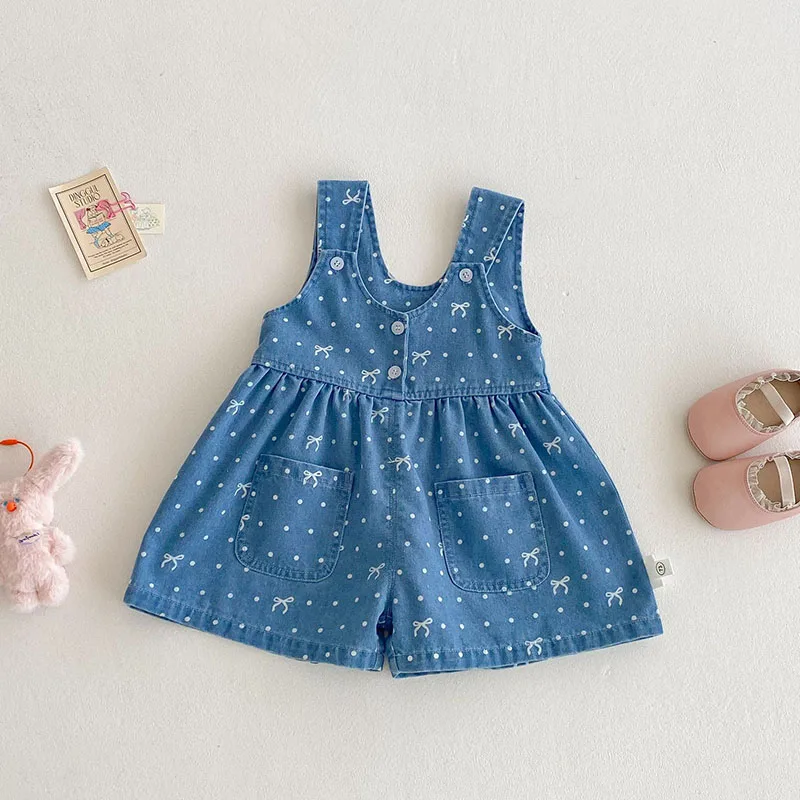 3.**Mano de mezclilla clásico**: El mono de mezclilla azul con lunares blancos y estampados de lazos es una opción atemporal y moderna.Los botones funcionales y los bolsillos delanteros añaden practicidad.