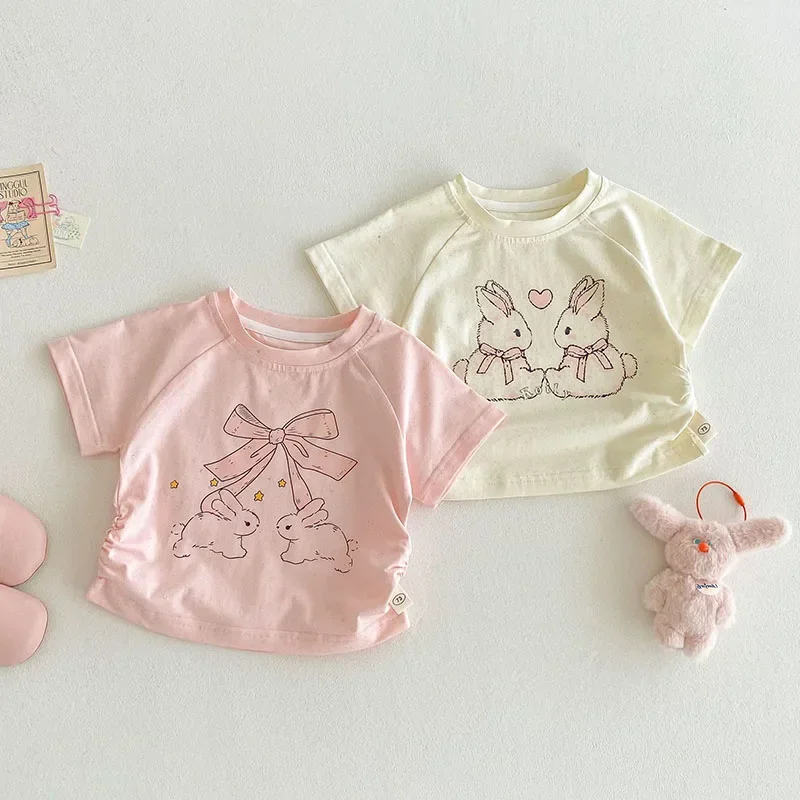 1.**Adorable estampado de dibujos animados**: Las camisetas presentan lindos diseños de conejitos, uno con un lazo y estrellas, el otro con conejitos y un corazón, lo que agrega un toque encantador y divertido.