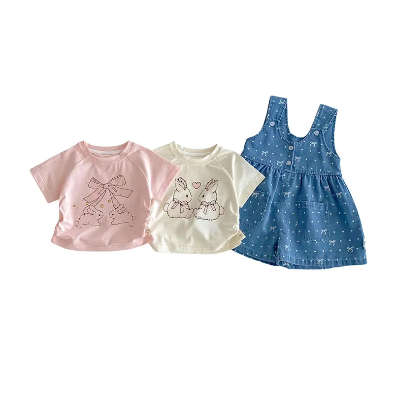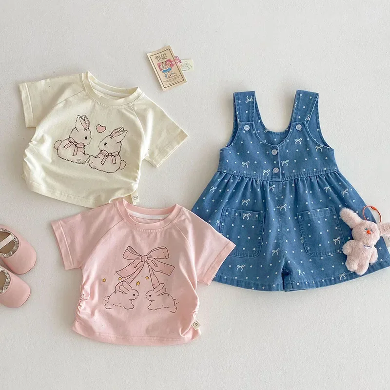 Comprar MILANCEL, nueva camiseta de verano para niñas, camiseta de conejito con lazo de dibujos animados para niños, monos vaqueros de puntos coreanos