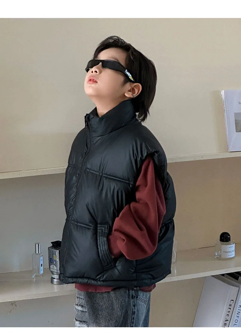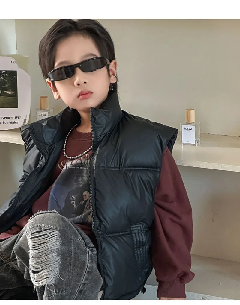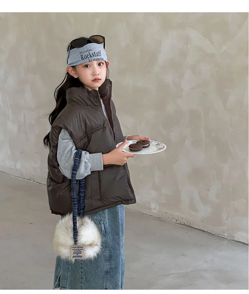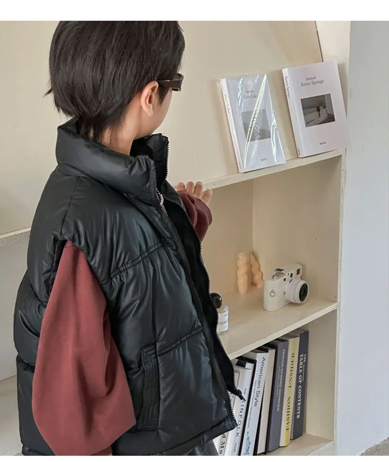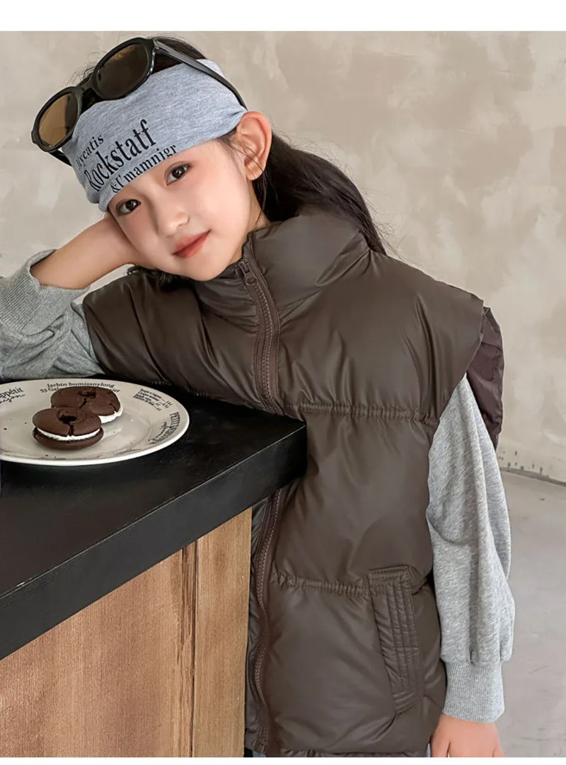 - **Diseño simple de color sólido**: Disponible en colores clásicos como negro, marrón y beige, el chaleco ofrece una apariencia minimalista y atemporal.Se puede combinar fácilmente con varias blusas y pantalones, lo que la convierte en una pieza versátil en el guardarropa de los niños.