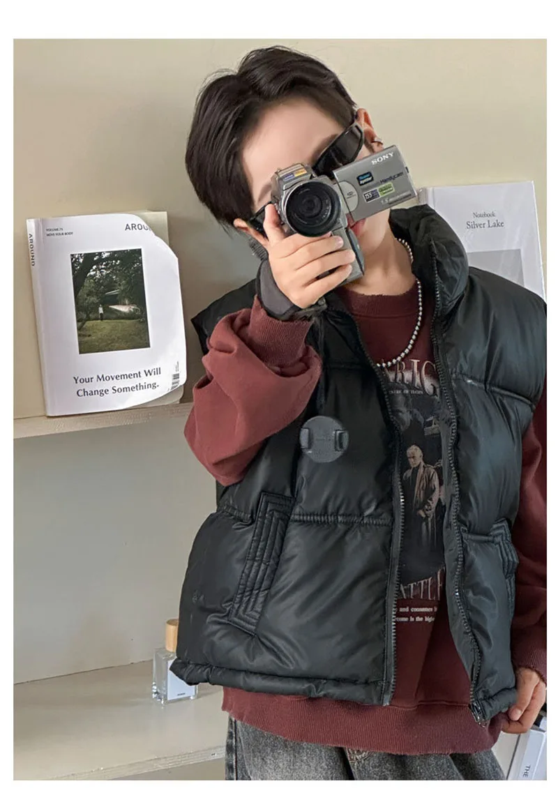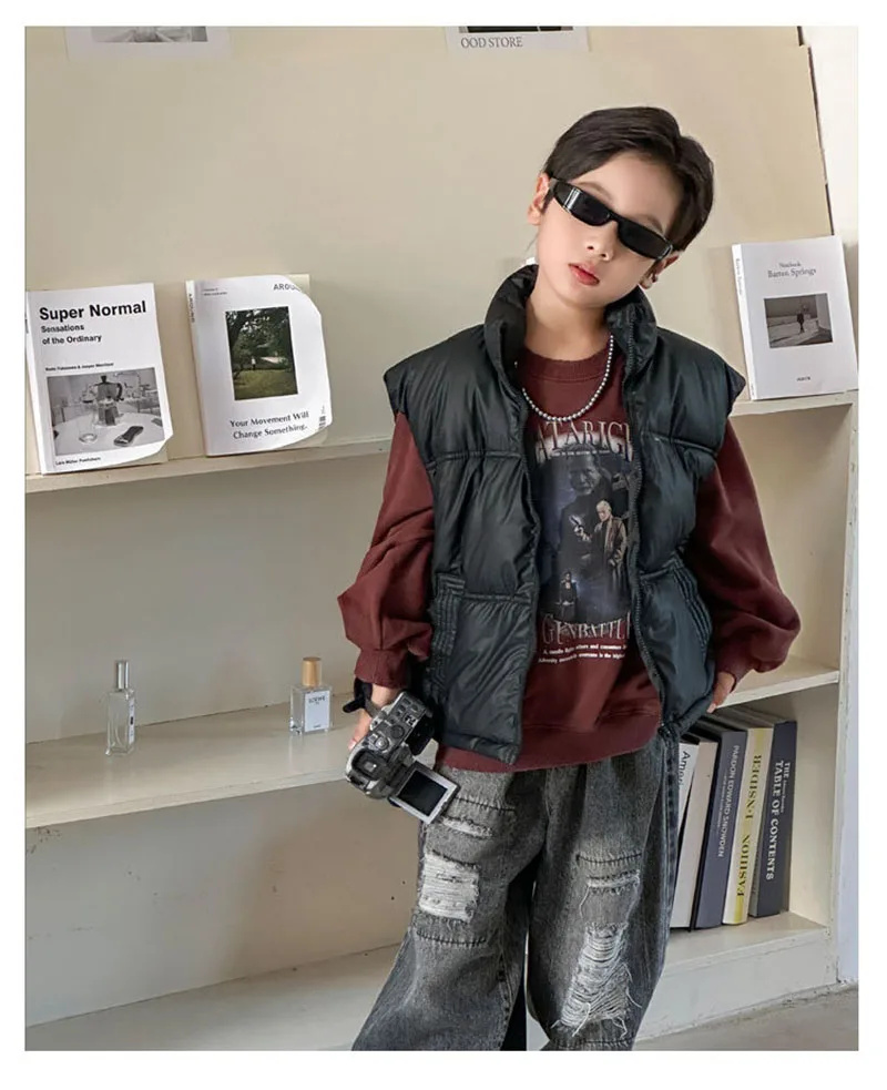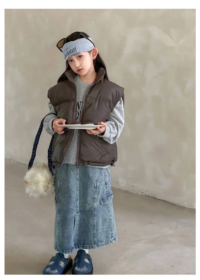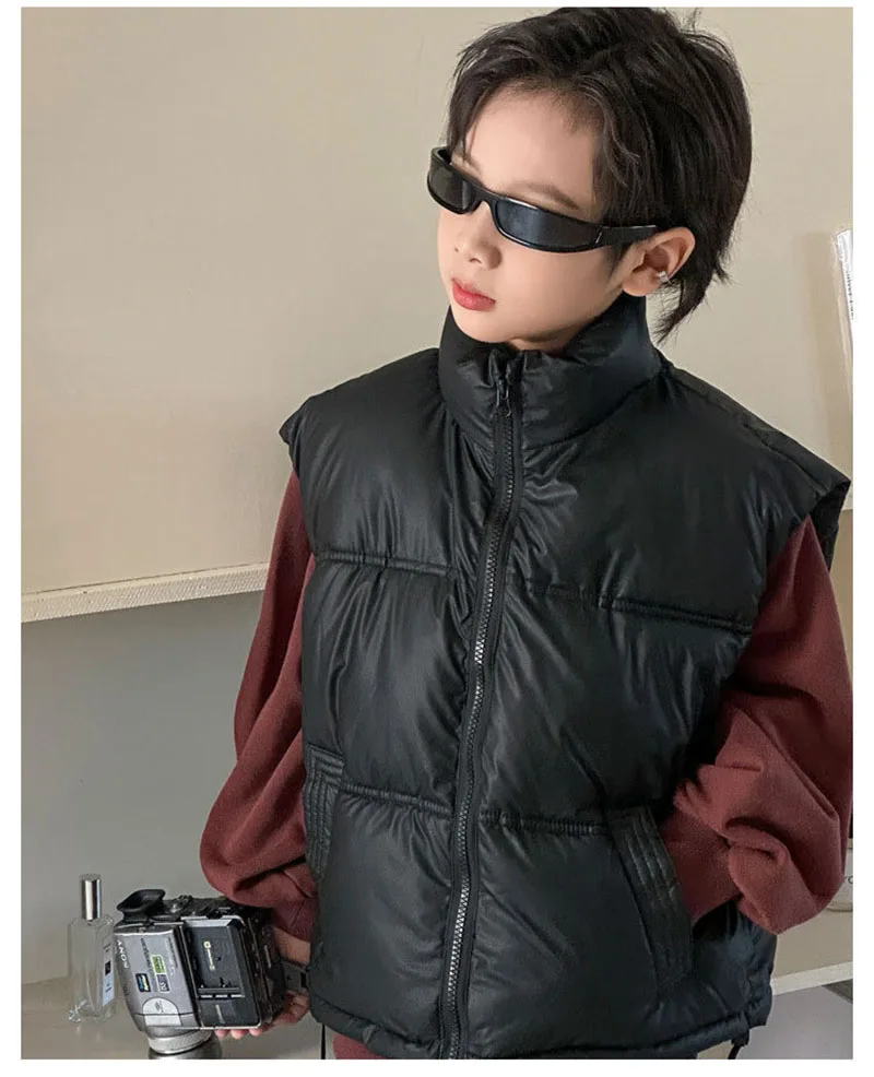 - **Diseño simple de color sólido**: Disponible en colores clásicos como negro, marrón y beige, el chaleco ofrece una apariencia minimalista y atemporal.Se puede combinar fácilmente con varias blusas y pantalones, lo que la convierte en una pieza versátil en el guardarropa de los niños.