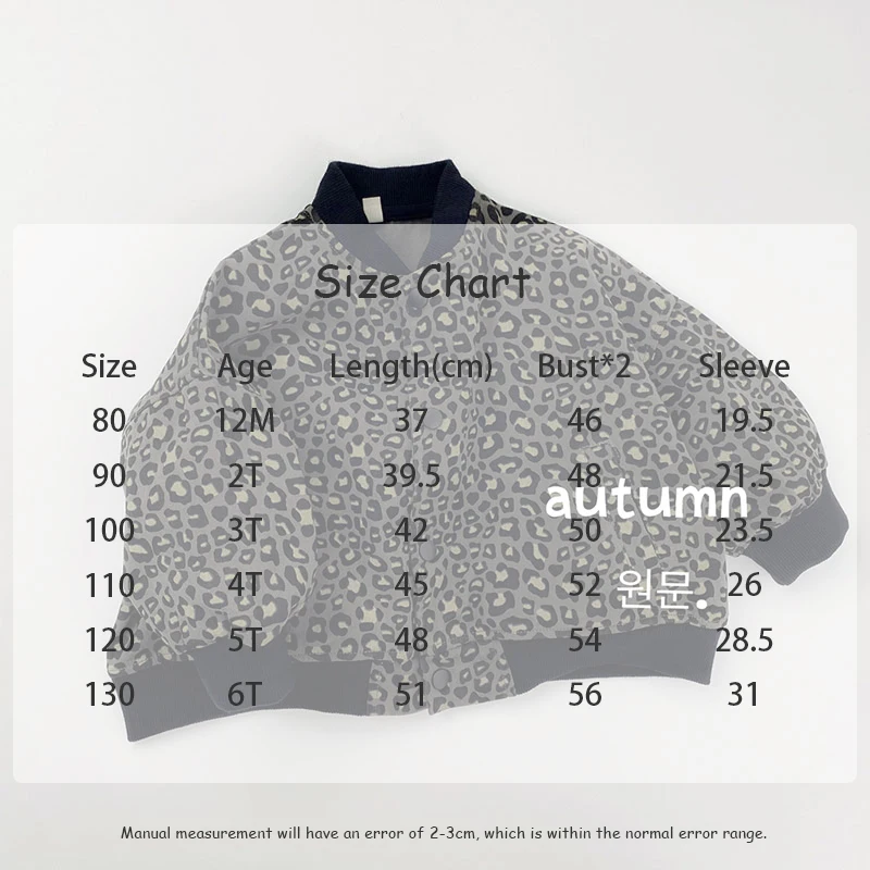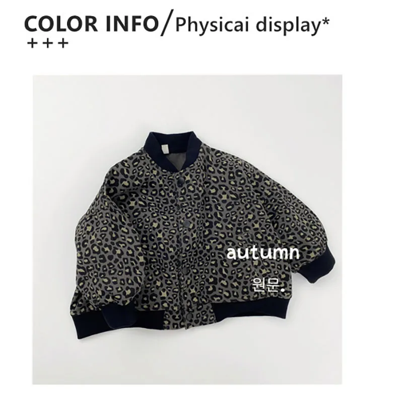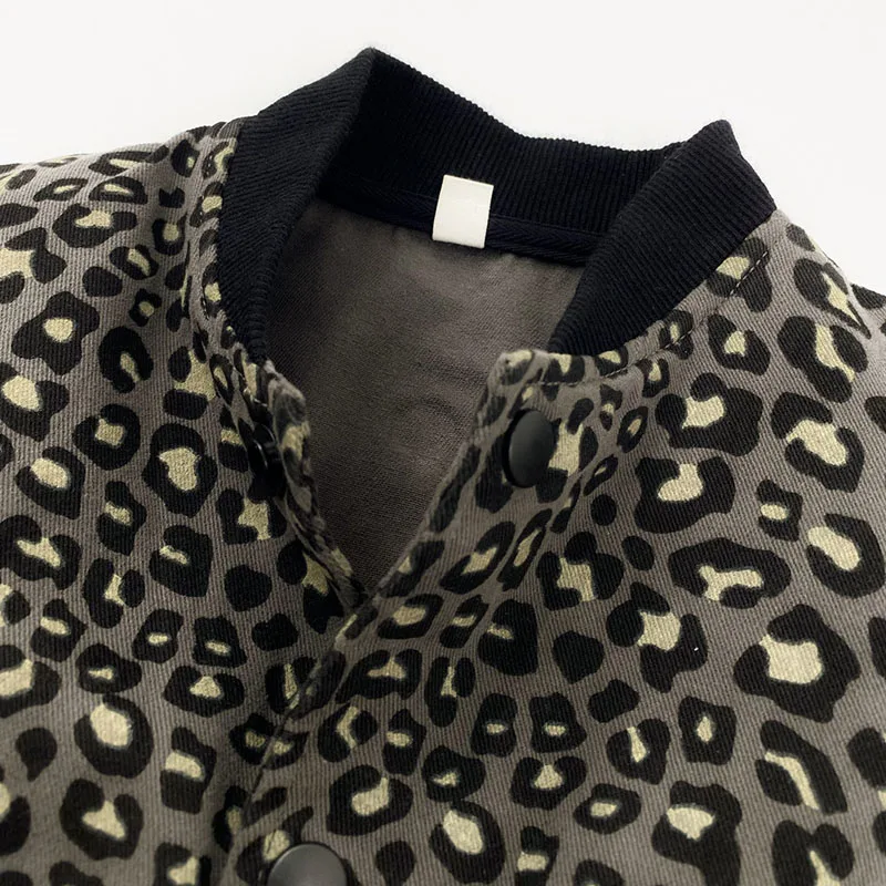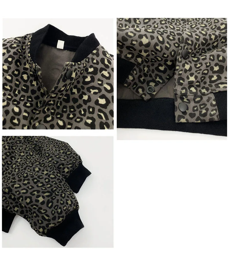 - **Estilo de chaqueta de béisbol clásica y estampado de leopardo de moda**: La chaqueta presenta un moderno estampado de leopardo combinado con un estilo clásico de chaqueta de béisbol.El estampado de leopardo añade un toque retro y elegante, mientras que el diseño de la chaqueta de béisbol ofrece un look casual y versátil, atractivo para los padres que aman tanto los estilos modernos como clásicos.