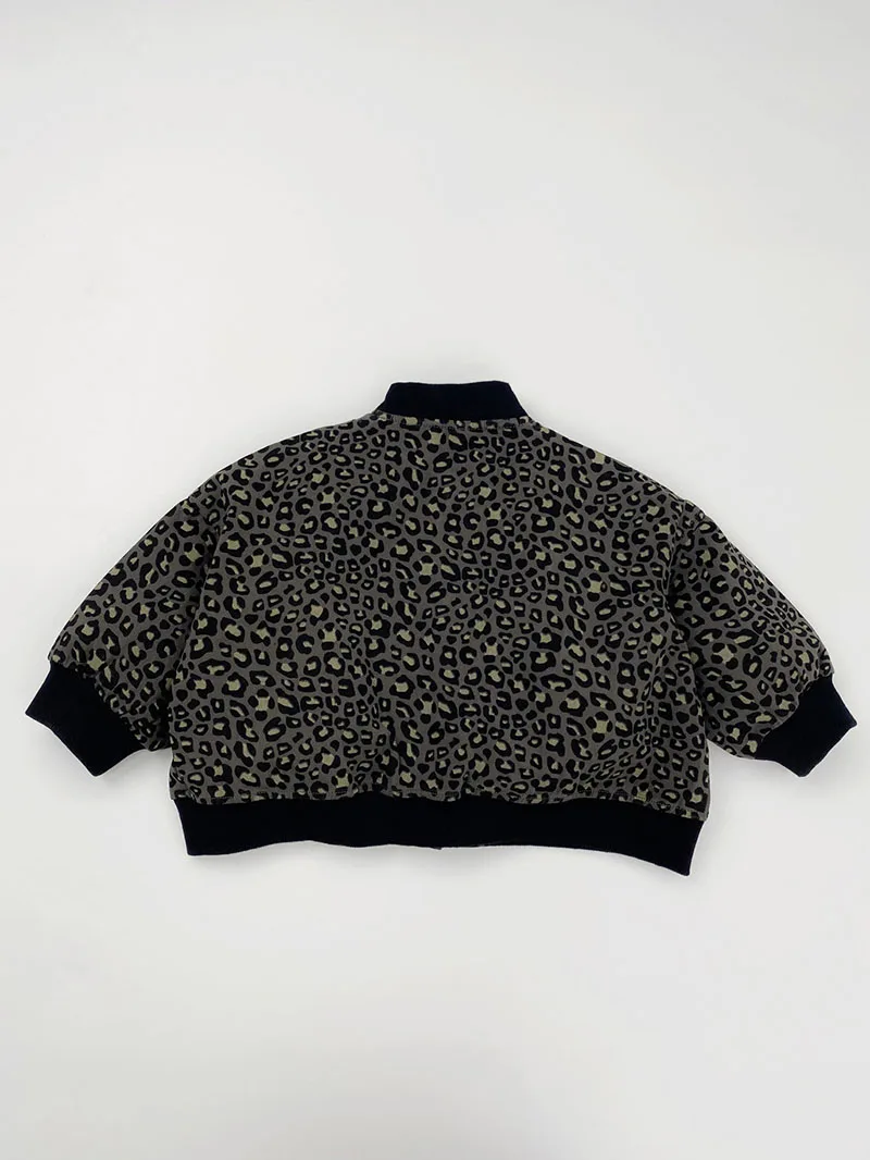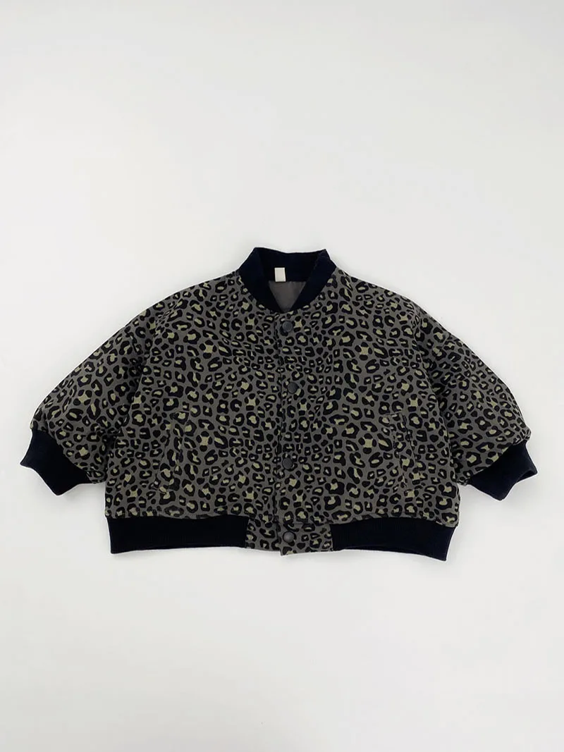 - **Estilo de chaqueta de béisbol clásica y estampado de leopardo de moda**: La chaqueta presenta un moderno estampado de leopardo combinado con un estilo clásico de chaqueta de béisbol.El estampado de leopardo añade un toque retro y elegante, mientras que el diseño de la chaqueta de béisbol ofrece un look casual y versátil, atractivo para los padres que aman tanto los estilos modernos como clásicos.