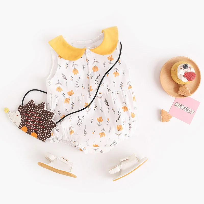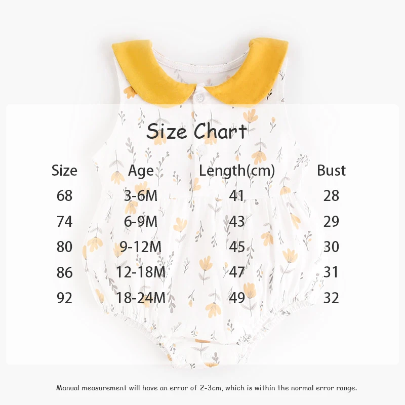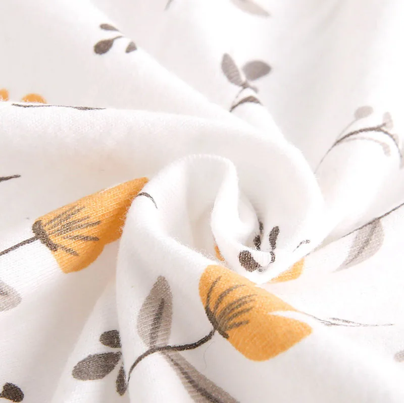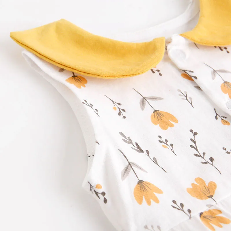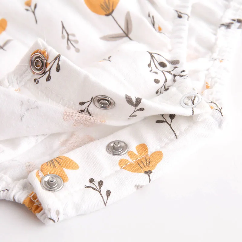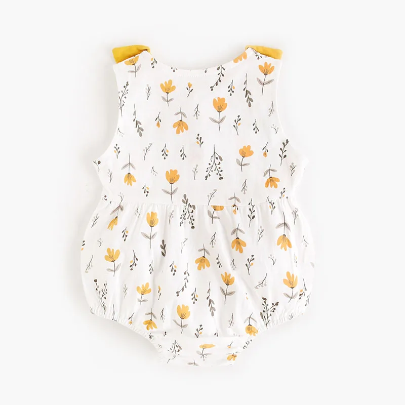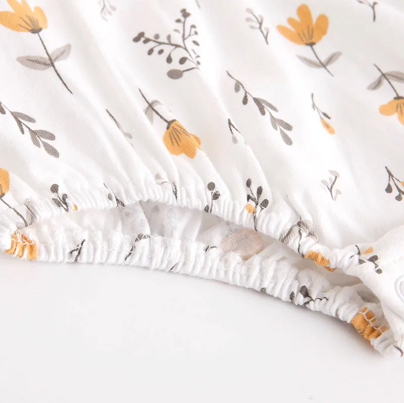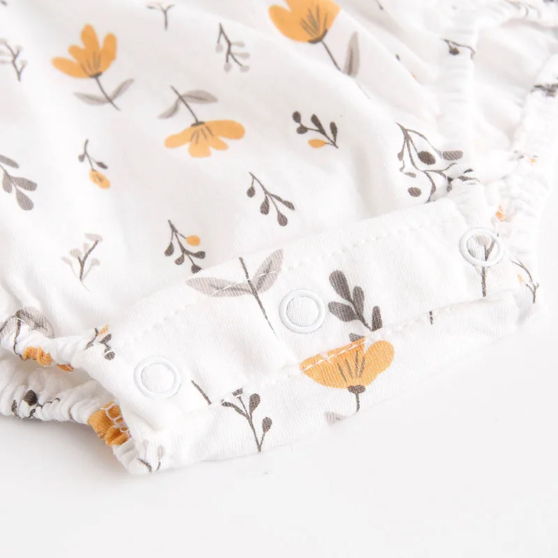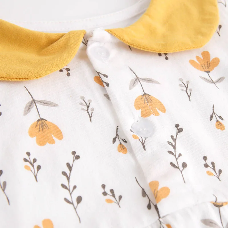 1.**Adorable estampado floral**: este mameluco para bebé presenta un encantador estampado floral.Las delicadas flores amarillas con tallos y hojas grises sobre un fondo blanco crean una apariencia dulce y llamativa, perfecta para bebés de 0 a 2 años.