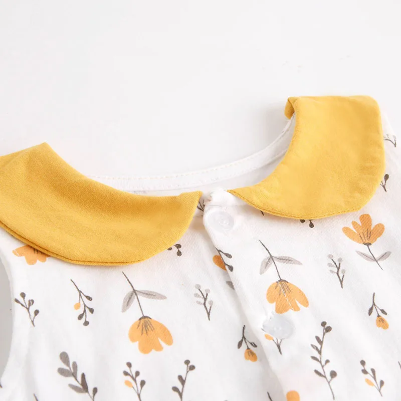 3.**Diseño práctico**: El diseño sin mangas es ideal para los días más cálidos.Los cierres con botones en la parte delantera y botones a presión en la parte inferior facilitan el cambio de vestido y pañal.El cuello amarillo brillante añade un lindo contraste y un toque elegante.
