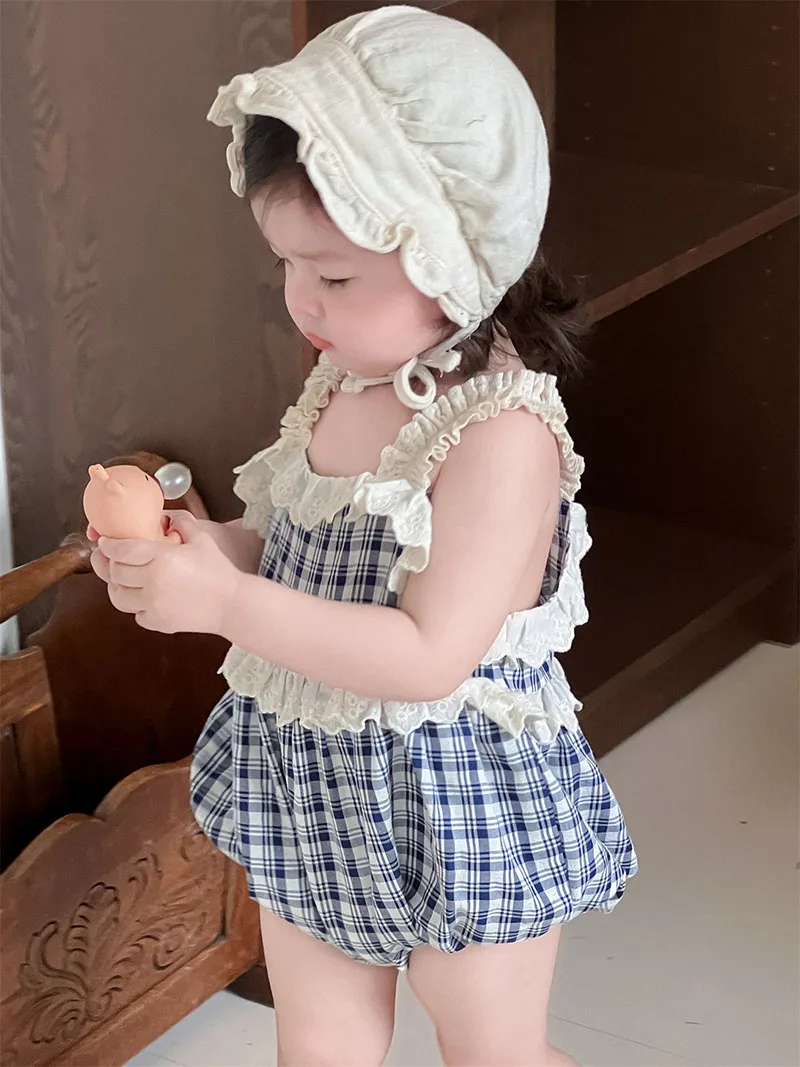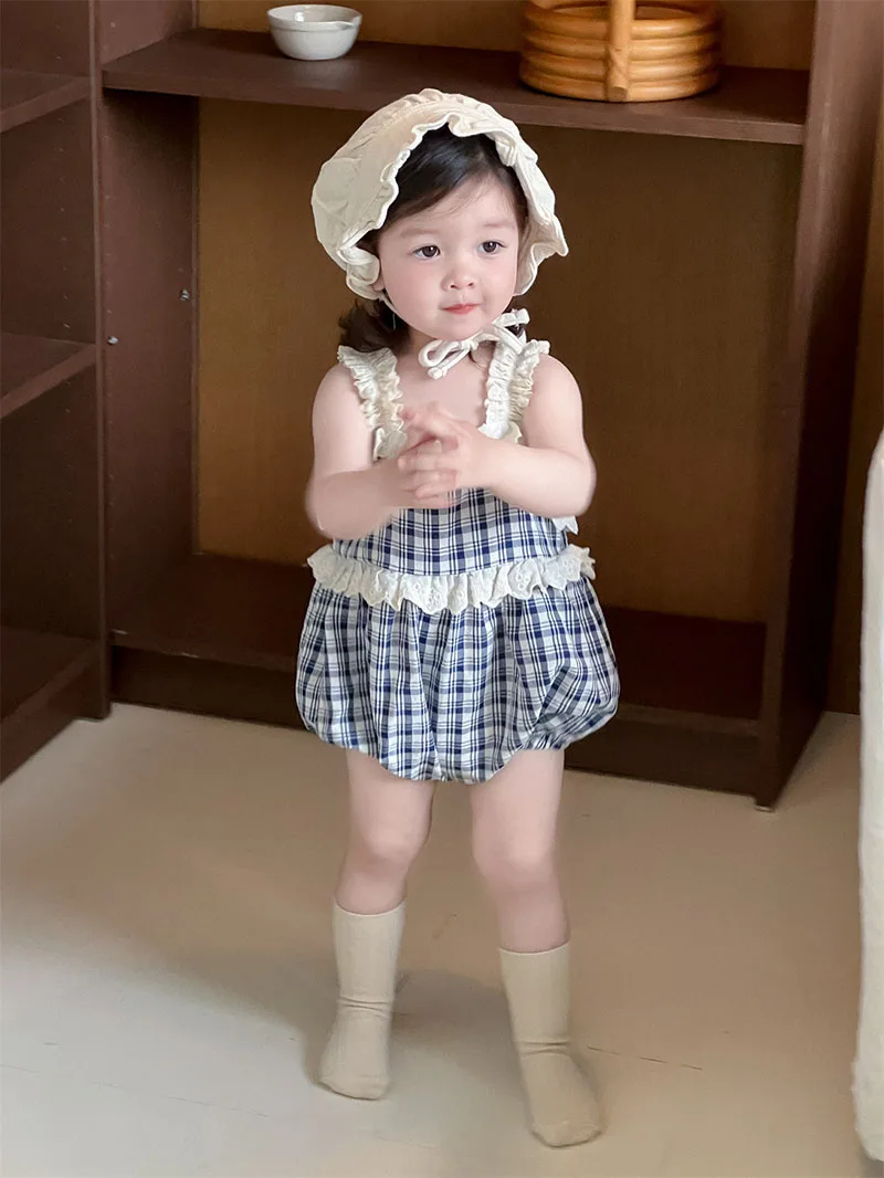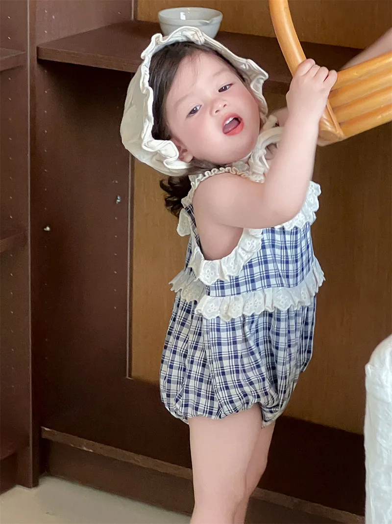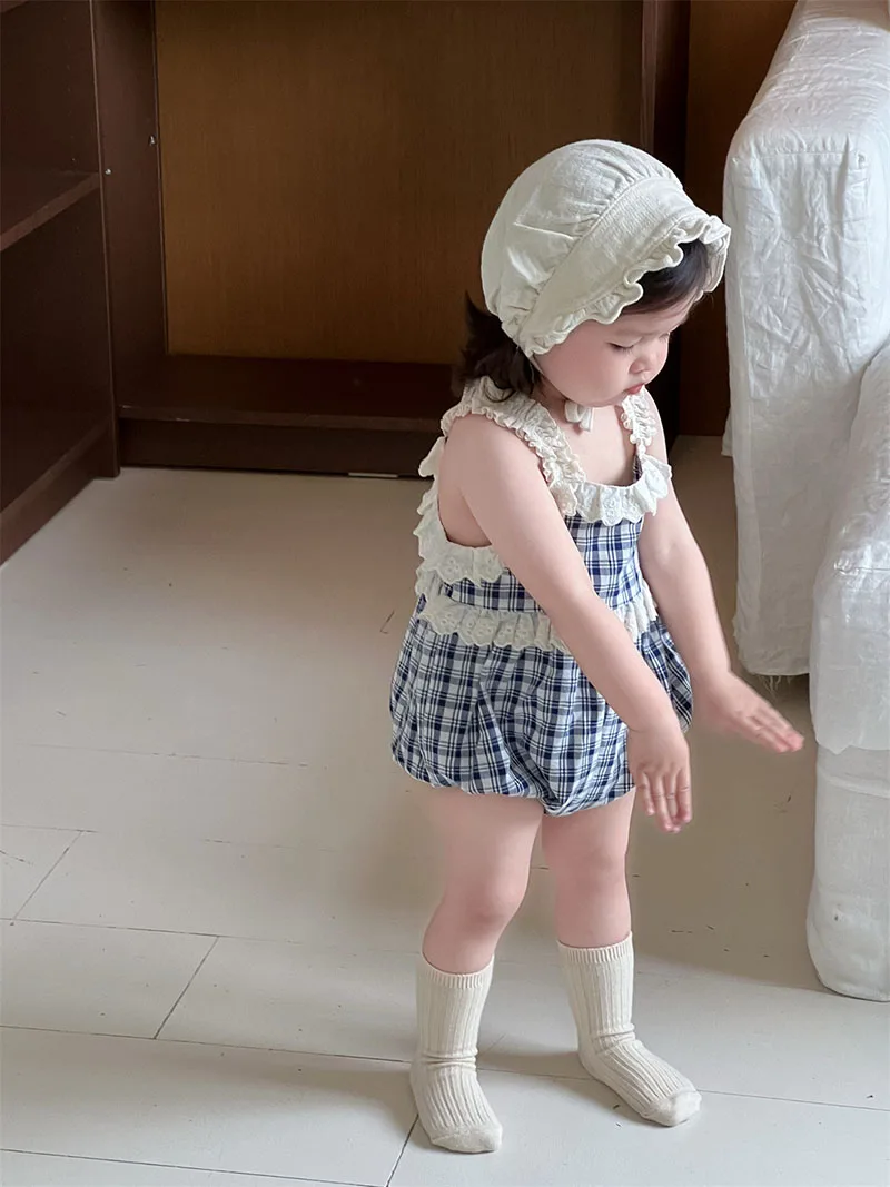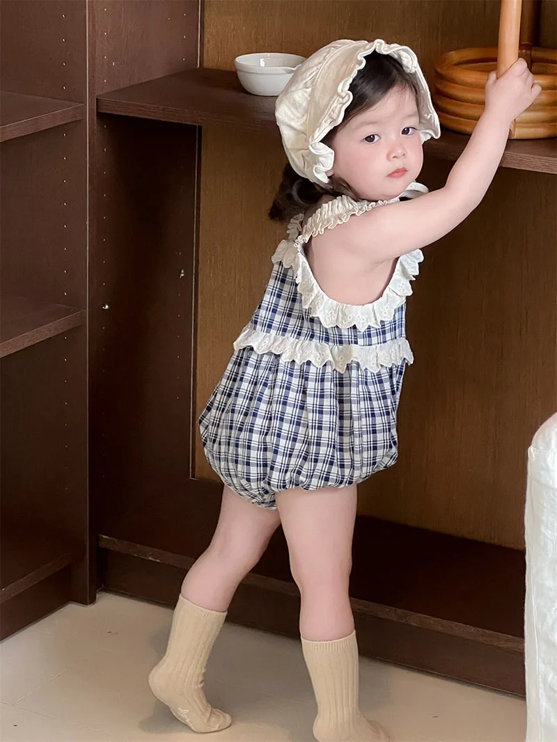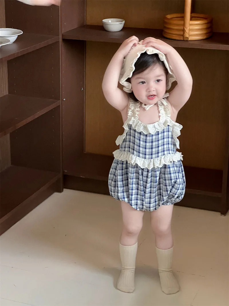 1.**Encantador diseño a cuadros**: este mameluco halter de verano para bebés de 3 a 24 meses presenta un patrón a cuadros clásico.El diseño a cuadros azules y blancos le da un aspecto elegante y atemporal, haciendo de su bebé el centro de atención.