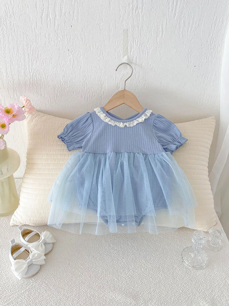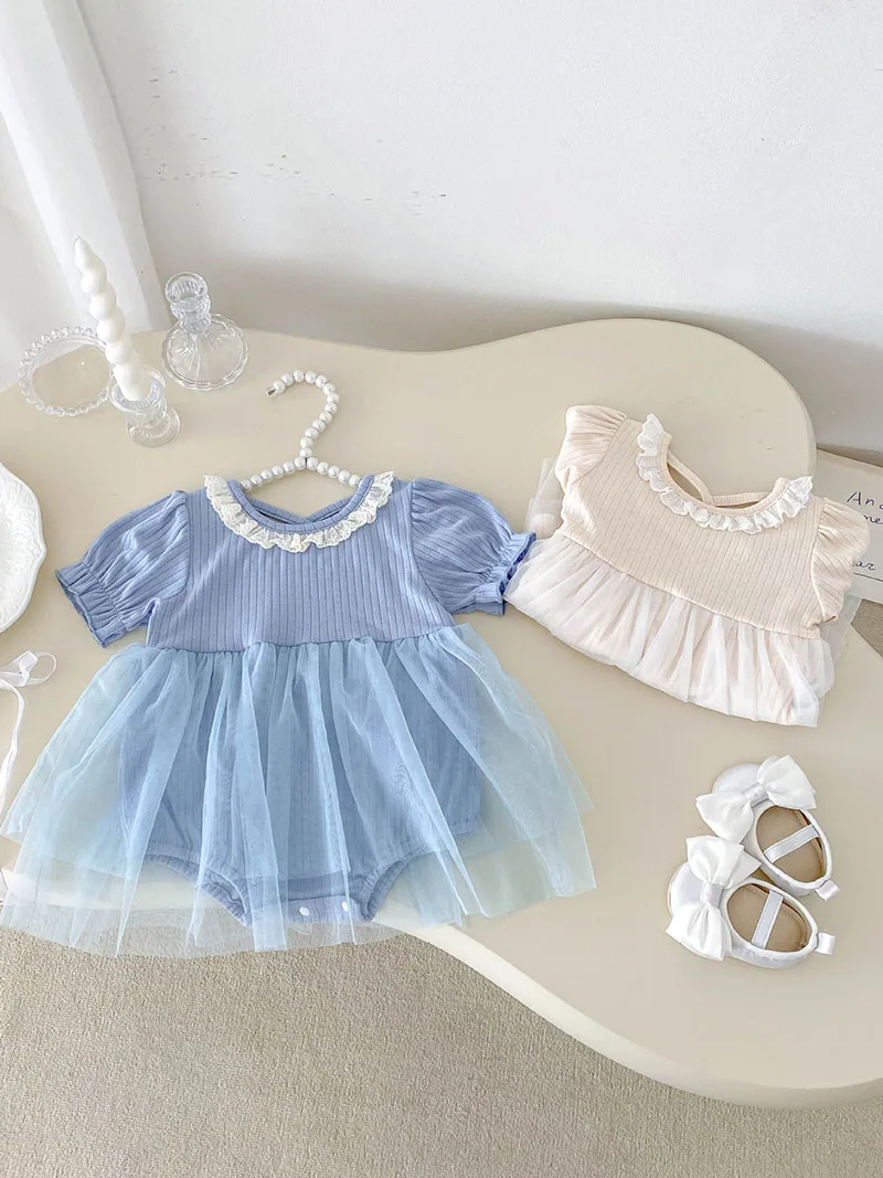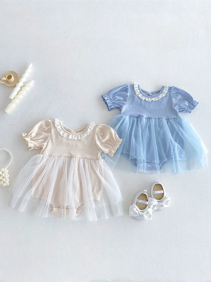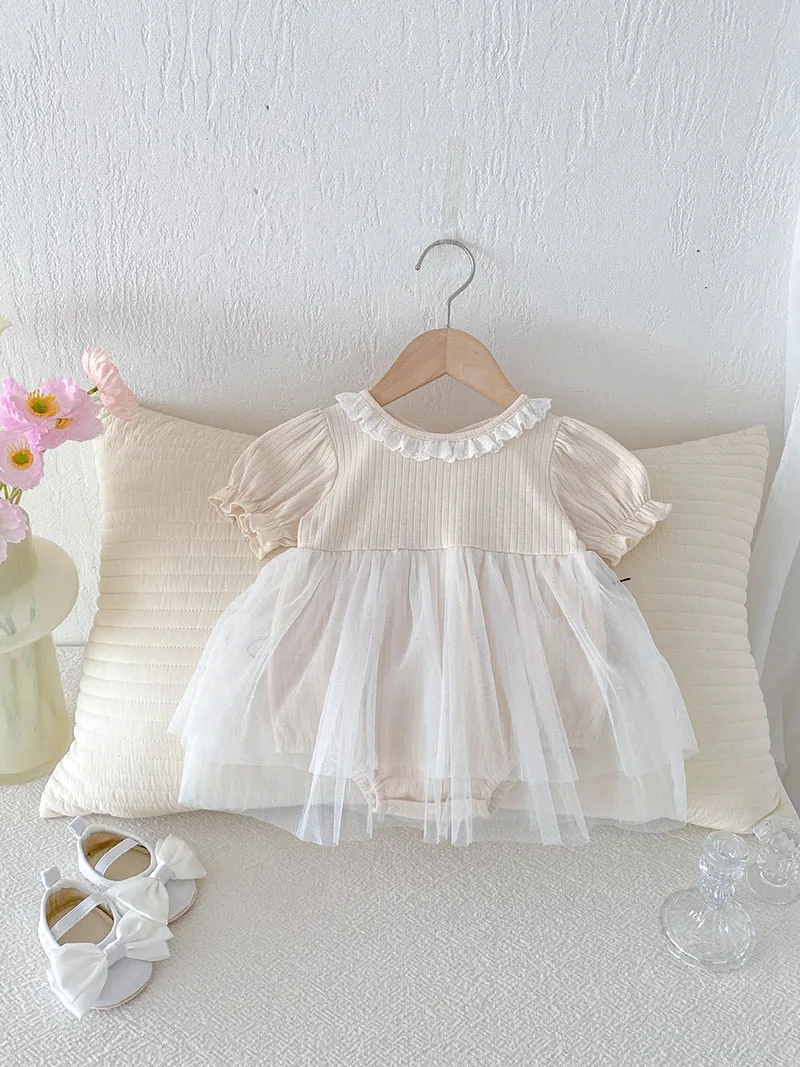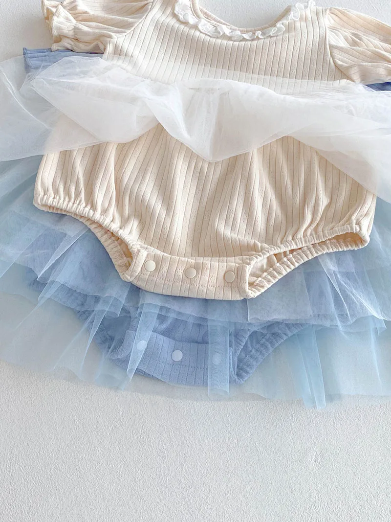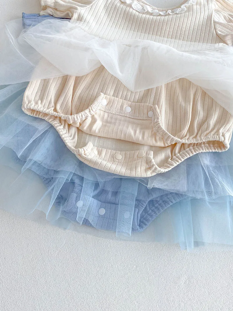 1.**Diseño adorable y elegante**: estos mamelucos para bebé presentan una encantadora combinación de tela acanalada en la parte superior y una falda de tul fluida.El delicado cuello con volantes añade un toque de dulzura, mientras que las mangas abullonadas realzan la ternura general.Disponibles en suaves colores pastel como beige y azul, son perfectos para bebés de 0 a 3 años.