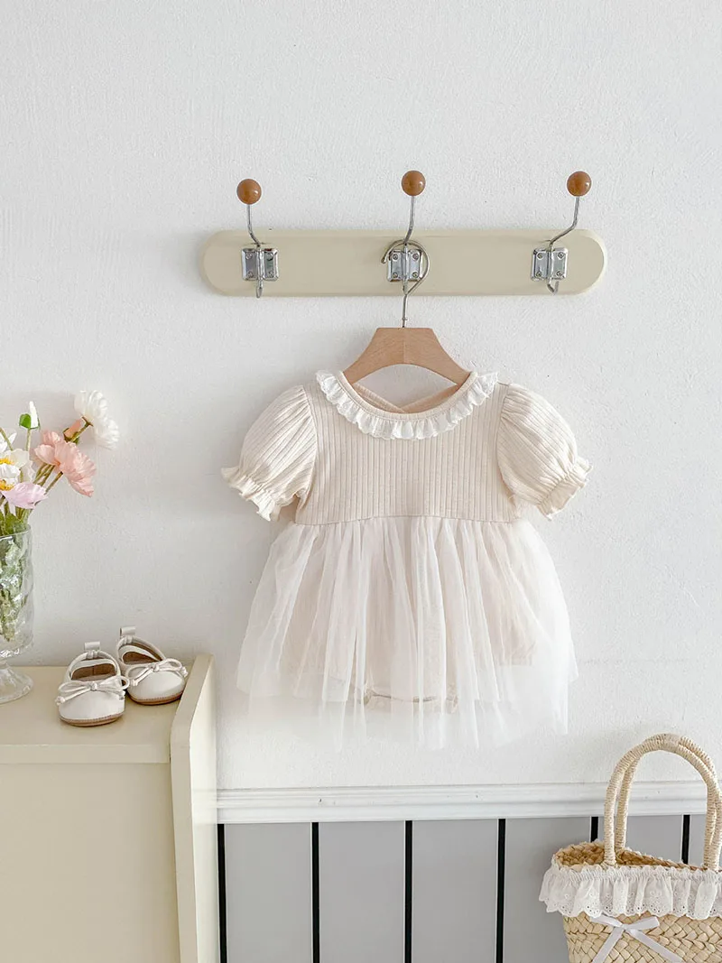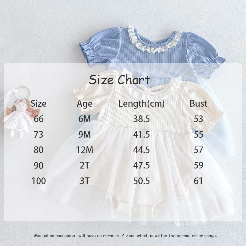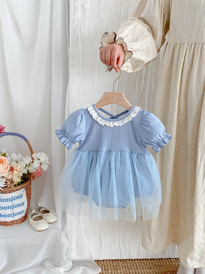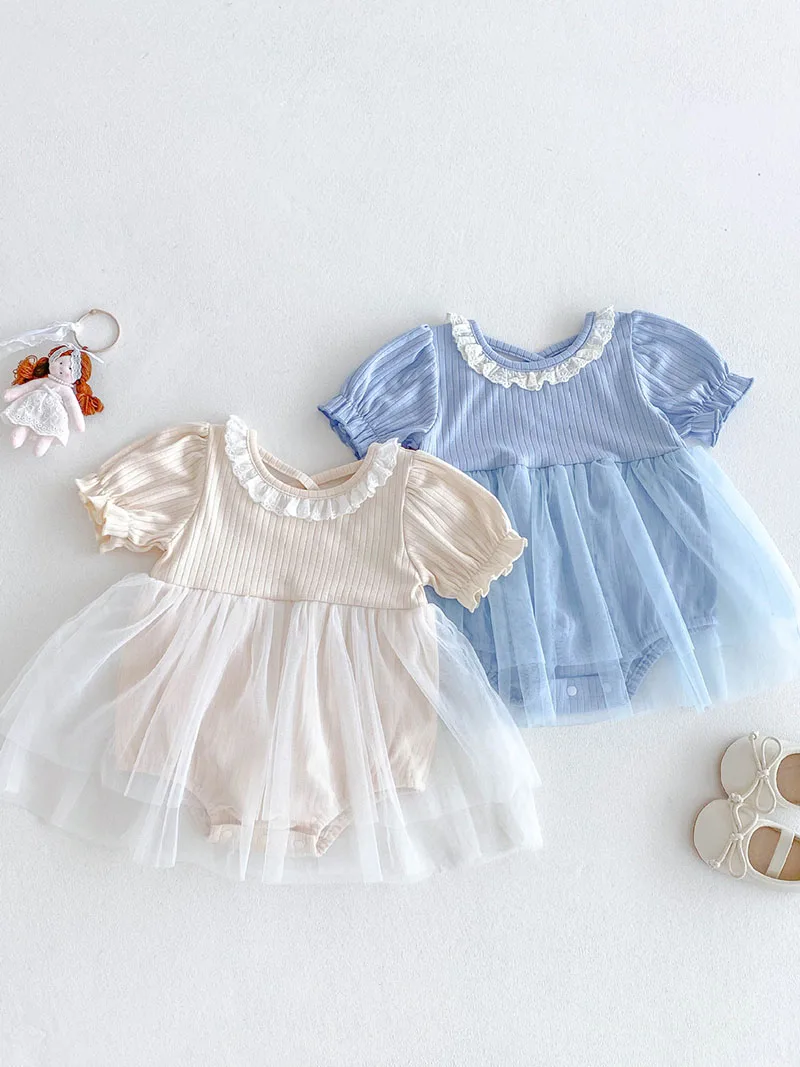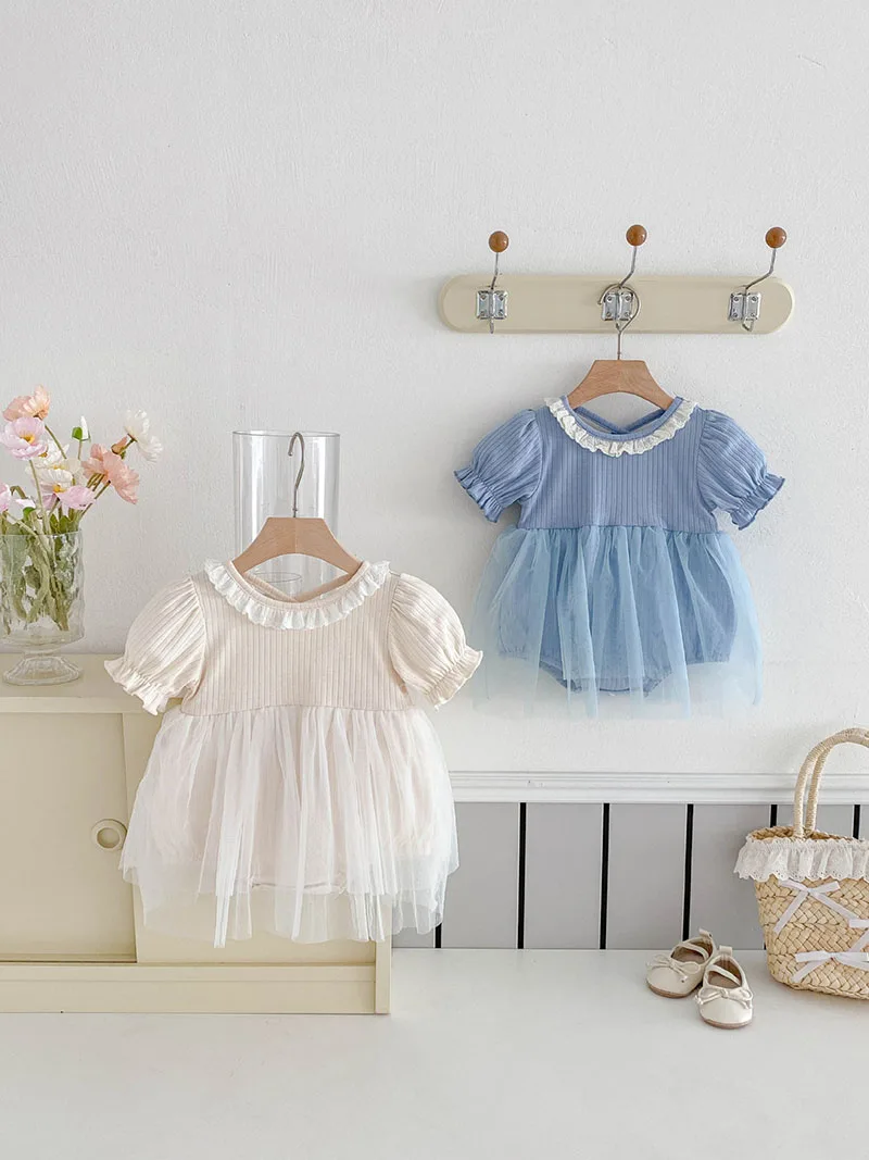 1.**Diseño adorable y elegante**: estos mamelucos para bebé presentan una encantadora combinación de tela acanalada en la parte superior y una falda de tul fluida.El delicado cuello con volantes añade un toque de dulzura, mientras que las mangas abullonadas realzan la ternura general.Disponibles en suaves colores pastel como beige y azul, son perfectos para bebés de 0 a 3 años.
