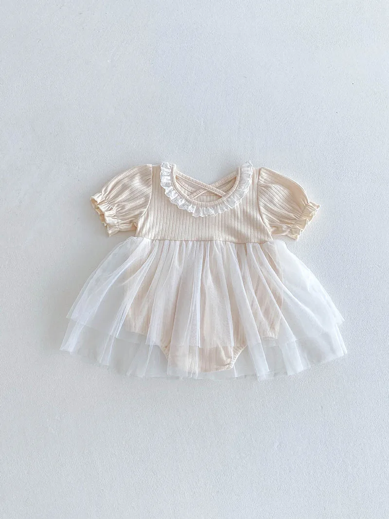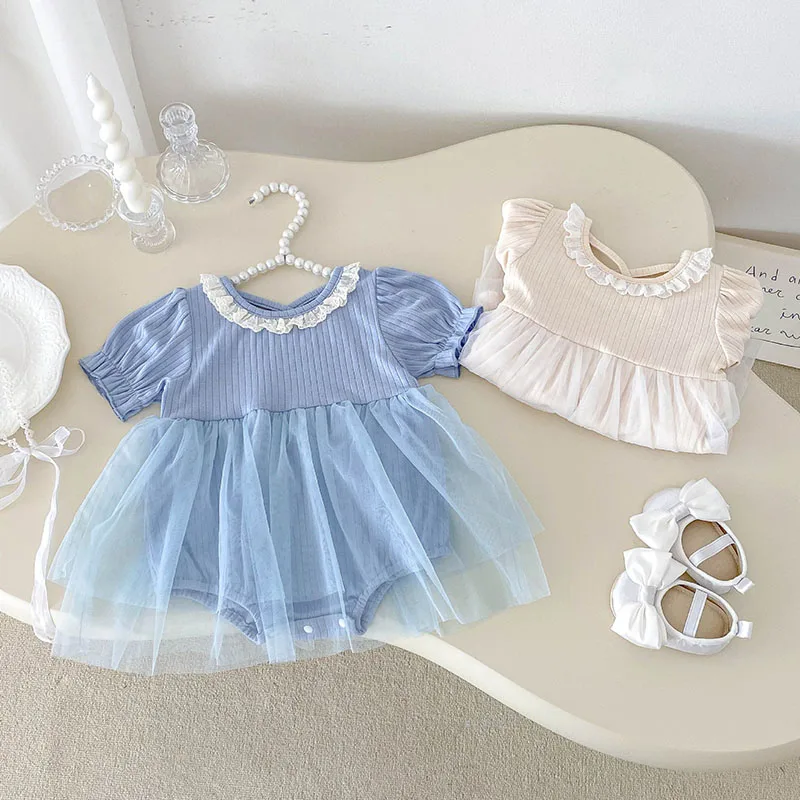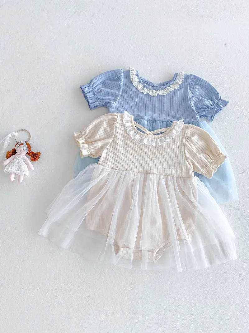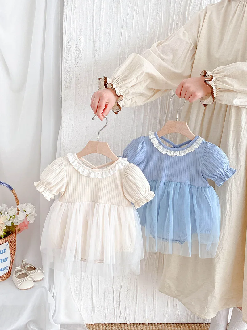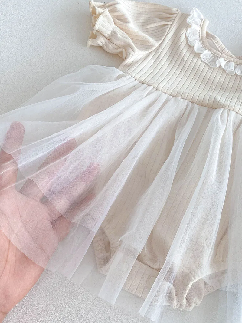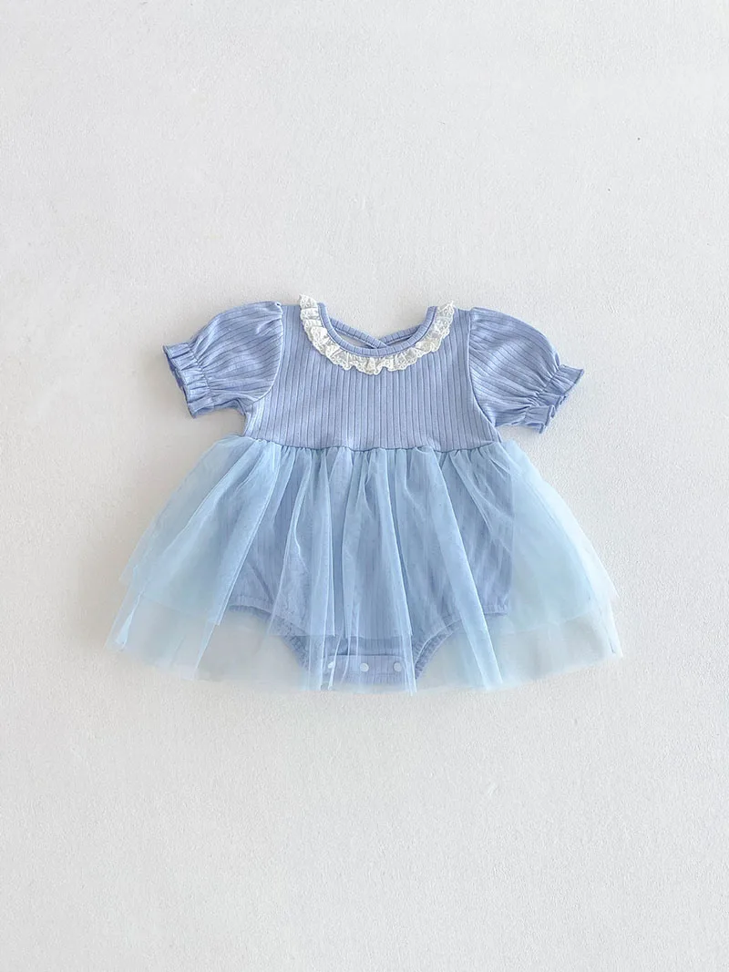 1.**Diseño adorable y elegante**: estos mamelucos para bebé presentan una encantadora combinación de tela acanalada en la parte superior y una falda de tul fluida.El delicado cuello con volantes añade un toque de dulzura, mientras que las mangas abullonadas realzan la ternura general.Disponibles en suaves colores pastel como beige y azul, son perfectos para bebés de 0 a 3 años.