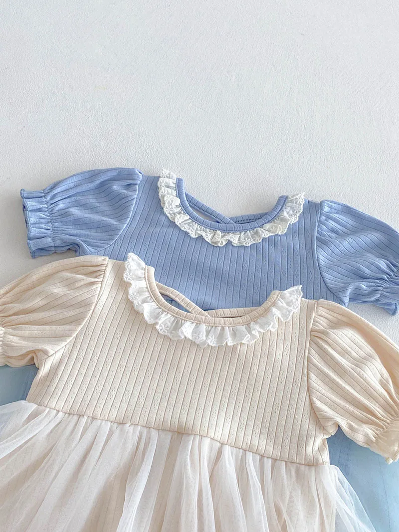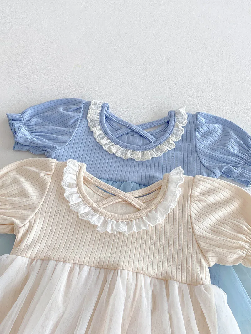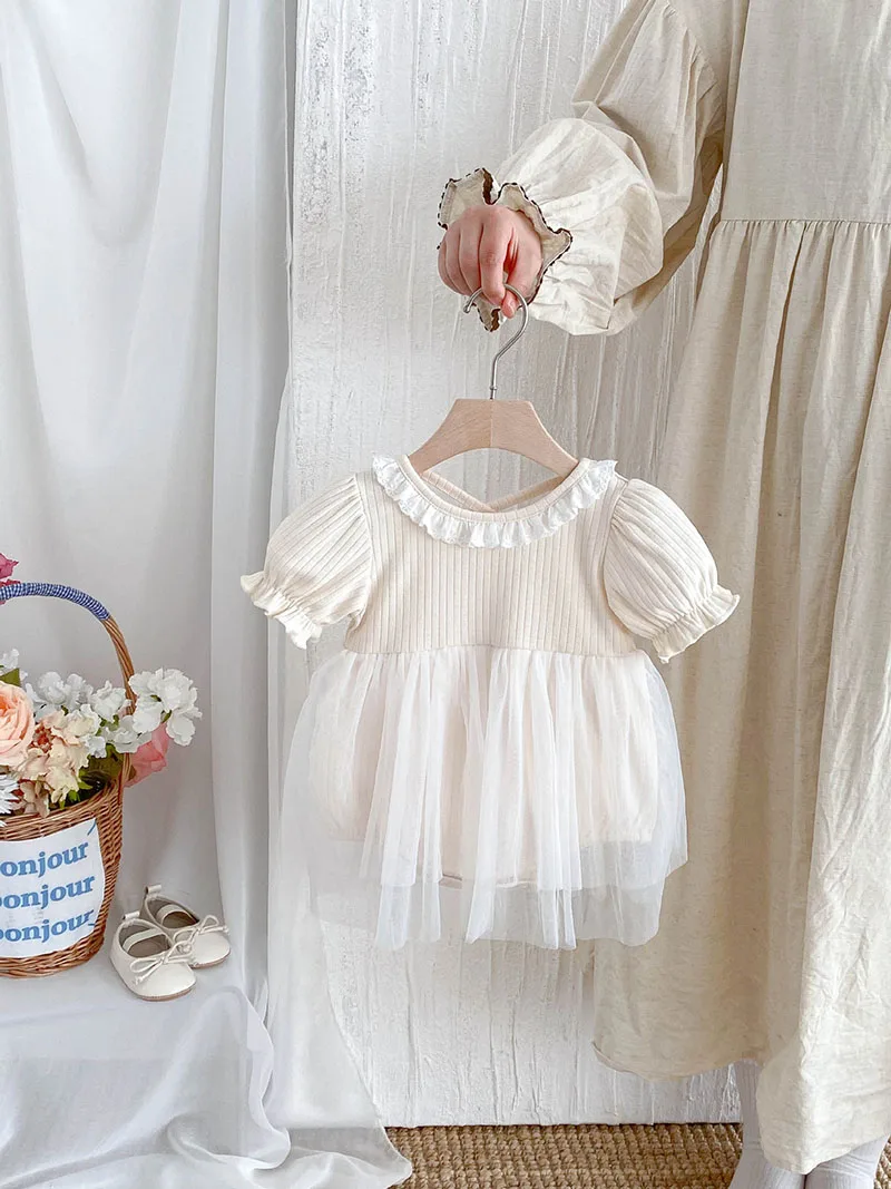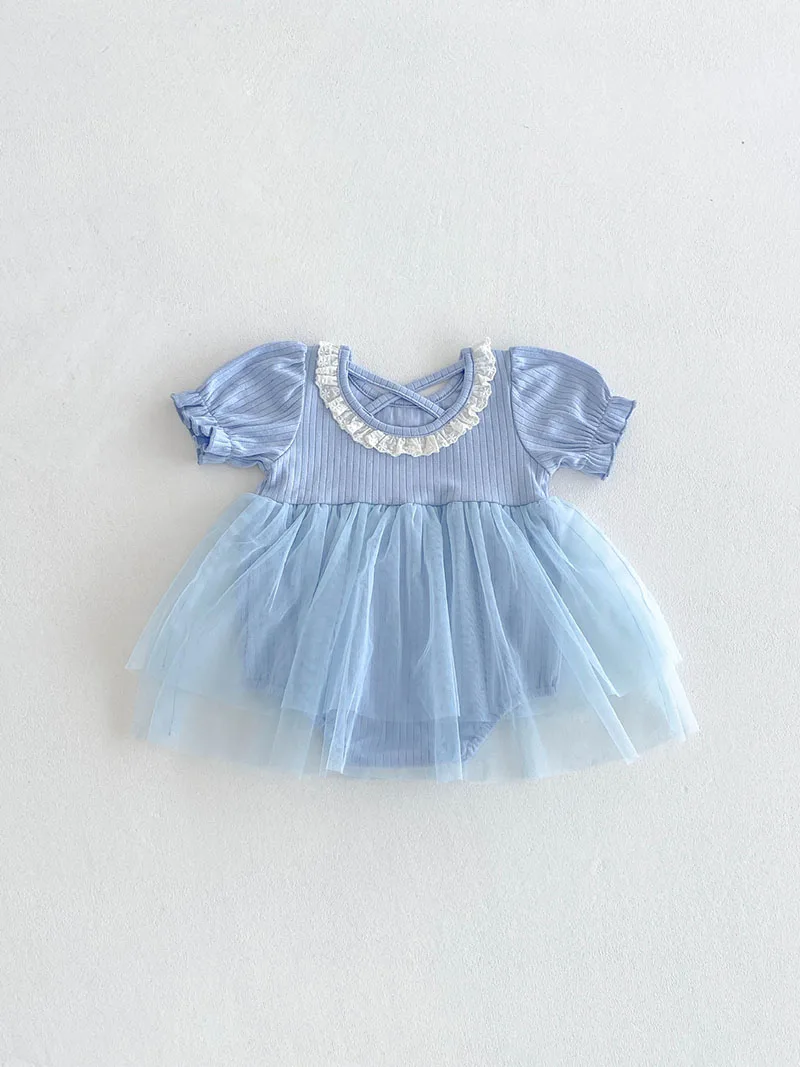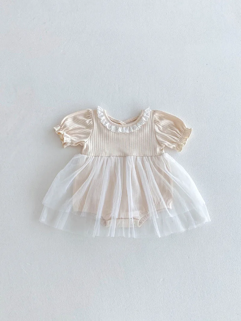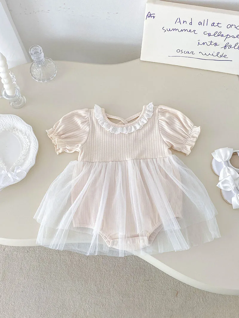 1.**Diseño adorable y elegante**: estos mamelucos para bebé presentan una encantadora combinación de tela acanalada en la parte superior y una falda de tul fluida.El delicado cuello con volantes añade un toque de dulzura, mientras que las mangas abullonadas realzan la ternura general.Disponibles en suaves colores pastel como beige y azul, son perfectos para bebés de 0 a 3 años.