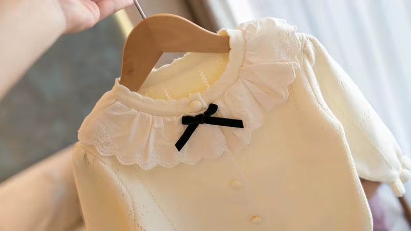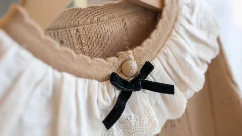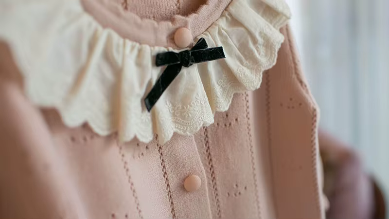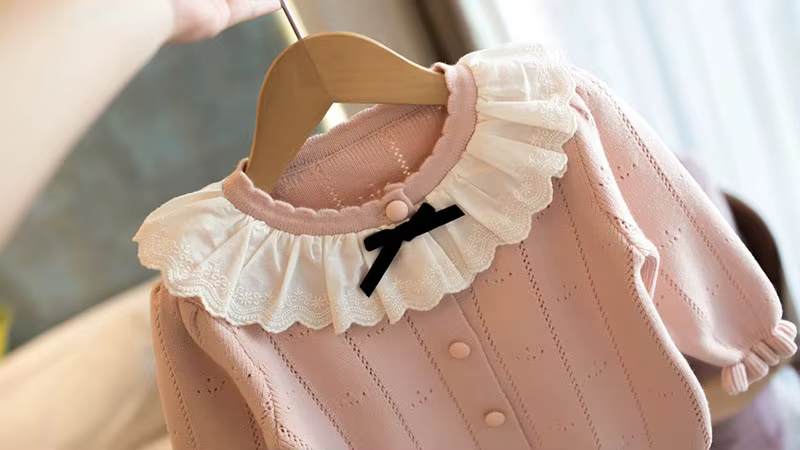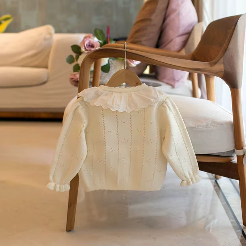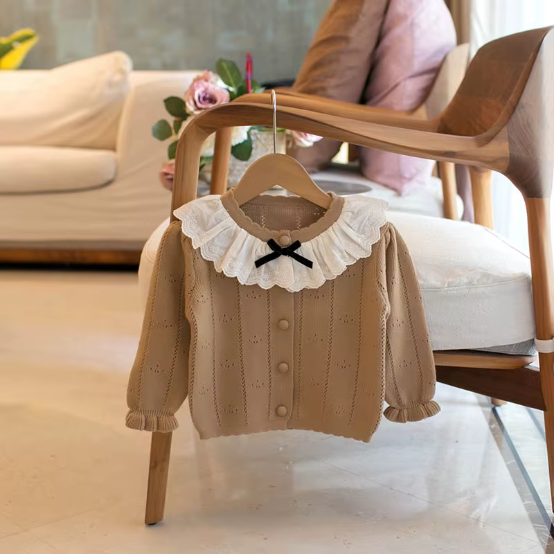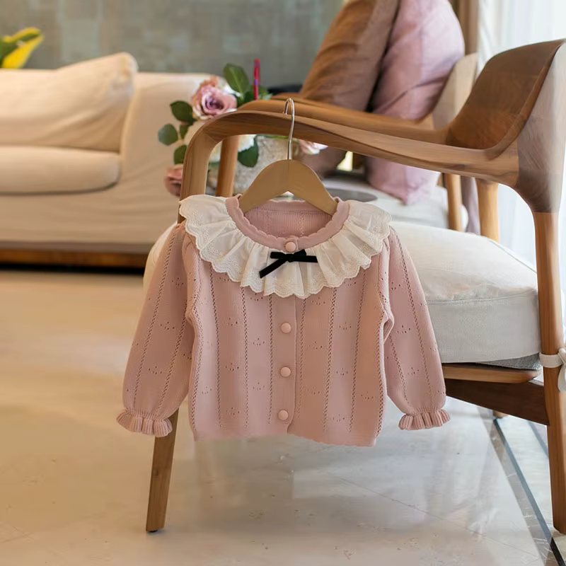 1. **Charming Ruffle Collar with Bow**:The sweater features a sweet ruffle collar adorned with a black bow, adding an elegant and cute touch that appeals to parents looking for adorable kids' clothing.