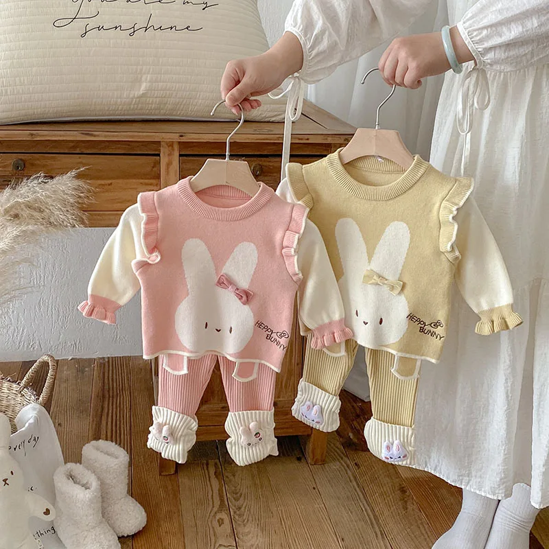 Comprar MILANCEL, nuevo conjunto de ropa de otoño para bebé, 6-24M, bloque de Color de conejito de dibujos animados, camisa para niñas pequeñas + Pantalones, suéter bonito infantil, 2 uds.