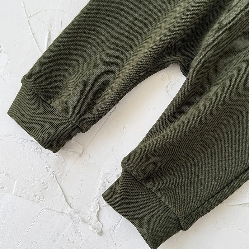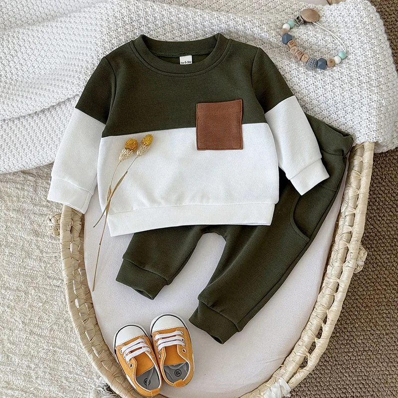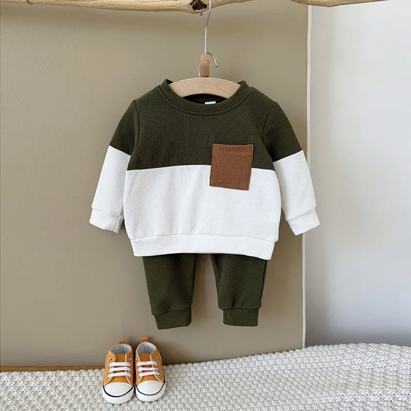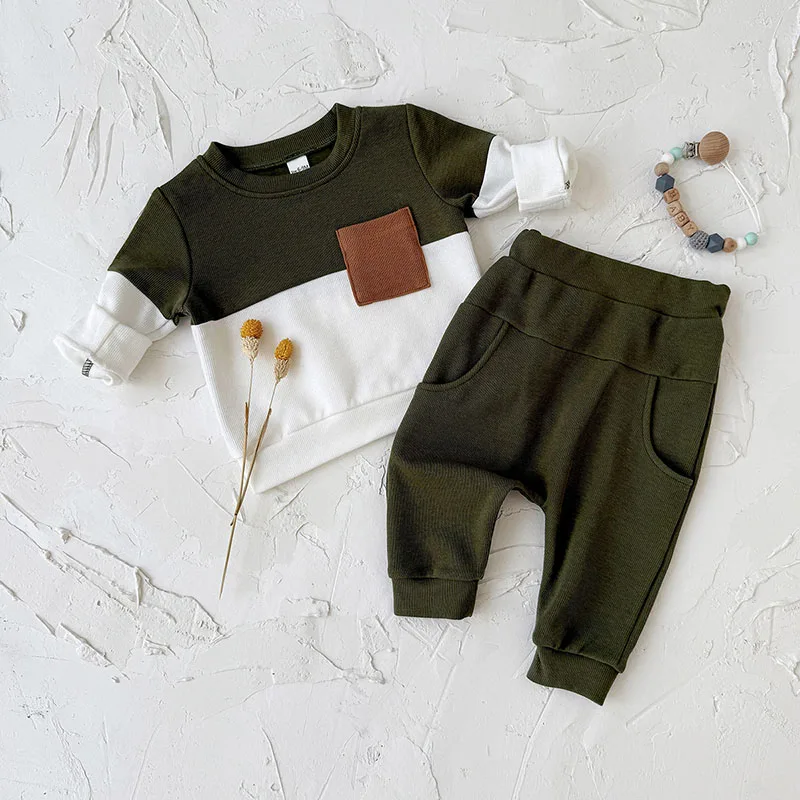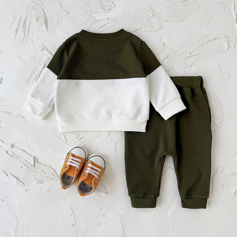 *"Ya no tendrás que adivinar qué combinar: este conjunto incluye una sudadera color block y pantalones verde oliva.¡Ahorre tiempo y energía para divertirse más con su bebé!"*