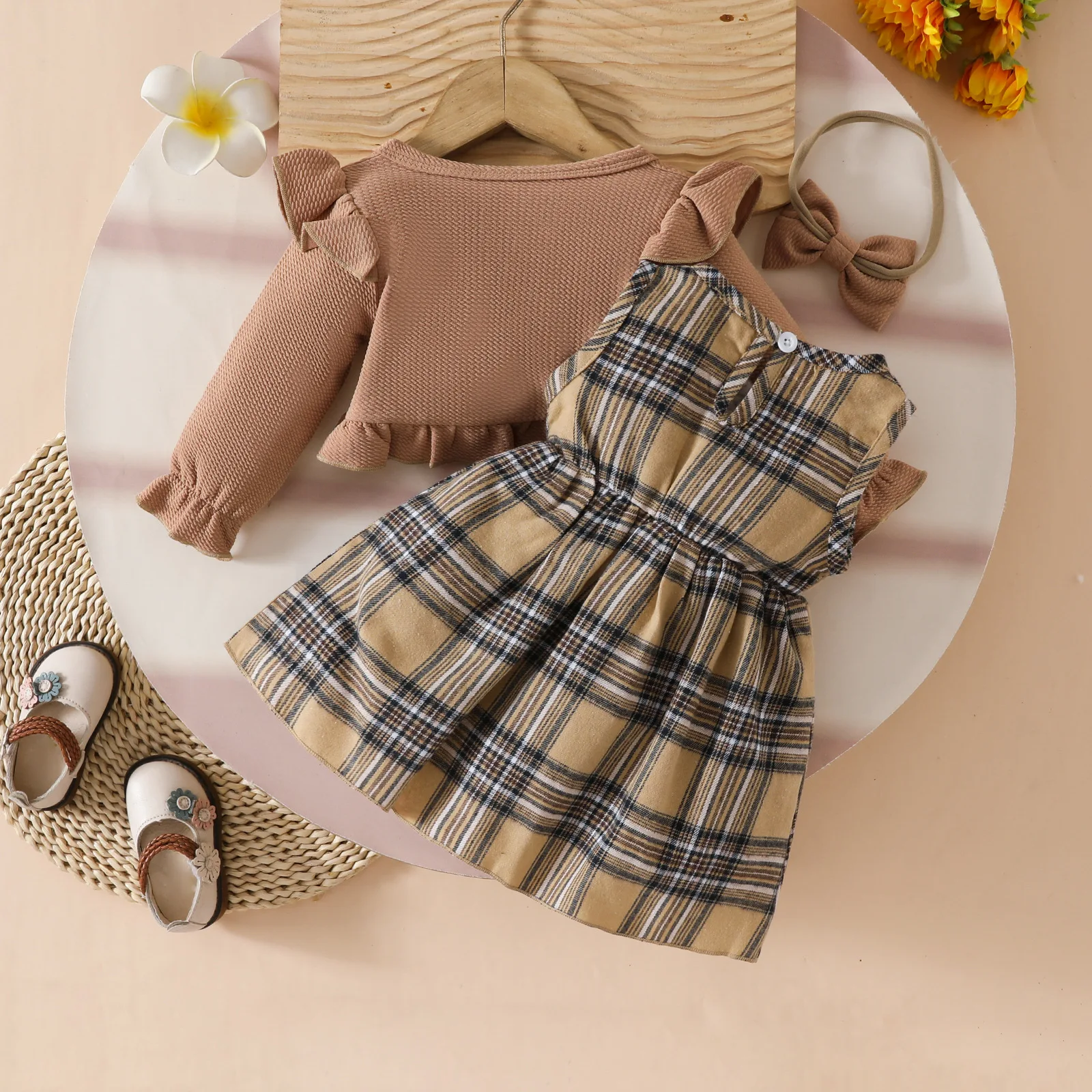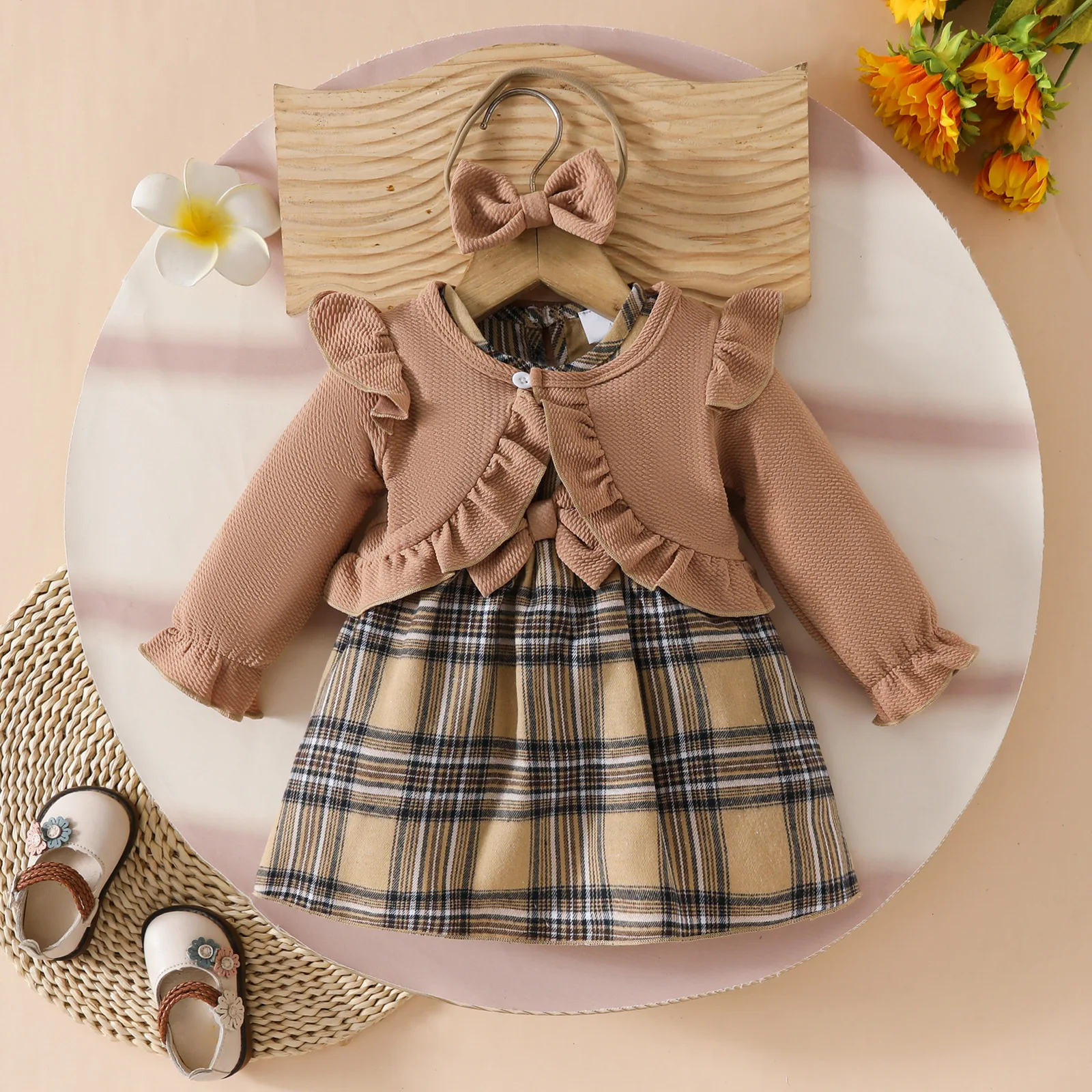 Este conjunto presenta un abrigo de manga larga, un vestido tipo chaleco y una diadema, creando una apariencia dulce y elegante.El abrigo de estilo corto añade un toque moderno, mientras que el vestido tipo chaleco con bonitos diseños y la delicada diadema realzan la ternura general.