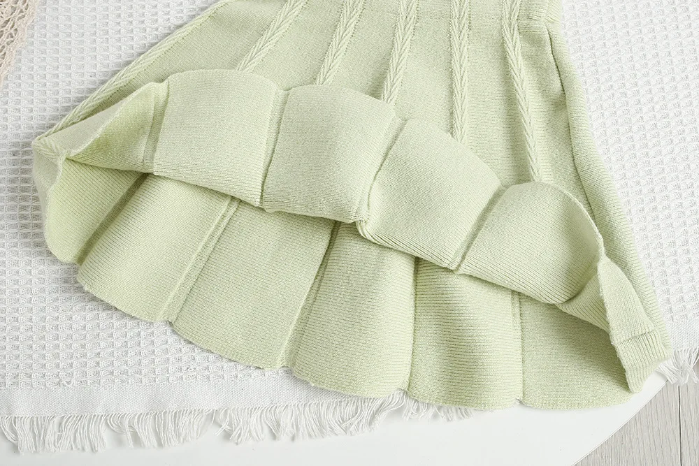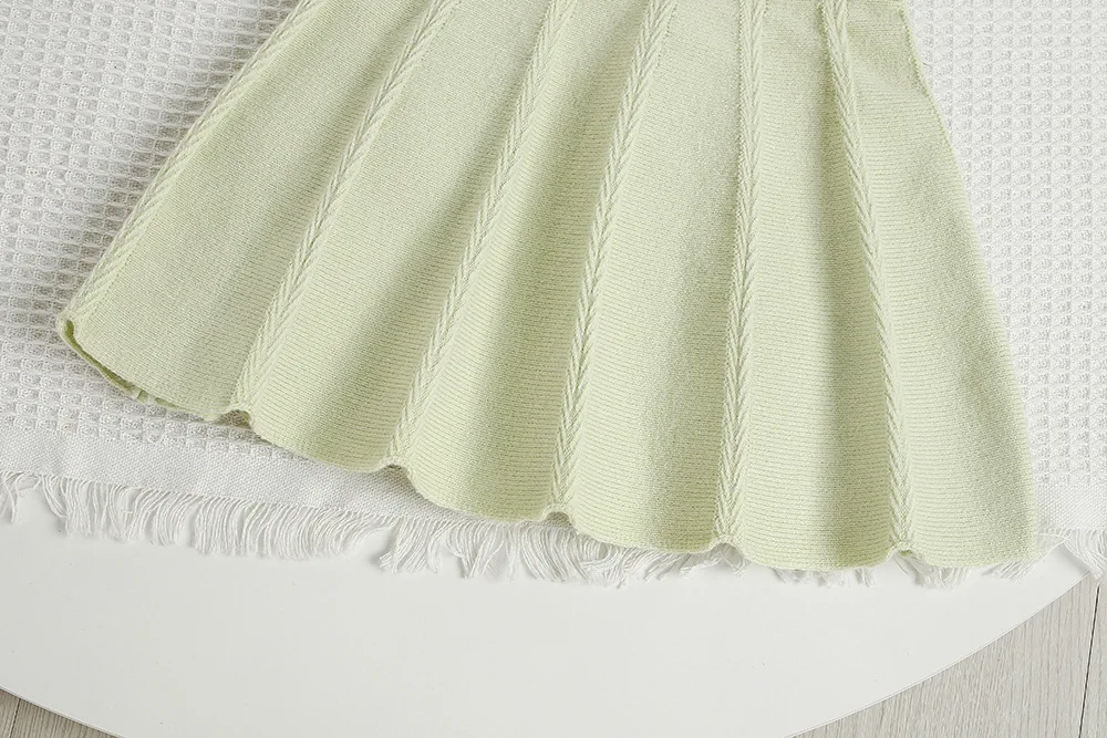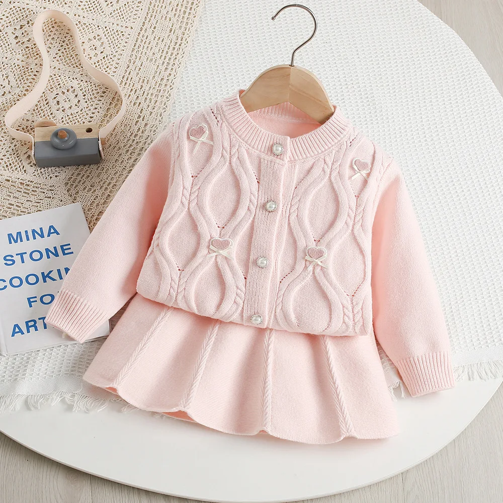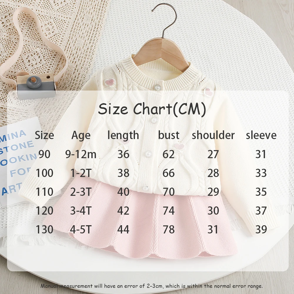 1.**Lindo diseño de conjunto de punto**: Viene como un conjunto coordinado de un cárdigan de punto y una falda corta, que ofrece un atuendo elegante y fácil de usar para las niñas.