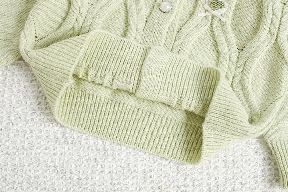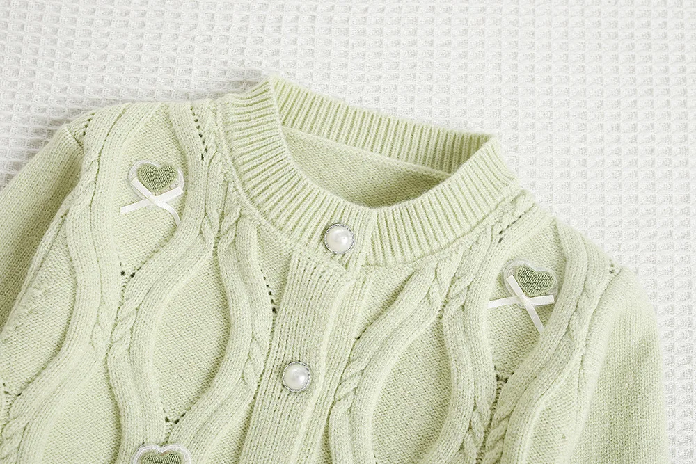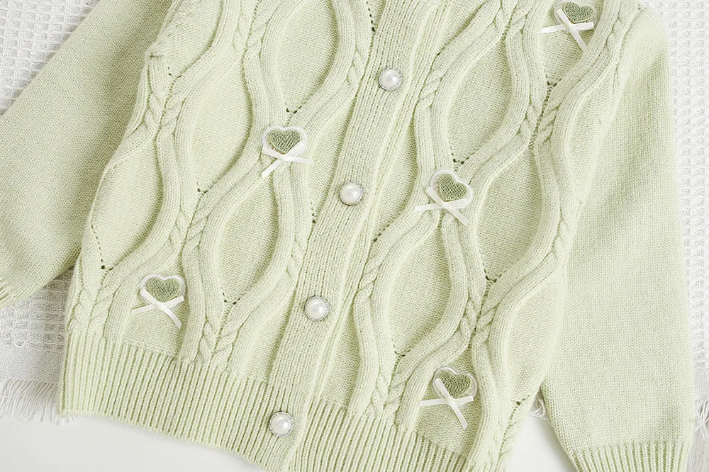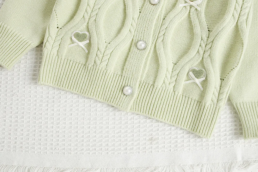 3.**Detalles de corazón y lazo**: Los adorables adornos de corazón y lazo en el cárdigan realzan la ternura y feminidad del conjunto.