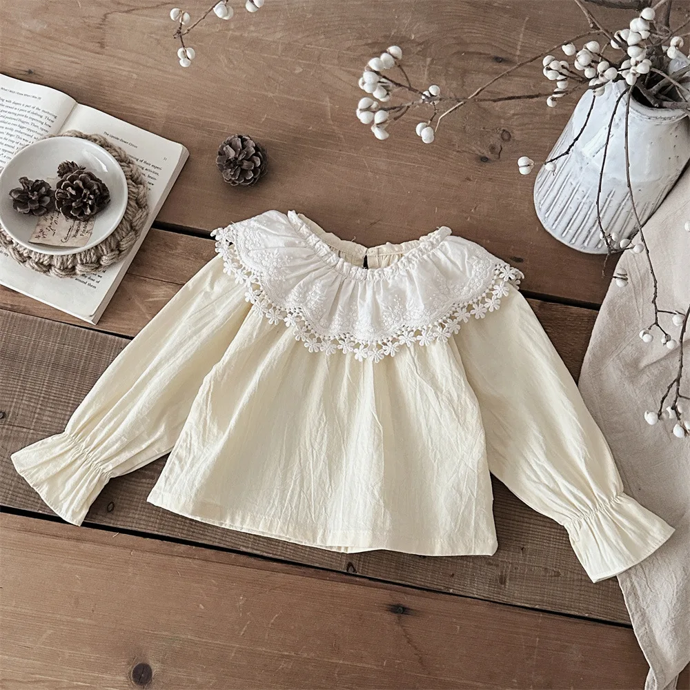 Comprar MILANCEL, nuevo conjunto de ropa de primavera para niñas, camisa con cuello de encaje para bebés, pantalones de pierna ancha de Color sólido para niños pequeños, traje para bebés