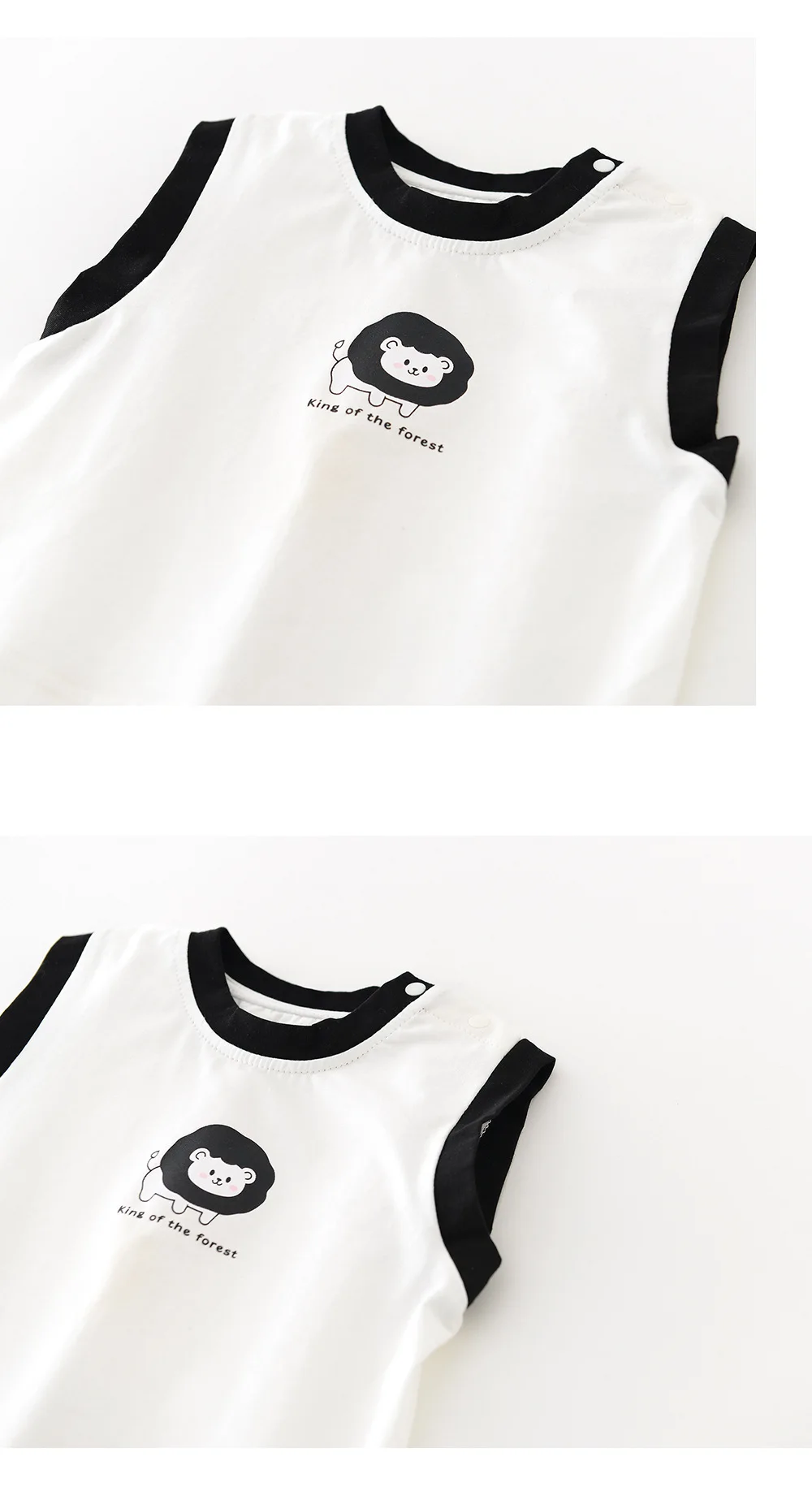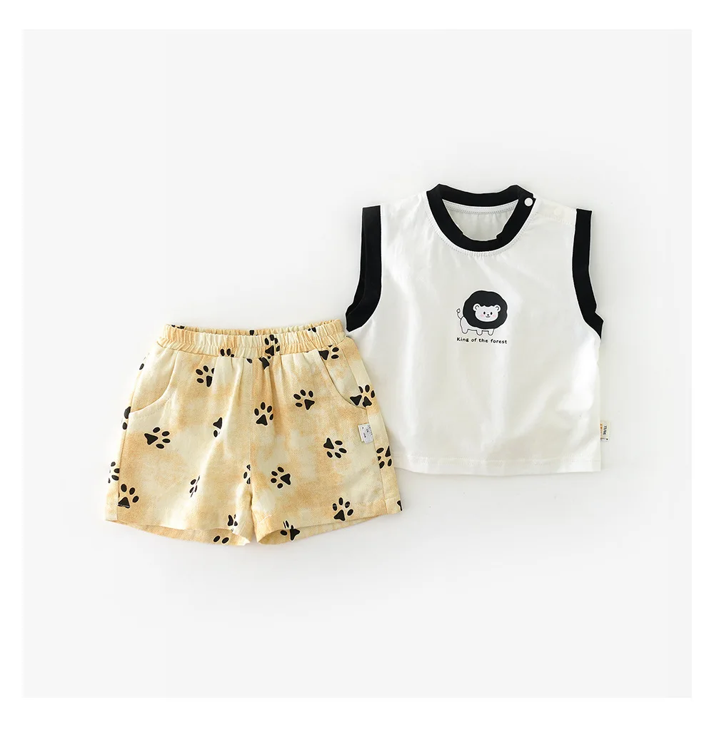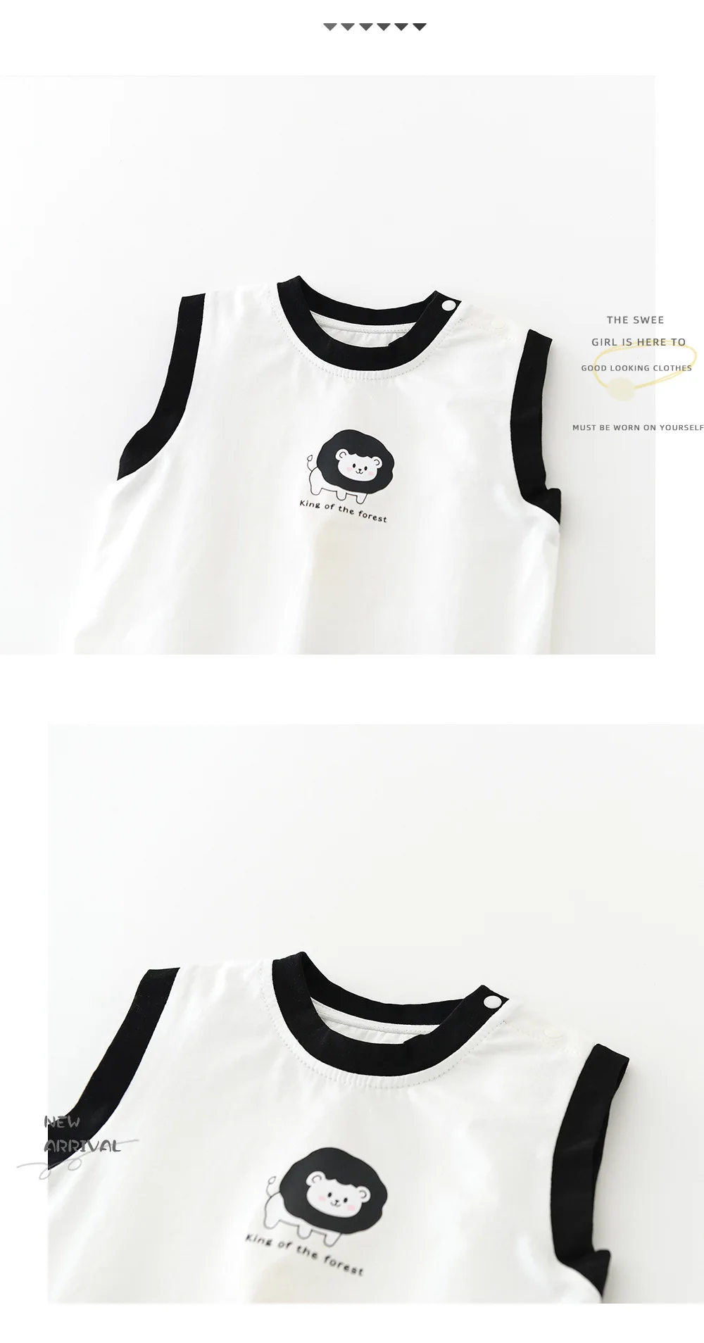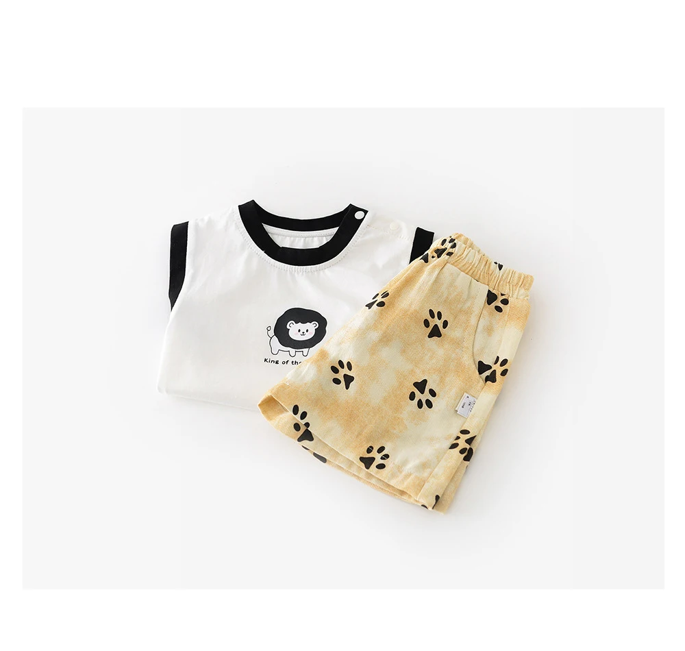 1.**Adorable diseño de dibujos animados**: este conjunto de dos piezas presenta un lindo gráfico de león en la blusa blanca sin mangas con las palabras "Re del bosque", y los pantalones cortos están decorados con un divertido patrón de estampado de patas.Es perfecto para añadir un toque divertido al guardarropa de tu bebé.