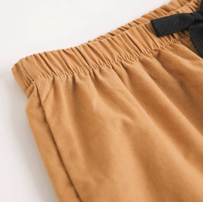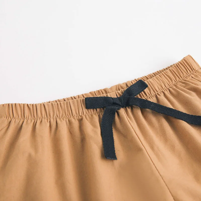2.**Pantalones cortos cómodos y elegantes**: Los pantalones cortos caqui a juego cuentan con una cintura elástica con cordón negro para un fácil ajuste, lo que garantiza un ajuste cómodo.El diseño simple pero elegante también hace que sean fáciles de combinar con otras blusas.