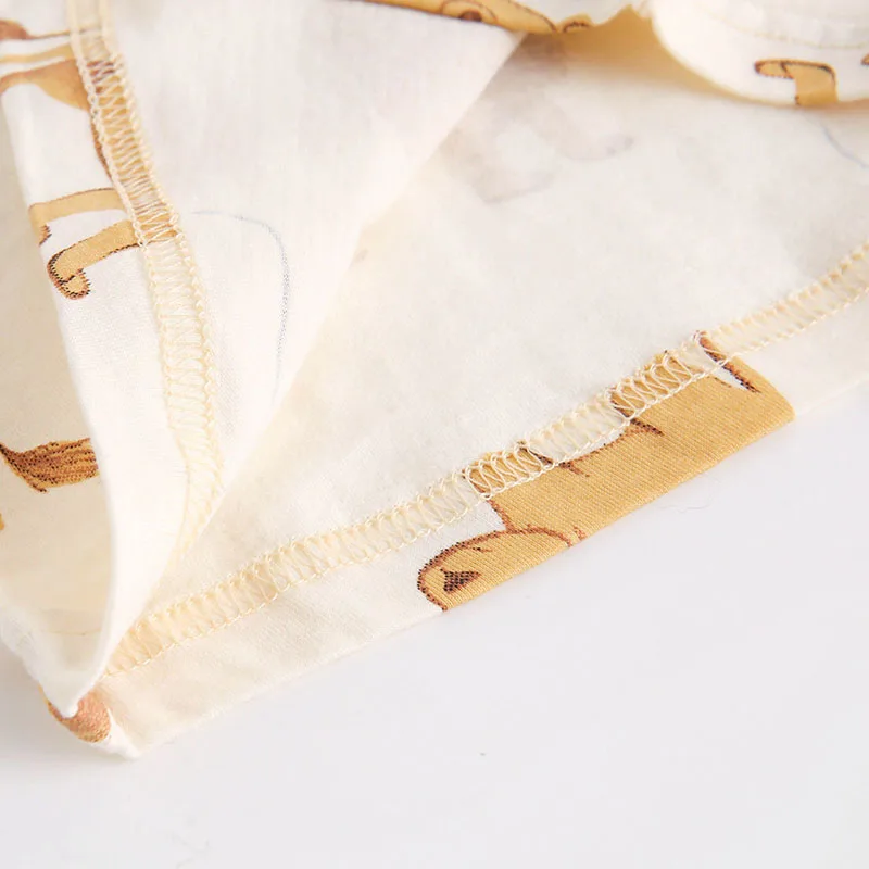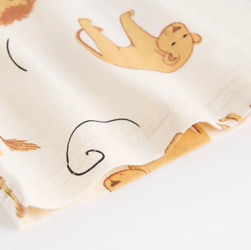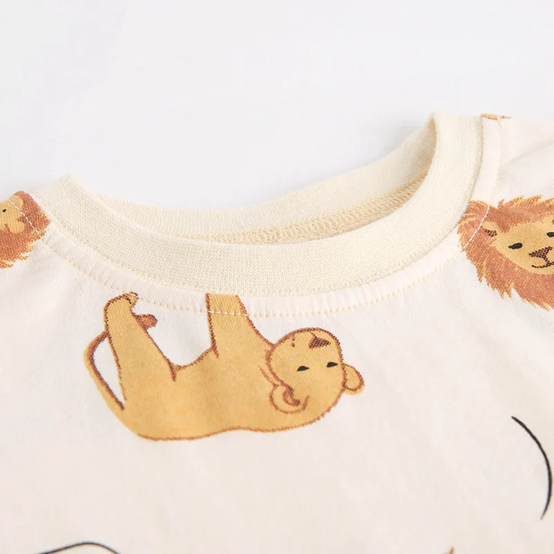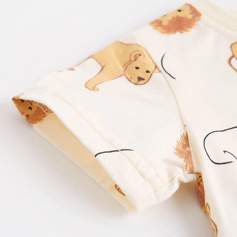1.**Lindo camiseta con estampado de leones**:Este conjunto de verano para niños de 1 a 5 años incluye una camiseta con un estampado completo de lindos leones en varias posturas.Los divertidos patrones de león en tonos marrones cálidos sobre un fondo claro añaden un encanto divertido y salvaje, haciendo que su hijo luzca adorable.