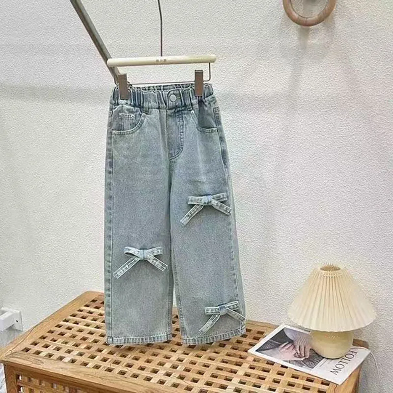 3.**Encantadores jeans de mezclilla**: Los jeans ligeros lavados con adornos de lazo en las piernas añaden un toque lindo y moderno.