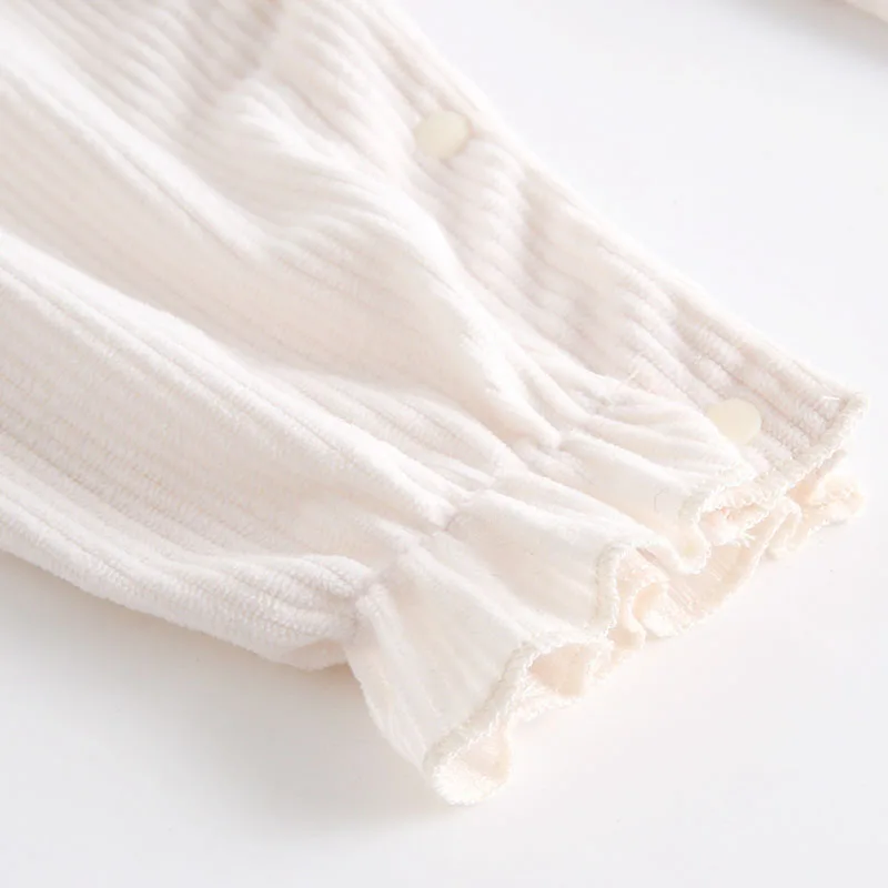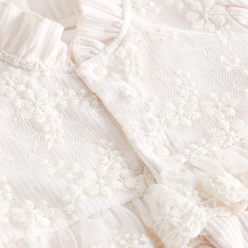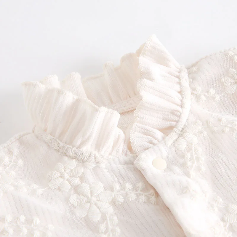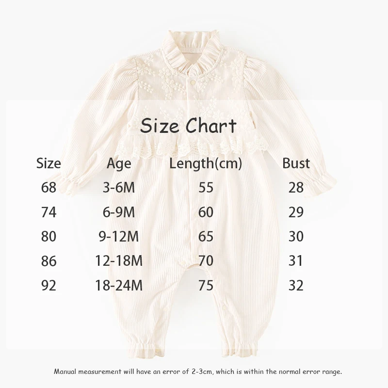 - **Detalles con volantes**: Los volantes en el cuello, los puños y las aberturas de las piernas mejoran la ternura general y hacen que el mameluco luzca más adorable.