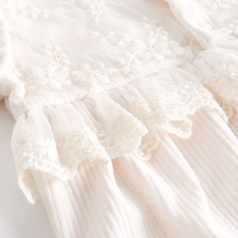- **Elegantes adornos florales de encaje**: Presenta delicados patrones florales de encaje en el pecho y adornos de encaje, agregando un toque elegante y femenino al mameluco.
