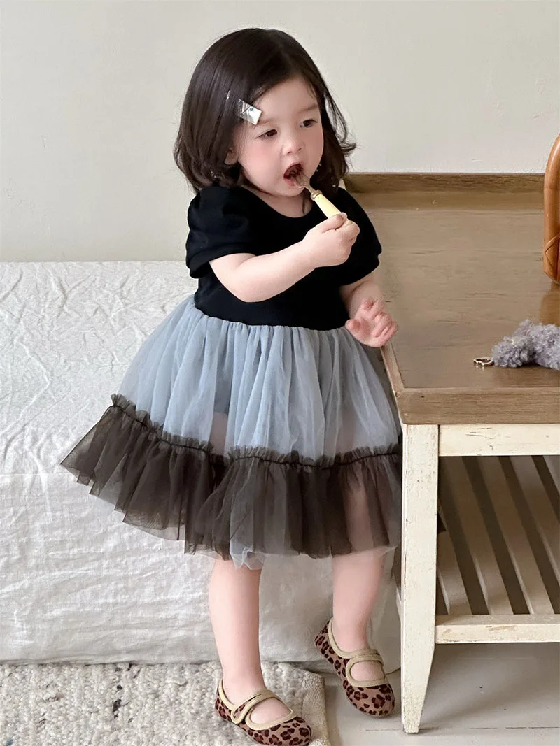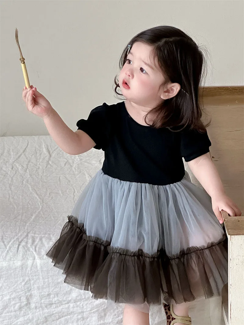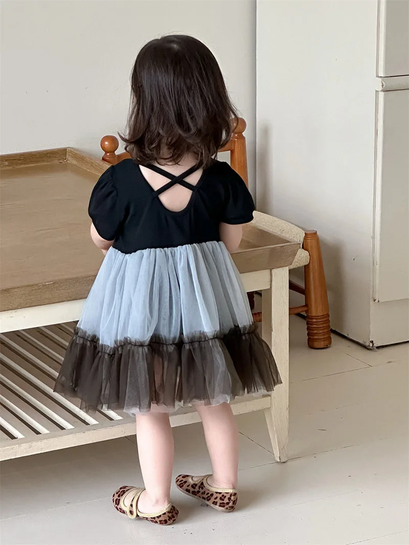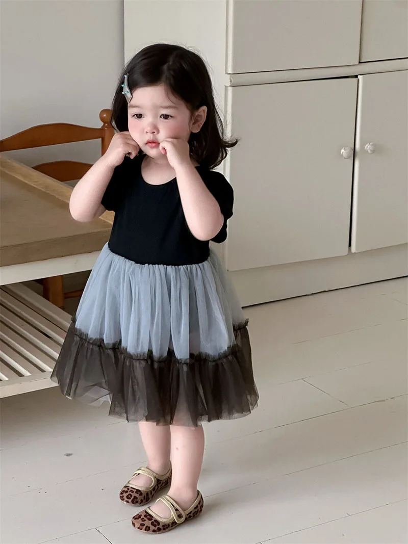 1.**Diseño de patchwork único**: este vestido de verano para bebés de 0 a 3 años presenta un estilo de patchwork distintivo.La combinación de un top negro con una falda de tul azul claro y marrón oscuro crea una apariencia moderna y llamativa.