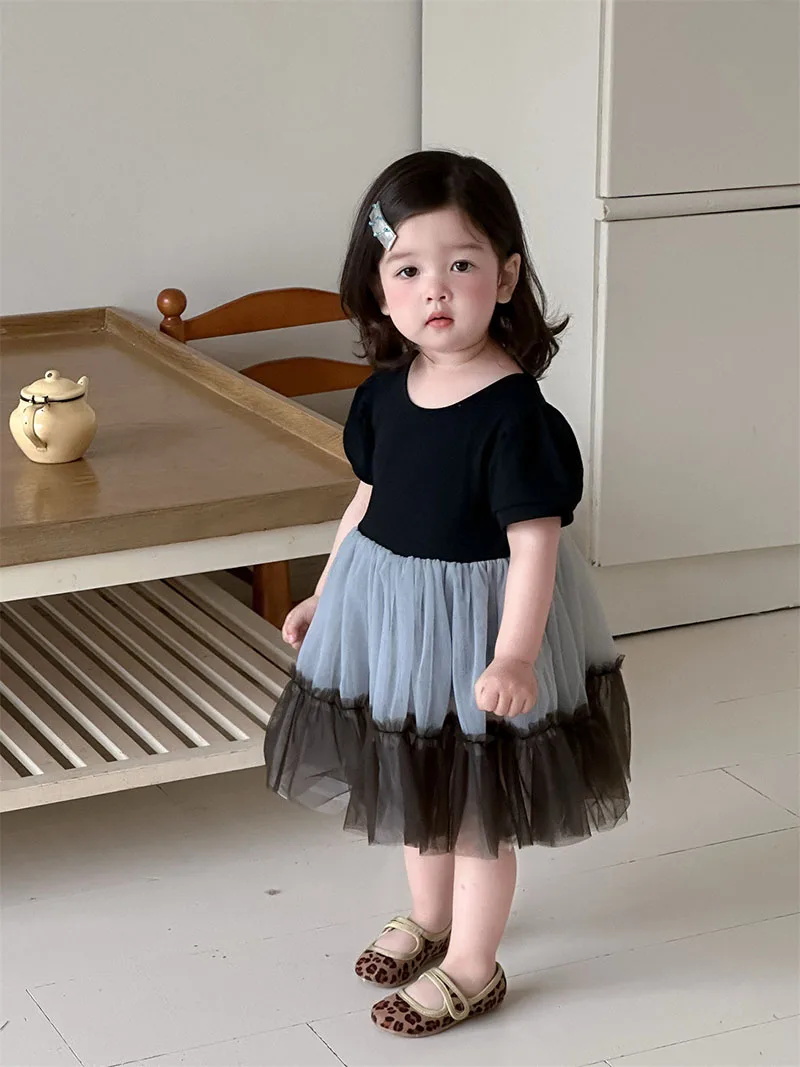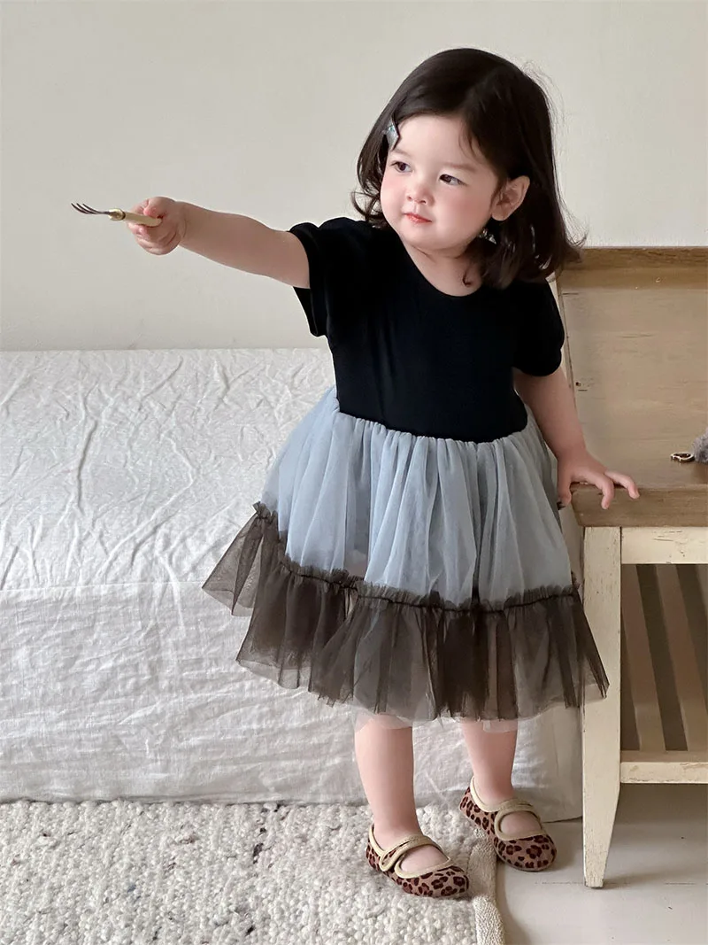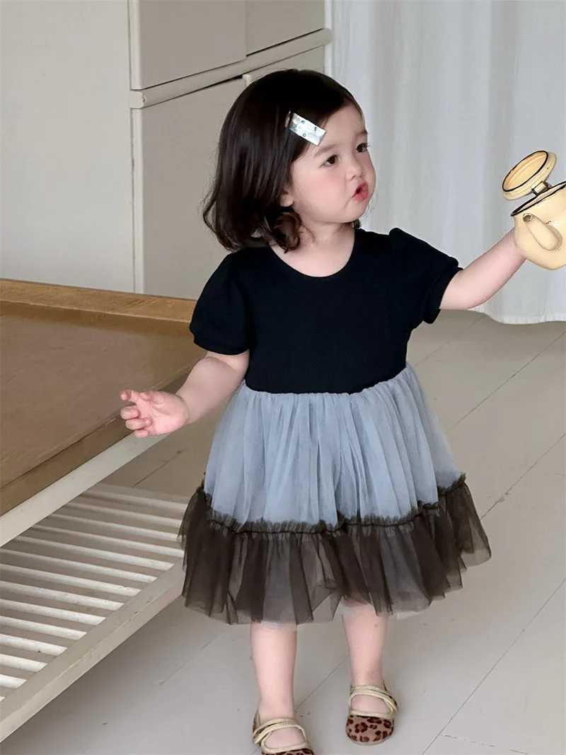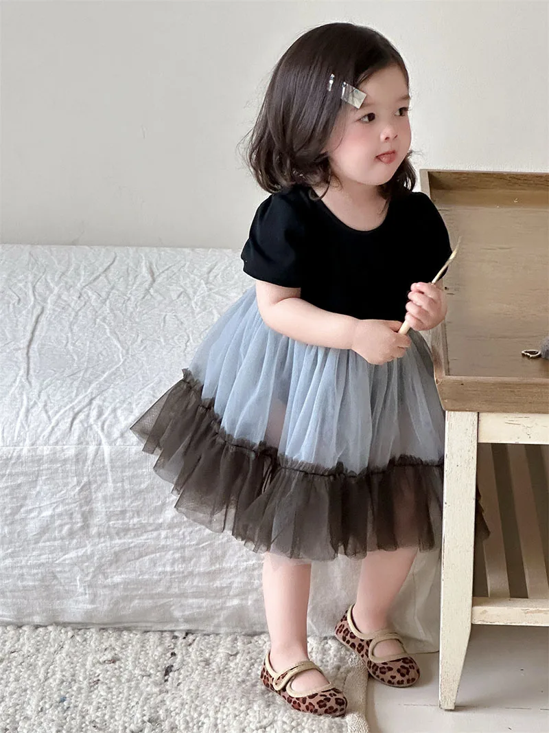 1.**Diseño de patchwork único**: este vestido de verano para bebés de 0 a 3 años presenta un estilo de patchwork distintivo.La combinación de un top negro con una falda de tul azul claro y marrón oscuro crea una apariencia moderna y llamativa.