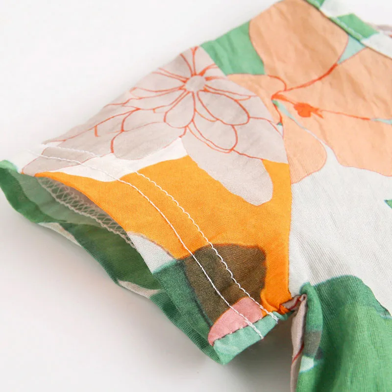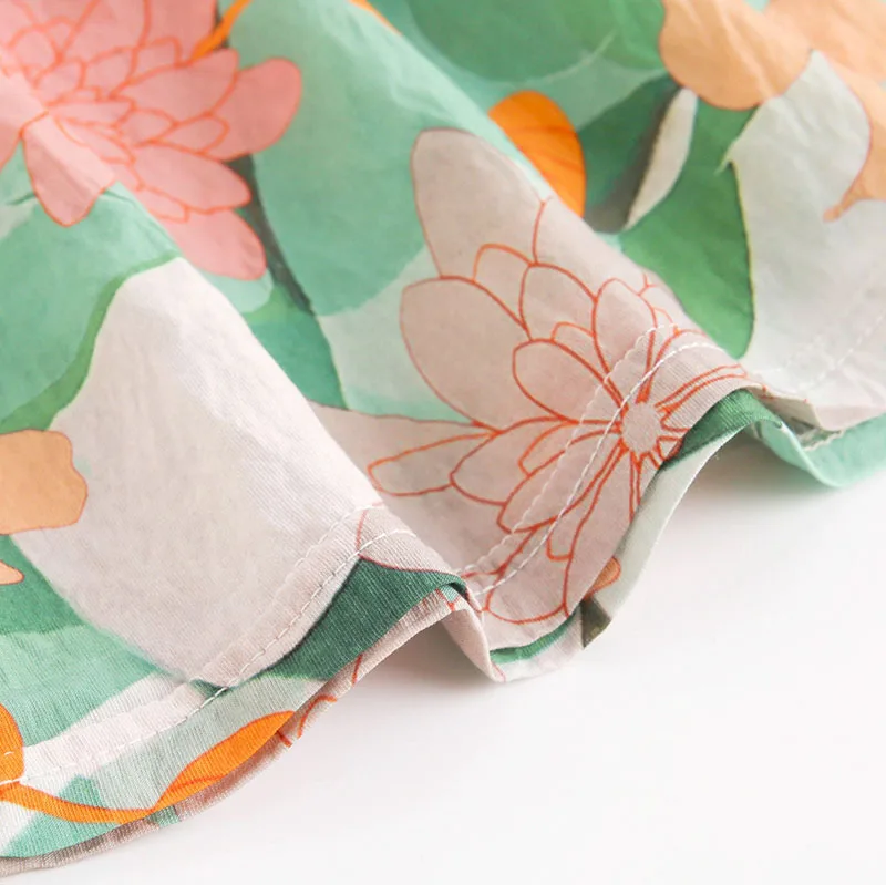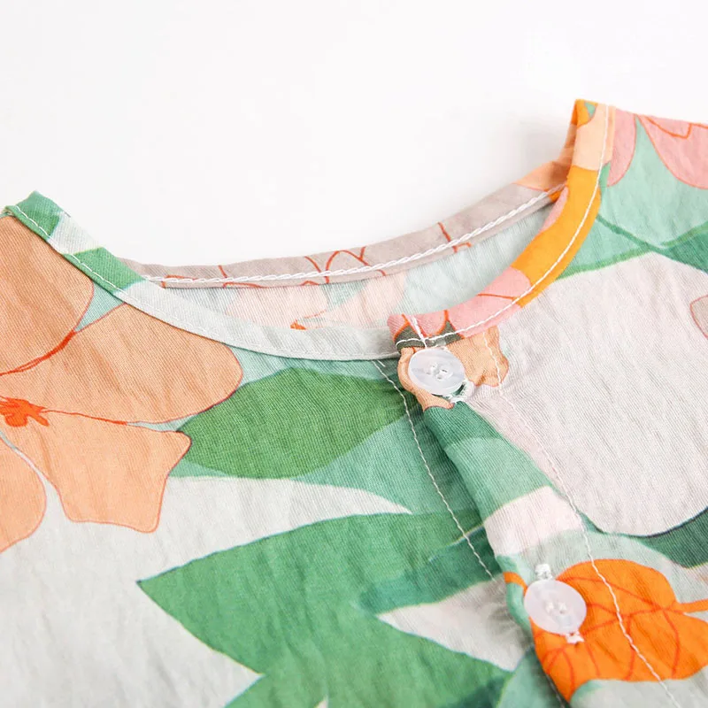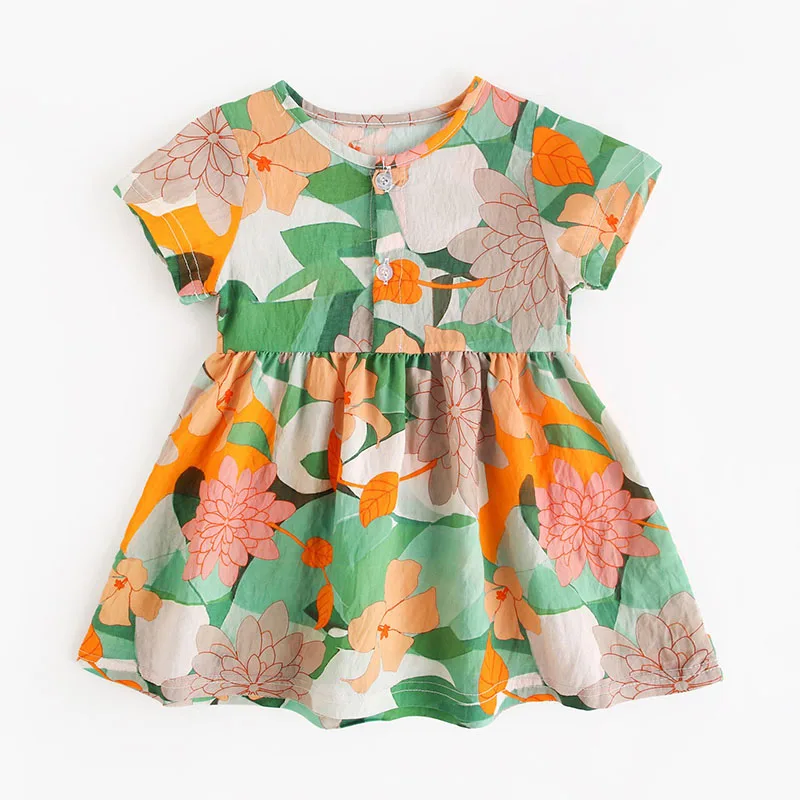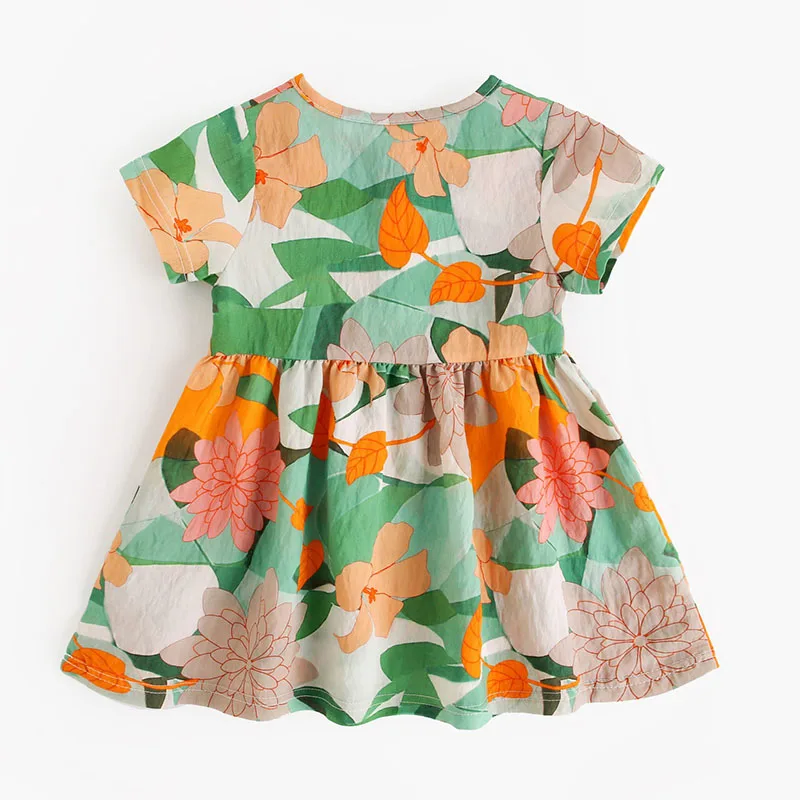 1.**Estampados florales vibrantes**:Estos vestidos de verano para niños de 1 a 5 años, presentan animados patrones florales.Las coloridas flores en tonos de rosa, naranja y verde sobre fondos claros crean una apariencia alegre y llamativa, perfecta para la temporada de verano.