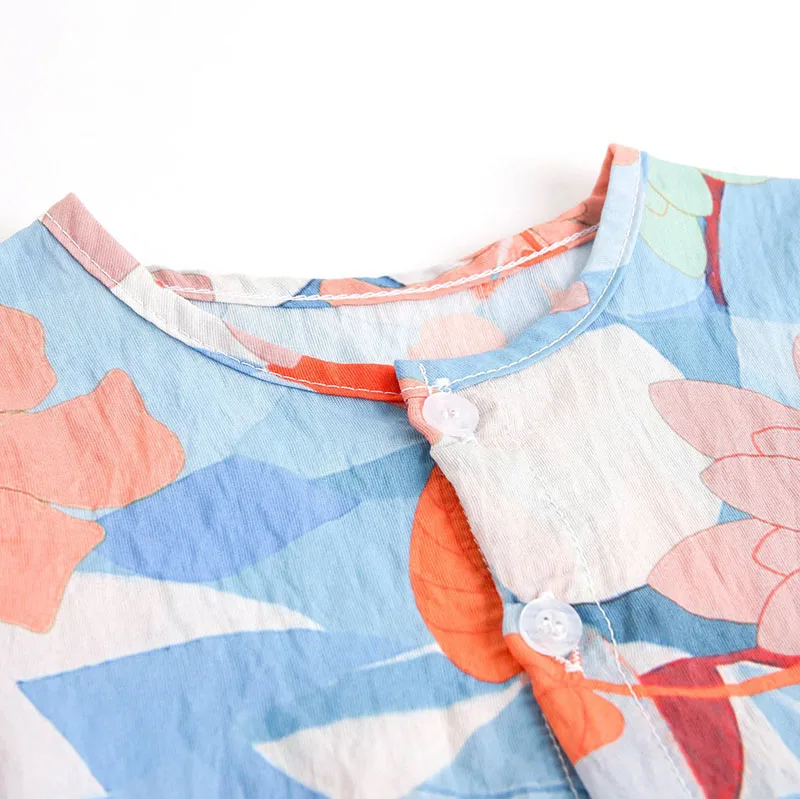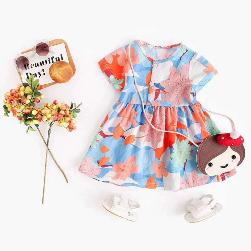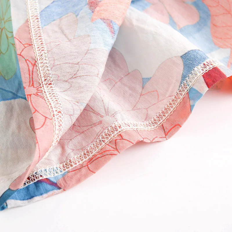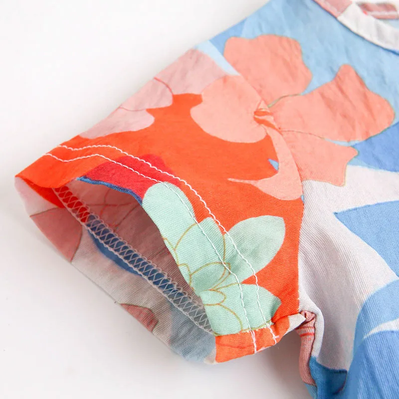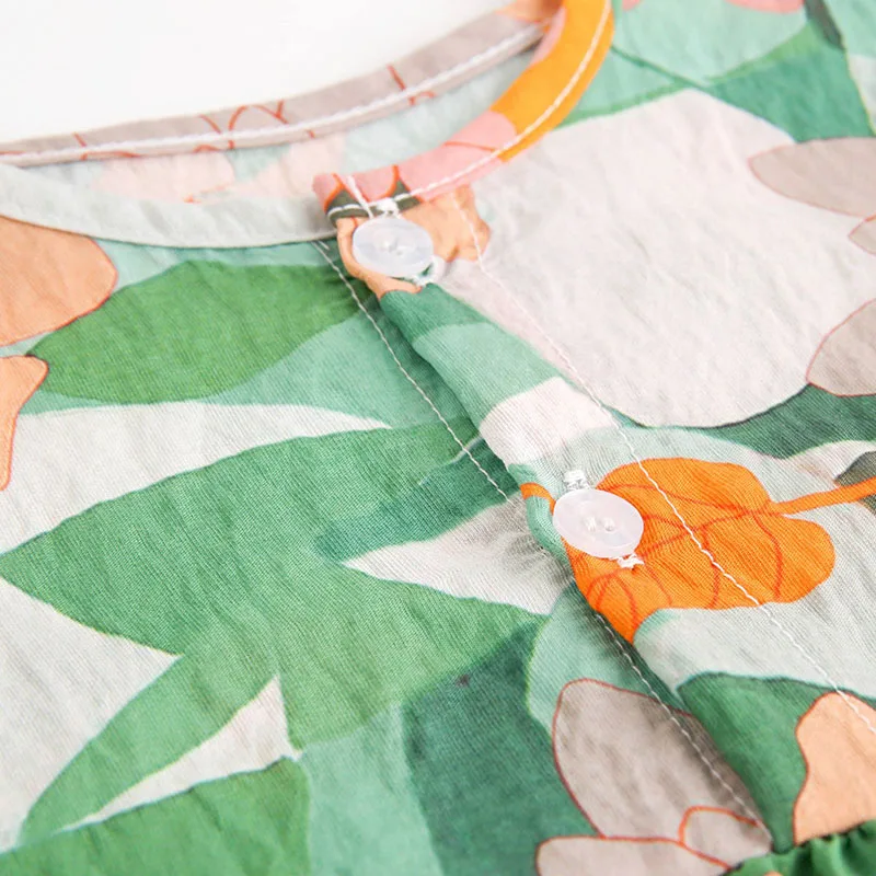 1.**Estampados florales vibrantes**:Estos vestidos de verano para niños de 1 a 5 años, presentan animados patrones florales.Las coloridas flores en tonos de rosa, naranja y verde sobre fondos claros crean una apariencia alegre y llamativa, perfecta para la temporada de verano.