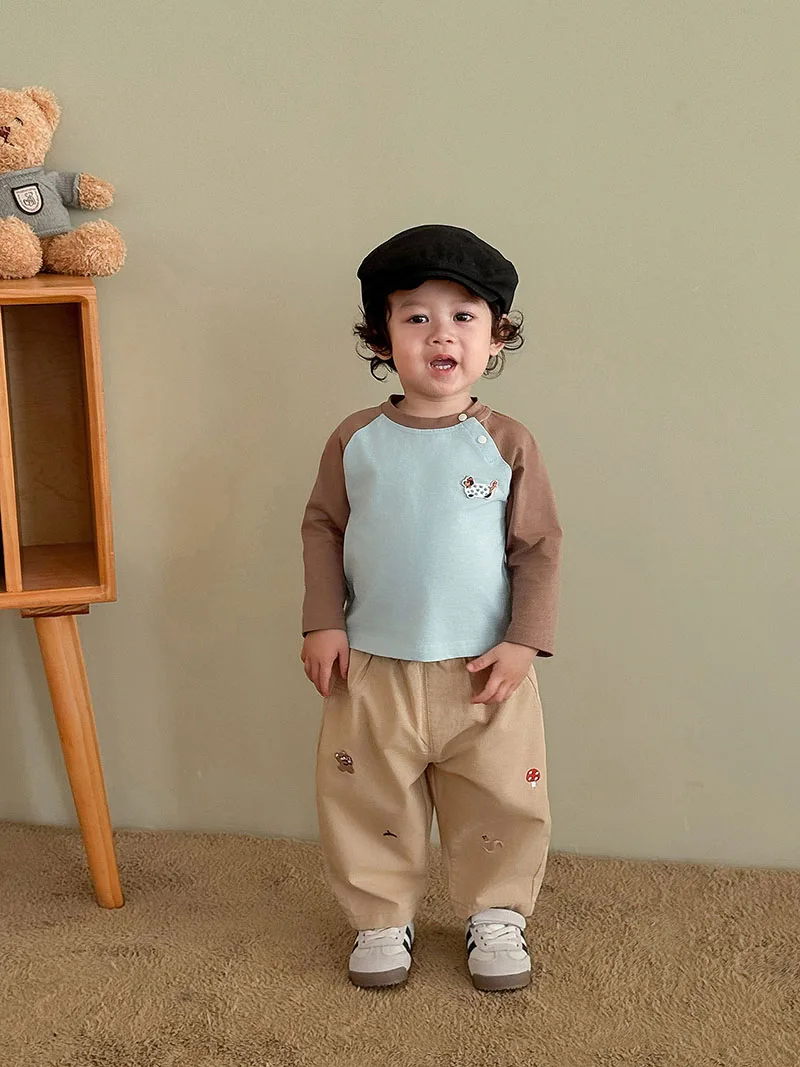 El bordado de múltiples elementos (oso, hongo, ardilla) crea un encanto divertido inspirado en la naturaleza, alineando con los "patios detalles naturales" de moda infantil.