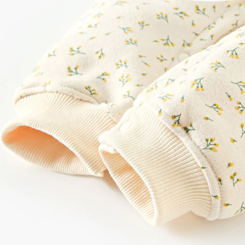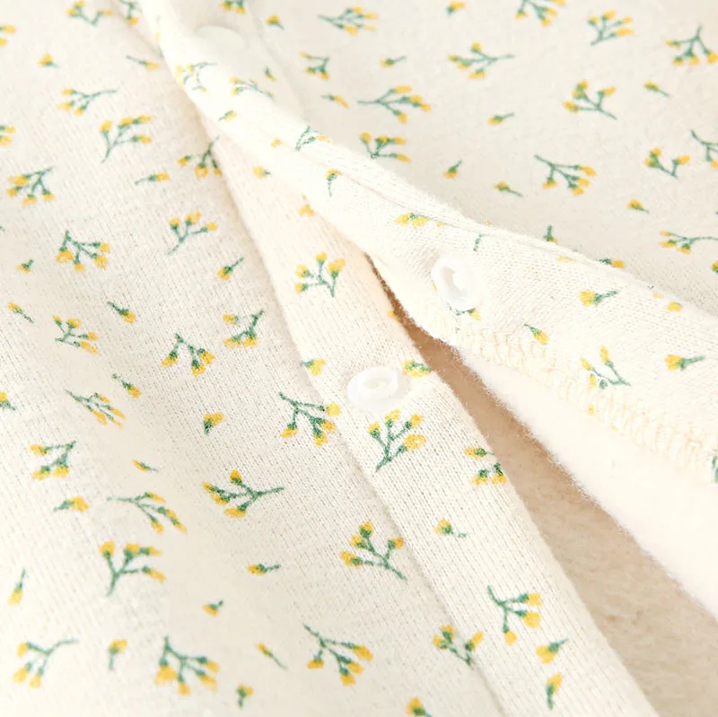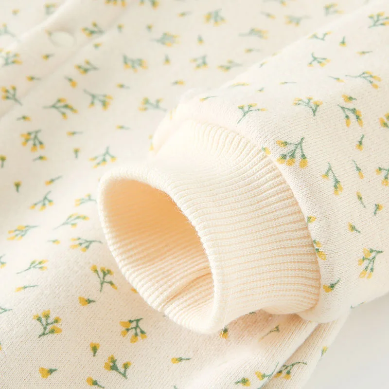 1.**Encantador estampado floral vintage**: Presenta un delicado patrón floral pequeño de estilo vintage, que agrega un toque de encanto clásico al atuendo del bebé.