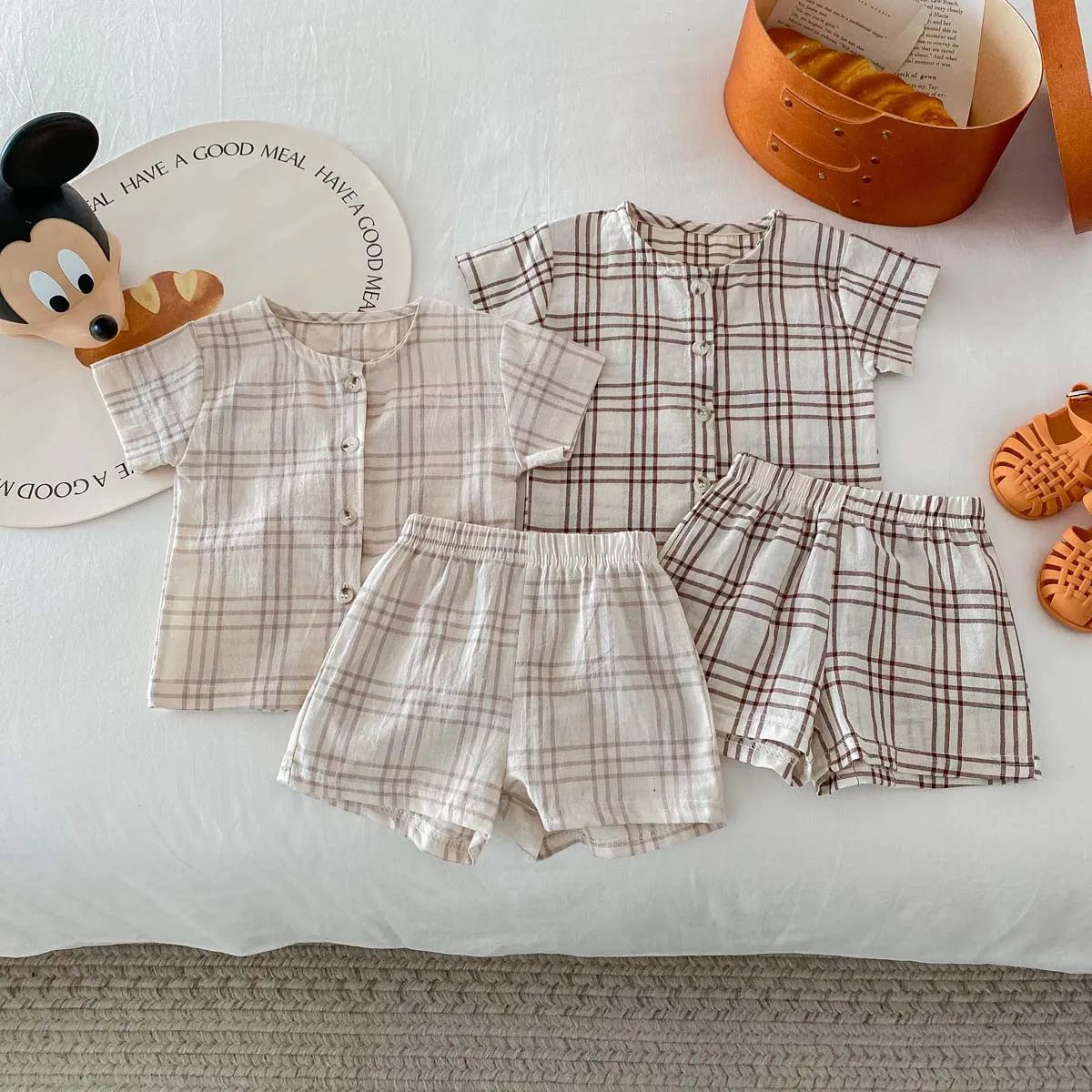 Comprar MILANCEL-ropa de verano para bebés, conjunto de 2 piezas a cuadros, camiseta de un solo pecho y pantalones cortos, chándal para niños