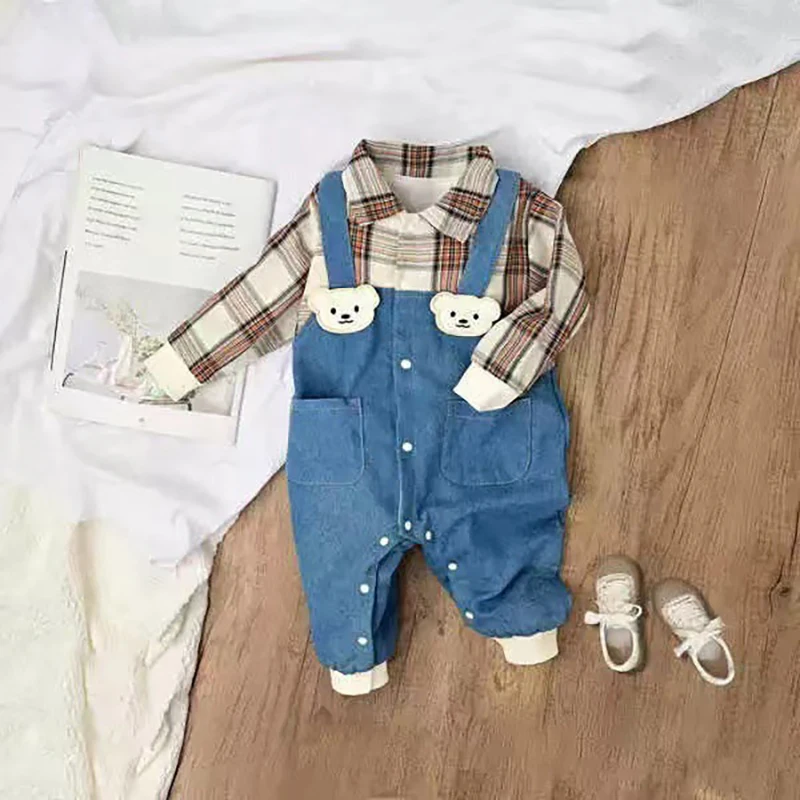 Comprar Milangel-ropa de bebé para niños, Pelele de tela vaquera con tirantes de 2 piezas, cuello vuelto, Patchwork a cuadros, mono de doble capa
