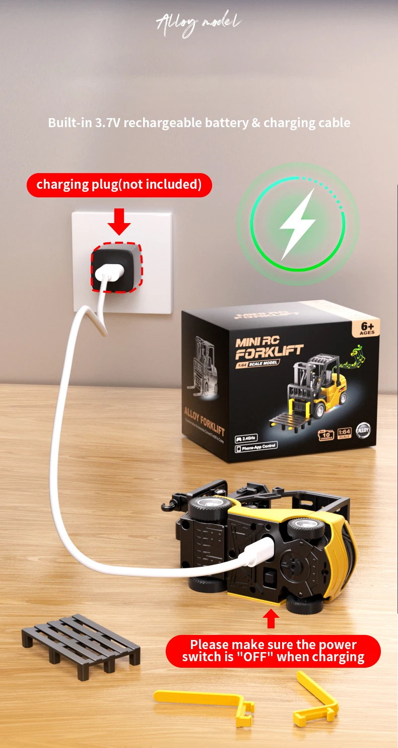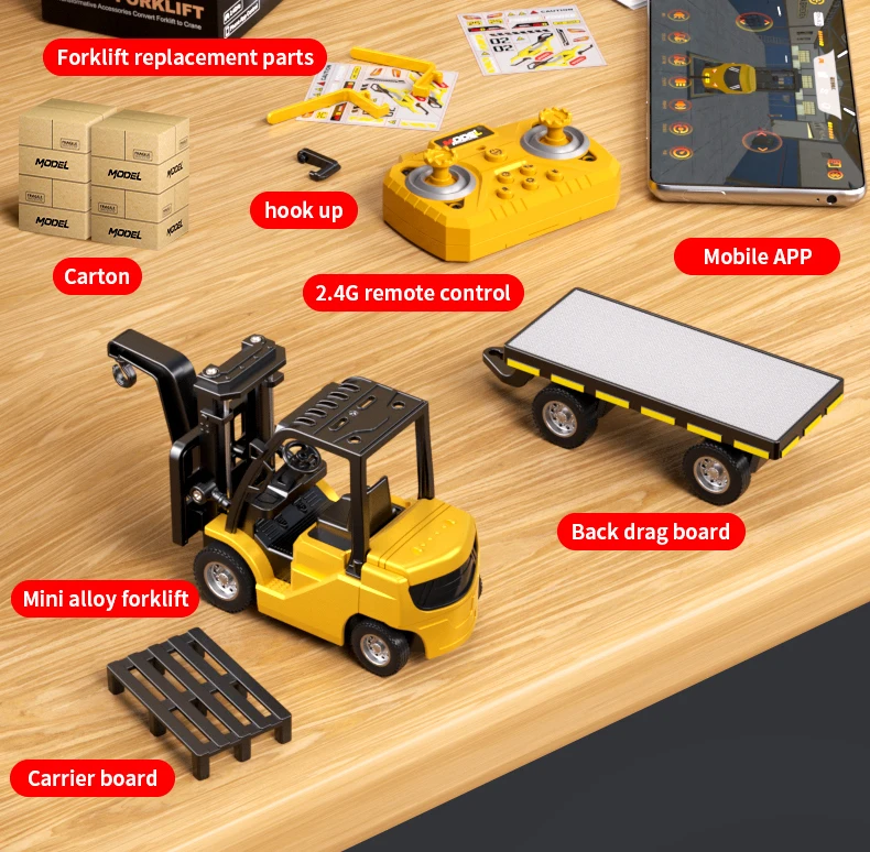 Coche*1, tablero de arrastre trasero*1, instrucciones*1, pegatinas*1, cable de carga*1, Tenedor*2,Tablero portador* 1, Control remoto*1, Accesorios para grúas*1, Bolsa de accesorios*1,