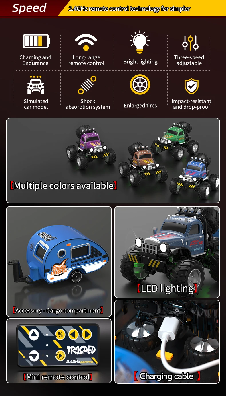Adelante y atrás, dirección izquierda y derecha, con luces, ajuste manual neutro, transmisión electrónica de tres velocidades, demostración automática, control de crucero, módulo de control dual (control remoto más APP)
