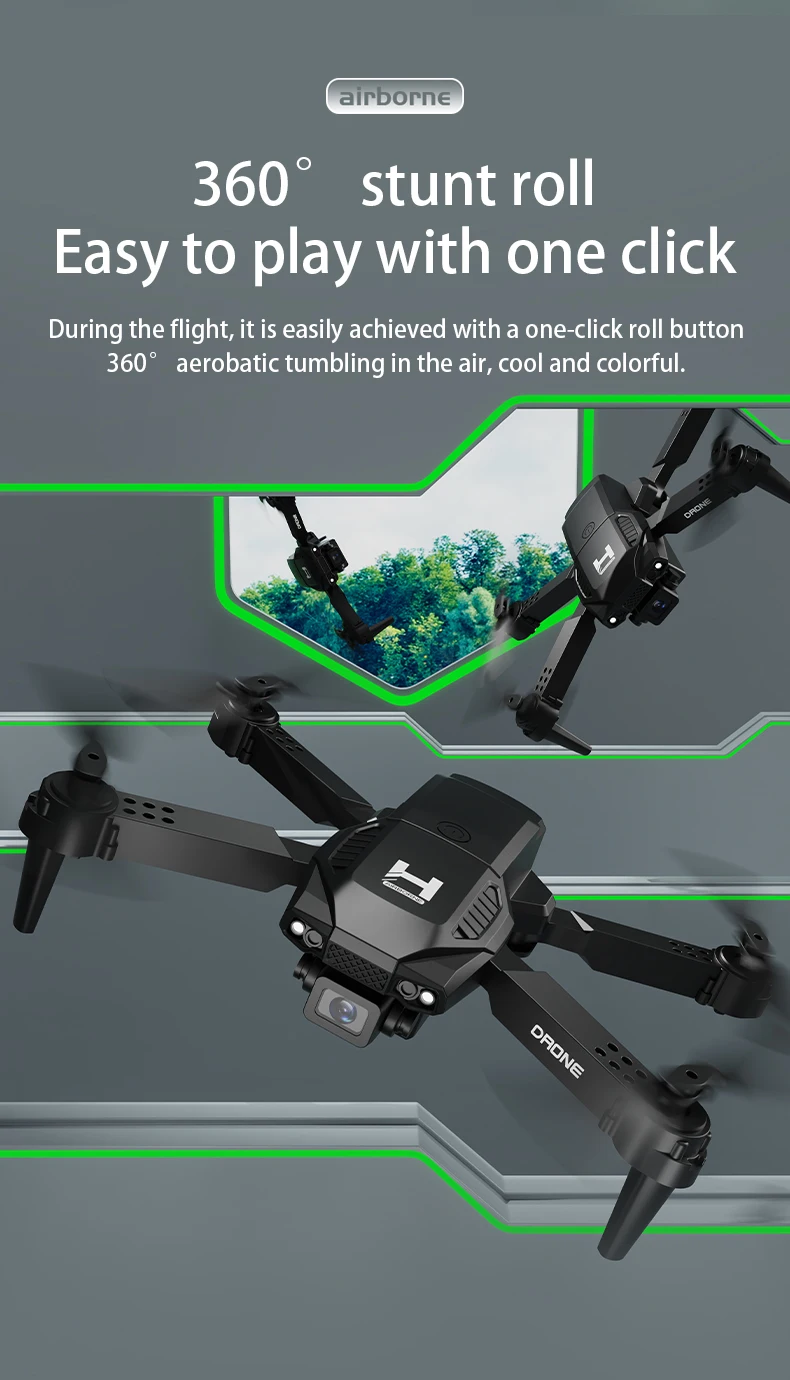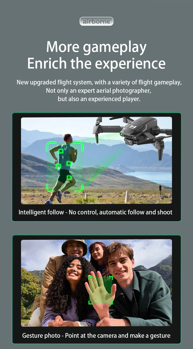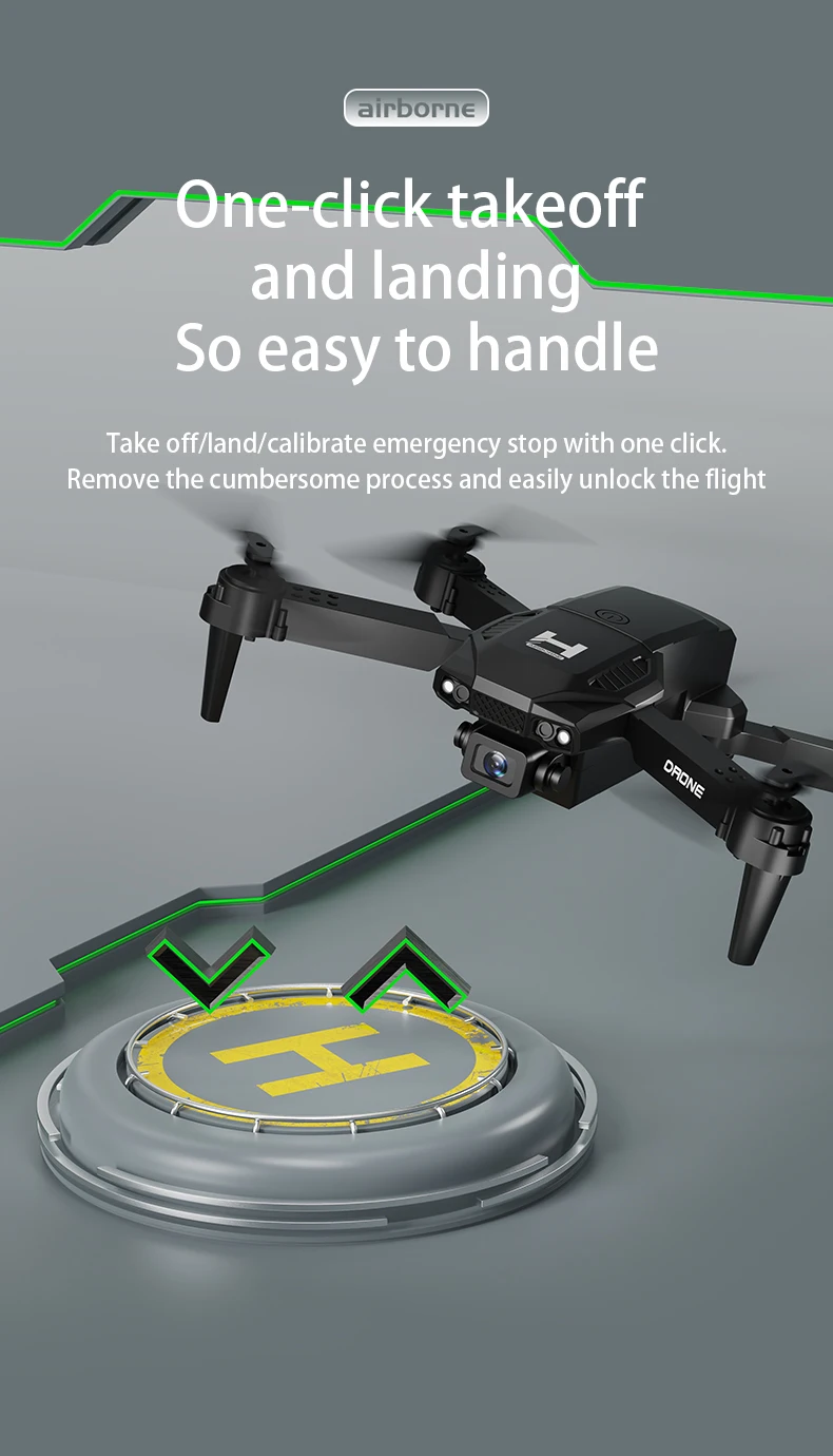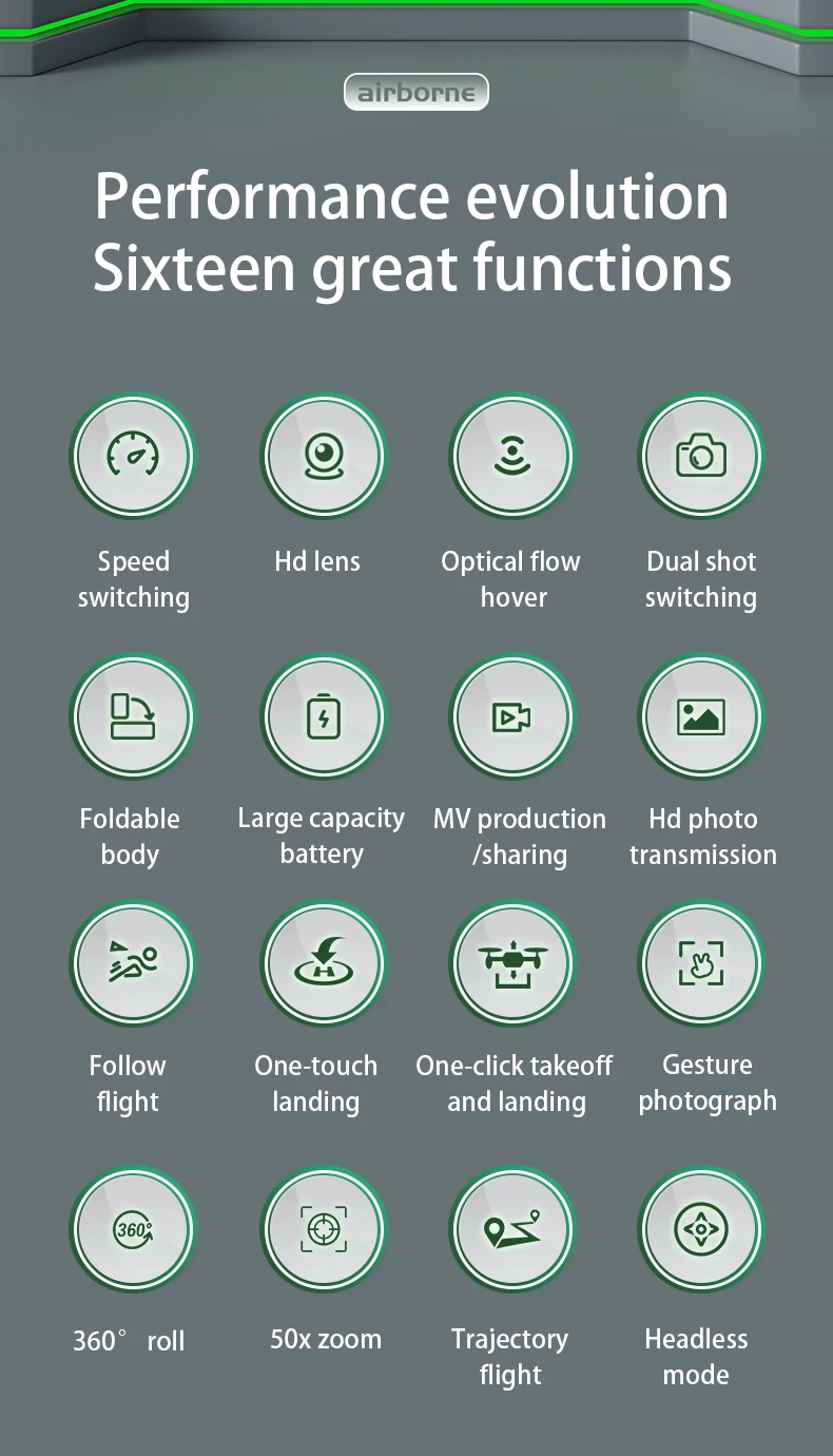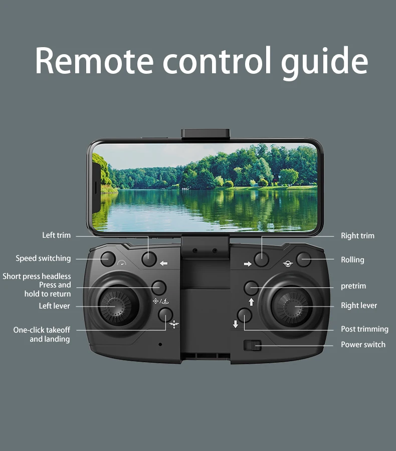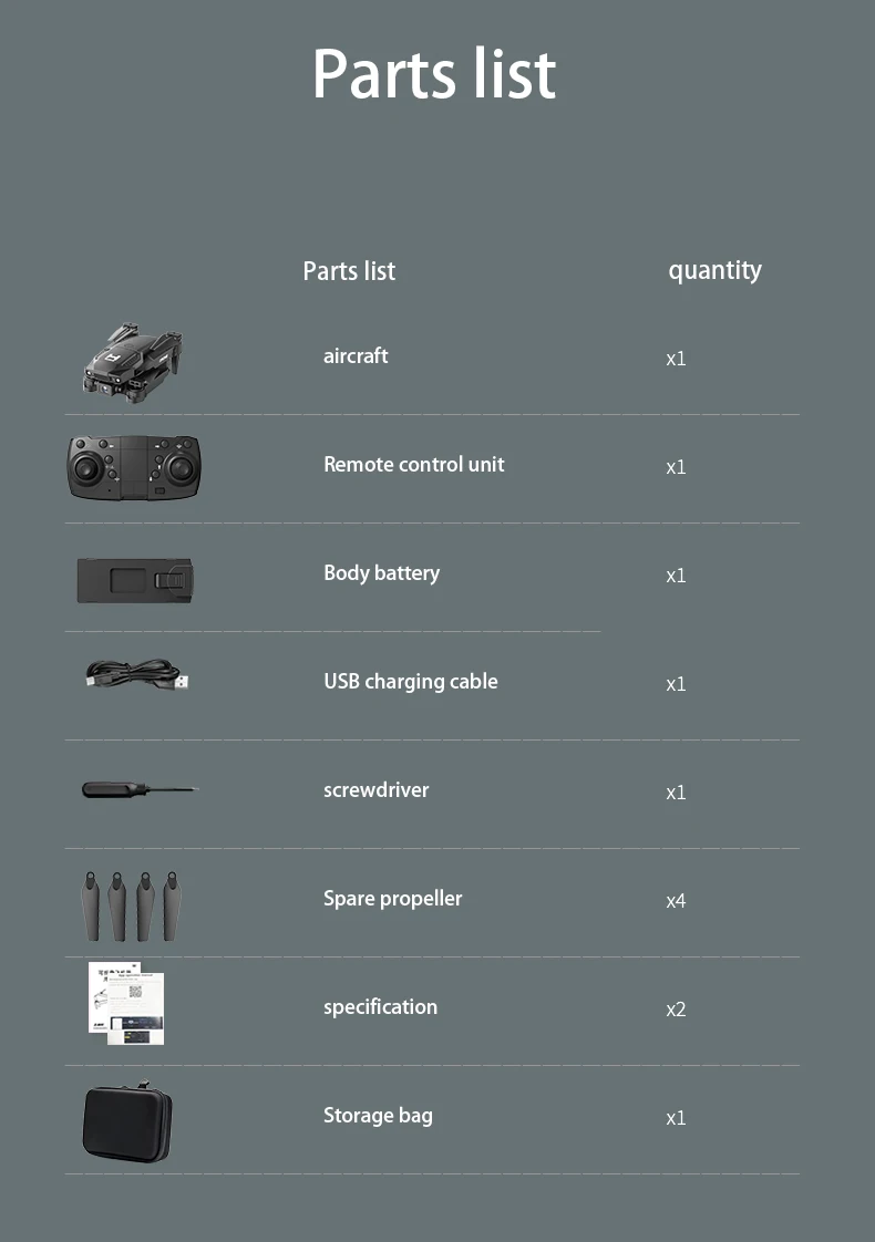 Una Tecla de despegue/una tecla de aterrizaje/subida/bajada/Izquierda/giro a la derecha/adelante/atrás/vuelo a la izquierda/vuelo a la derecha/seguimiento inteligente/altura de presión de aire/balanceo/modo sin cabeza/rápido/lento/foto/Video/cámara dual/cara/Reconocimiento de gestos foto automática/detección de gravedad/vuelo de trayectoria/Lista de embalaje