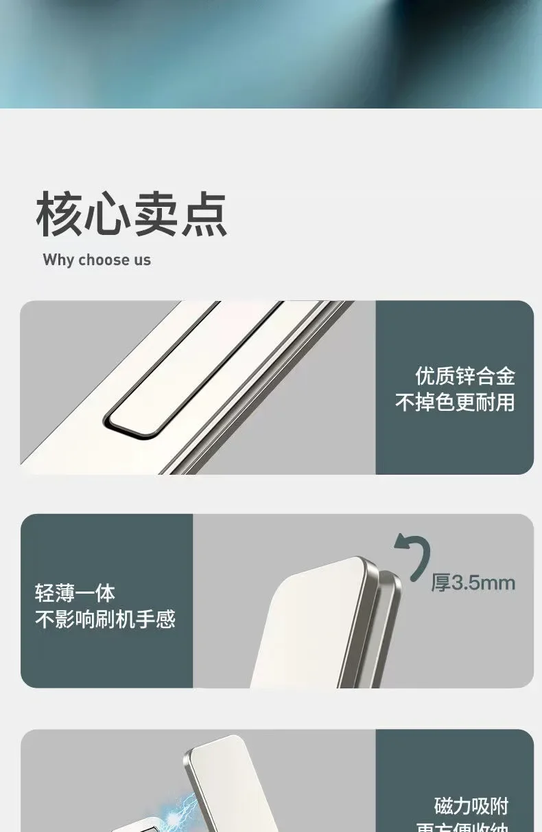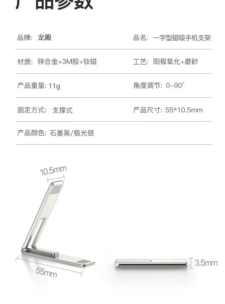 Descripciones de artículos: Nombre del artículo: soporte para teléfono móvil Material: aleación de zinc + imán Tamaño: 55 mm * 10,5 mm * 3,5 mm Rango de ángulo de ajuste: 0 ° ~90 °
