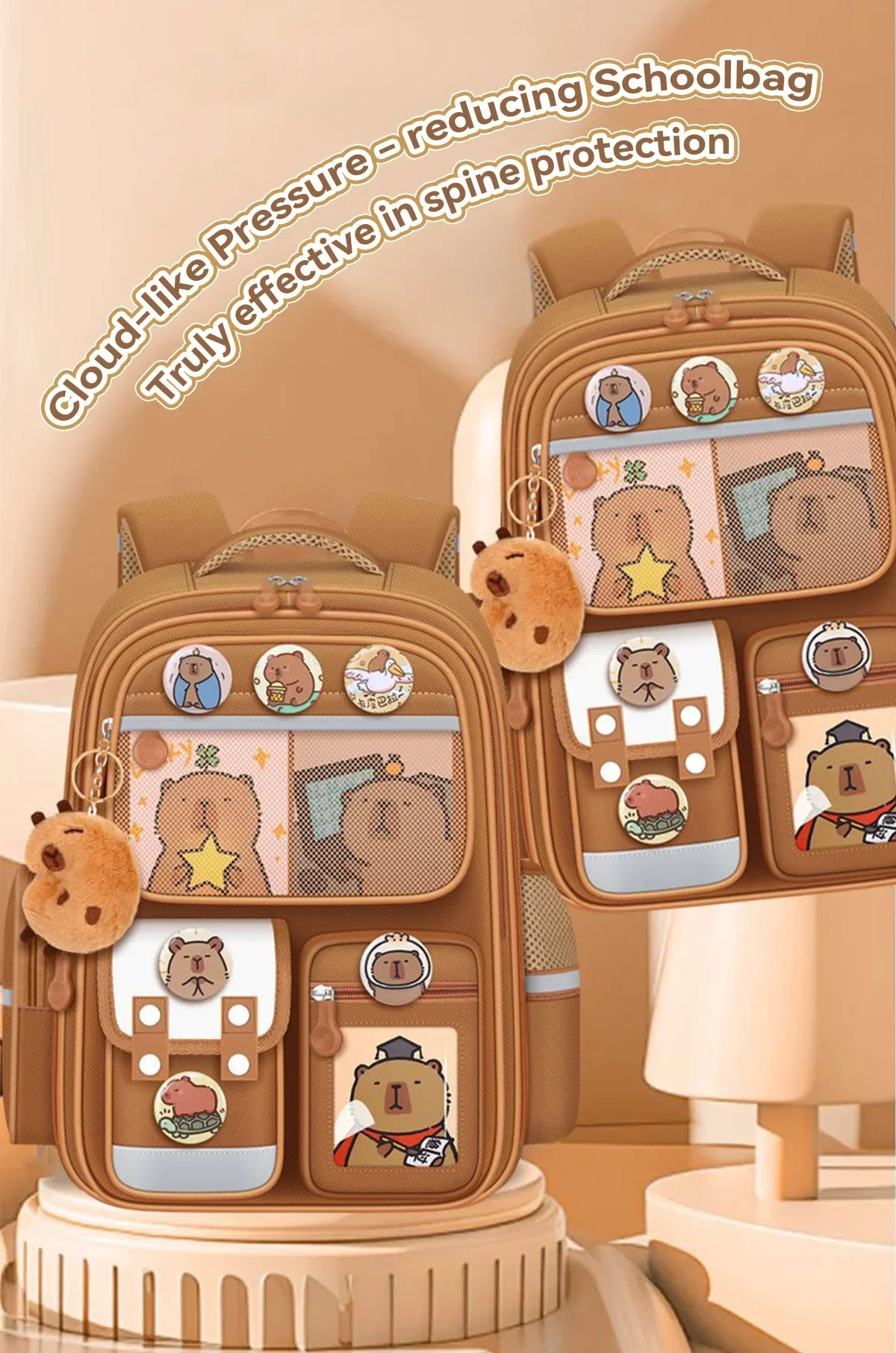 5.Juego completo de accesorios: este juego de mochila incluye una mochila con temática de capibara, 3 tarjetas, 6 insignias y 1 muñeco de peluche, lo que la convierte en una opción divertida y práctica para los estudiantes que desean mostrar su estilo y personalidad únicos.